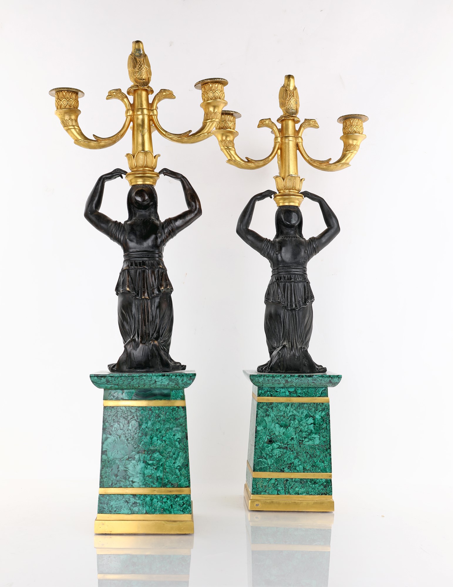 Coppia di candelabri in bronzo brunito e dorato, XIX secolo a tre luci sorrette da figure muliebri inginocchiate su alti piedistalli lastronati in malachite rifiniti da applicazioni dorate altezza cm 55
