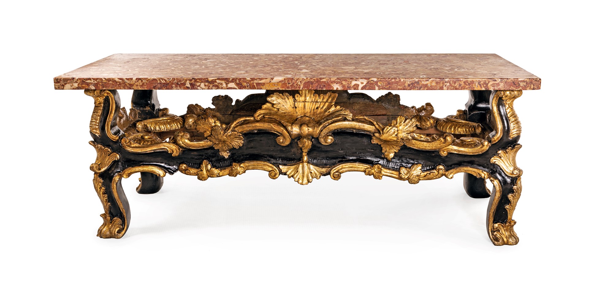 Tavolino da salotto in legno intagliato, laccato e dorato con piano in marmo costituito da un'antica fioriera rettangolare laccata nera e dorata lungo i profili ed i rilievi ornamentali, caratterizzata da montanti angolari sagomati su cui posa il piano cm 48x130x55