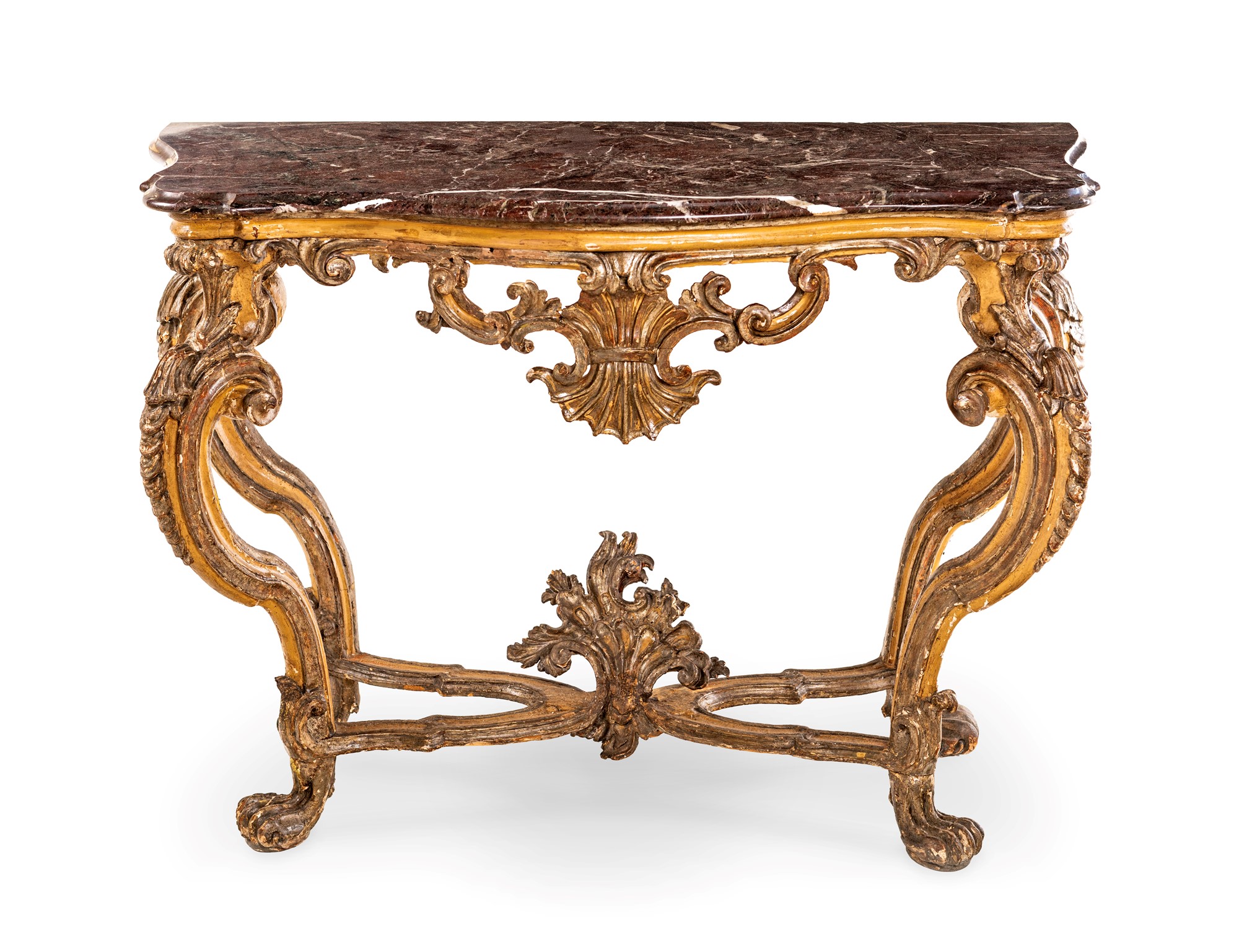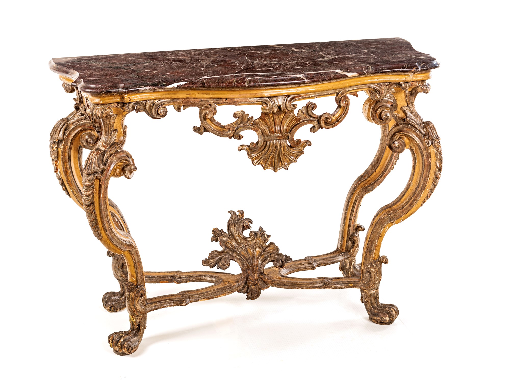 Console Luigi XV in legno laccato e dorato a mecca piano sagomato in marmo rosso, fascia centrata da un motivo vegetale intagliato; gambe mosse decorate da fiori, riunite da traversa a crociera dominanata da un ciuffo; brevi cascatelle discendono dall'attaccatura delle gambe, piedi ferini