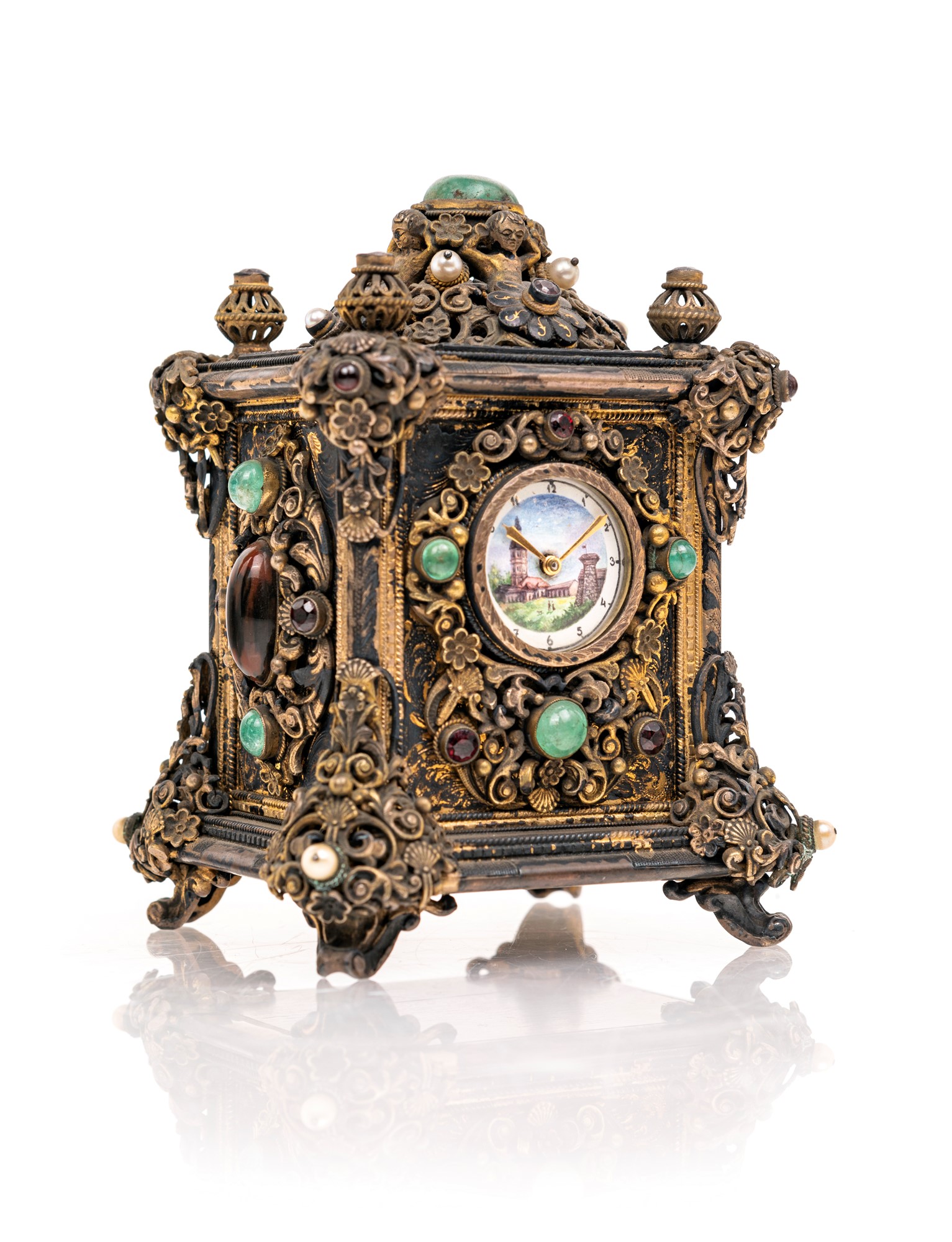 Cappuccina in metallo dorato con gemme verdi e perline cassa squadrata arricchita da rilievi naturalistici impreziositi da perline e gemme verdi e rosse multiformi, cabochon e sfaccettate; piccolo quadrante circolare in smalto decorato da un paesaggio racchiuso da anello bianco con indici arabi cm 12x9x8