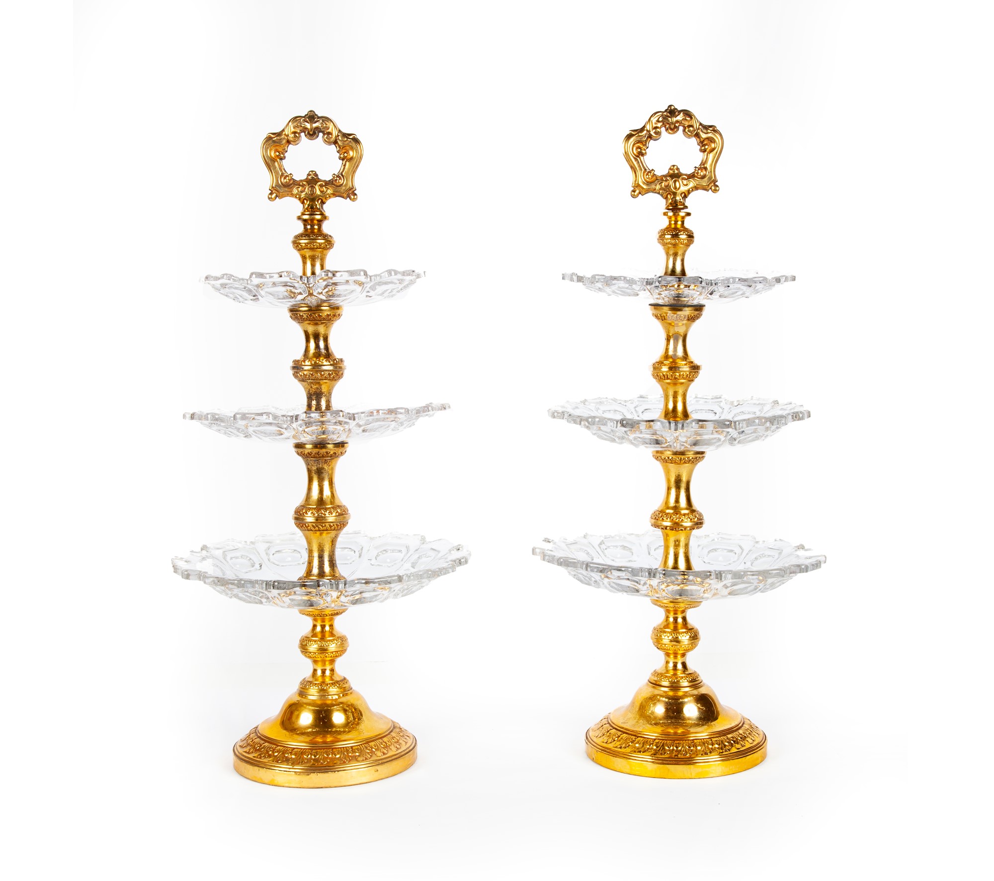 Coppia di alzate centrotavola in metallo sbalzato e dorato con tre ripiani in cristallo