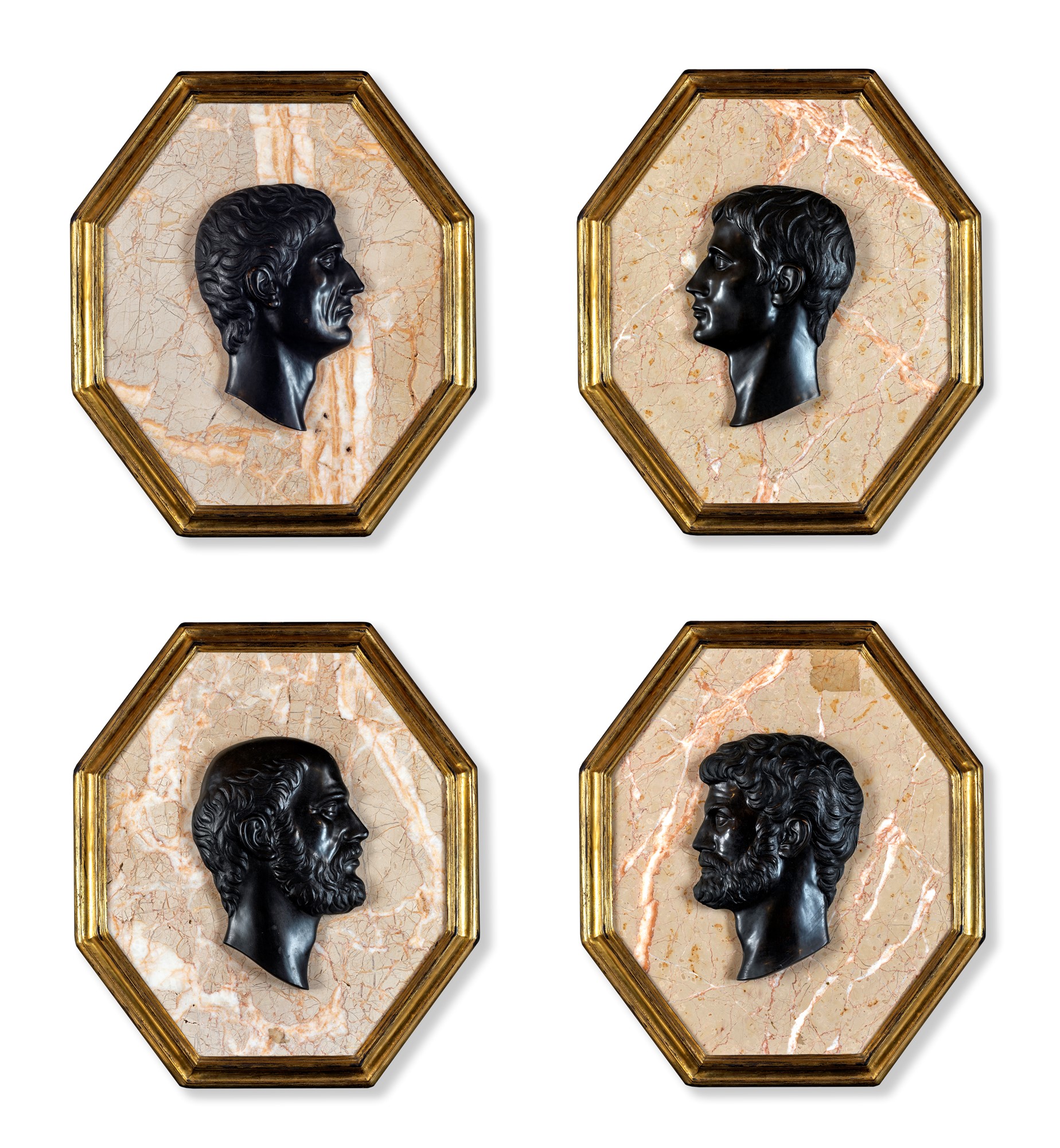 Quattro grandi medaglioni in marmo e bronzo , XIX secolo con profili bruniti di imperatori romani desunti dal repertorio classico, su placche ottagonali in marmo; cornici modanate in bronzo dorato. cm 68x58