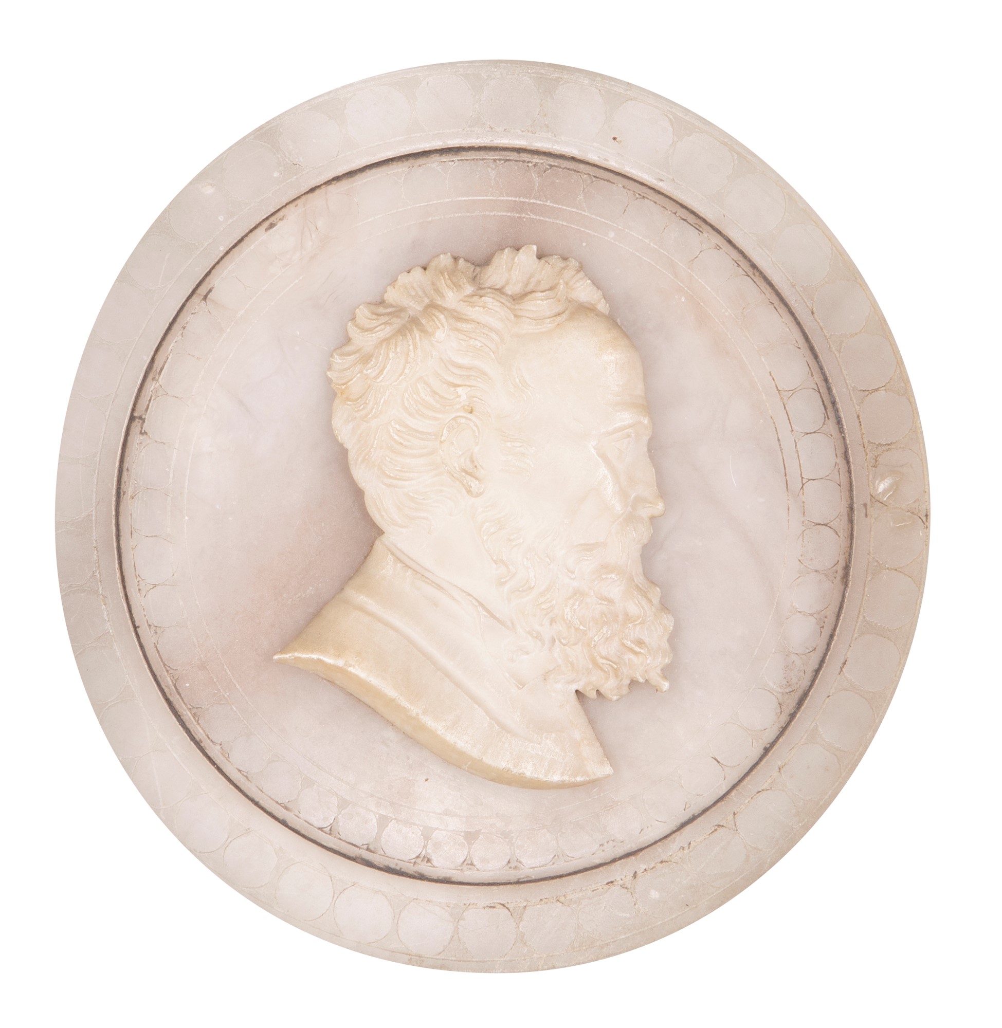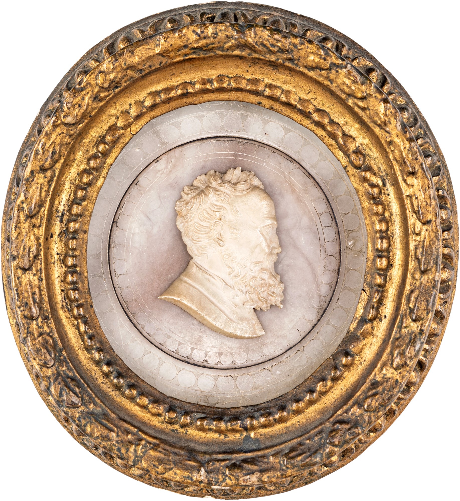 Ritratto di Michelangelo, XVIII secolo Il Divin Artista è raffigurato di profilo, col volto rivolto verso destra come nell'incisione a bulino di Giulio Bonasone; entro cornice modanata in legno dorato a tre ordini di intaglio cammeo in alabastro cm 16x14 - in cornice cm 24x22
