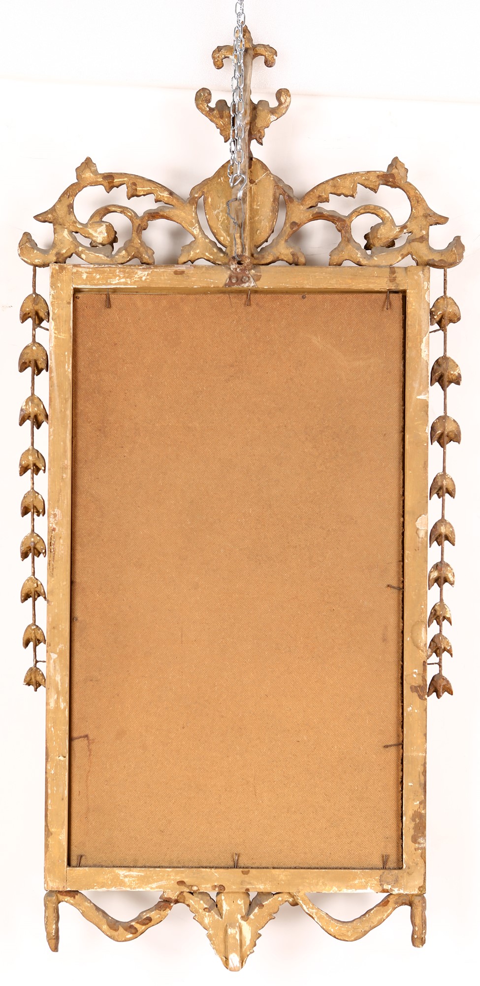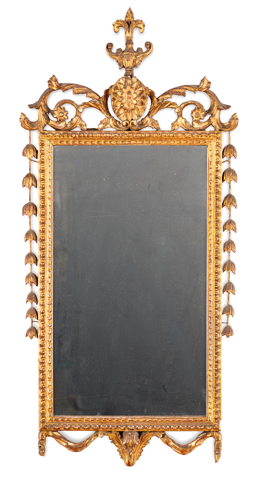 Specchiera in legno intagliato e dorato, XIX secolo cornice rettangolare a due ordini di intaglio, sormontata da un medaglione con corolla sormontata da un giglio, affiancata da volute vegetali da cui si dipartono cascatelle di campanule; profilo inferiore centrato da un cespo fogliaceo e un drappeggio le cui estremità fungono da sostegno