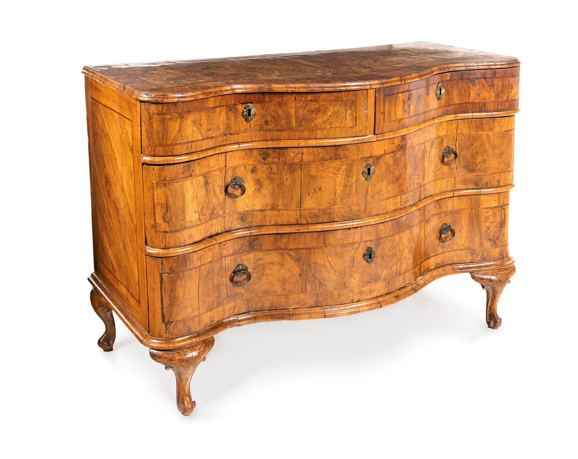 Cassettone in radica di noce, Ferrara XVIII secolo con facciata curvilinea suddivisa in due cassetti allineati e due sottostanti in colonna separati da traverse; piedi sagomati cm 85x121x59