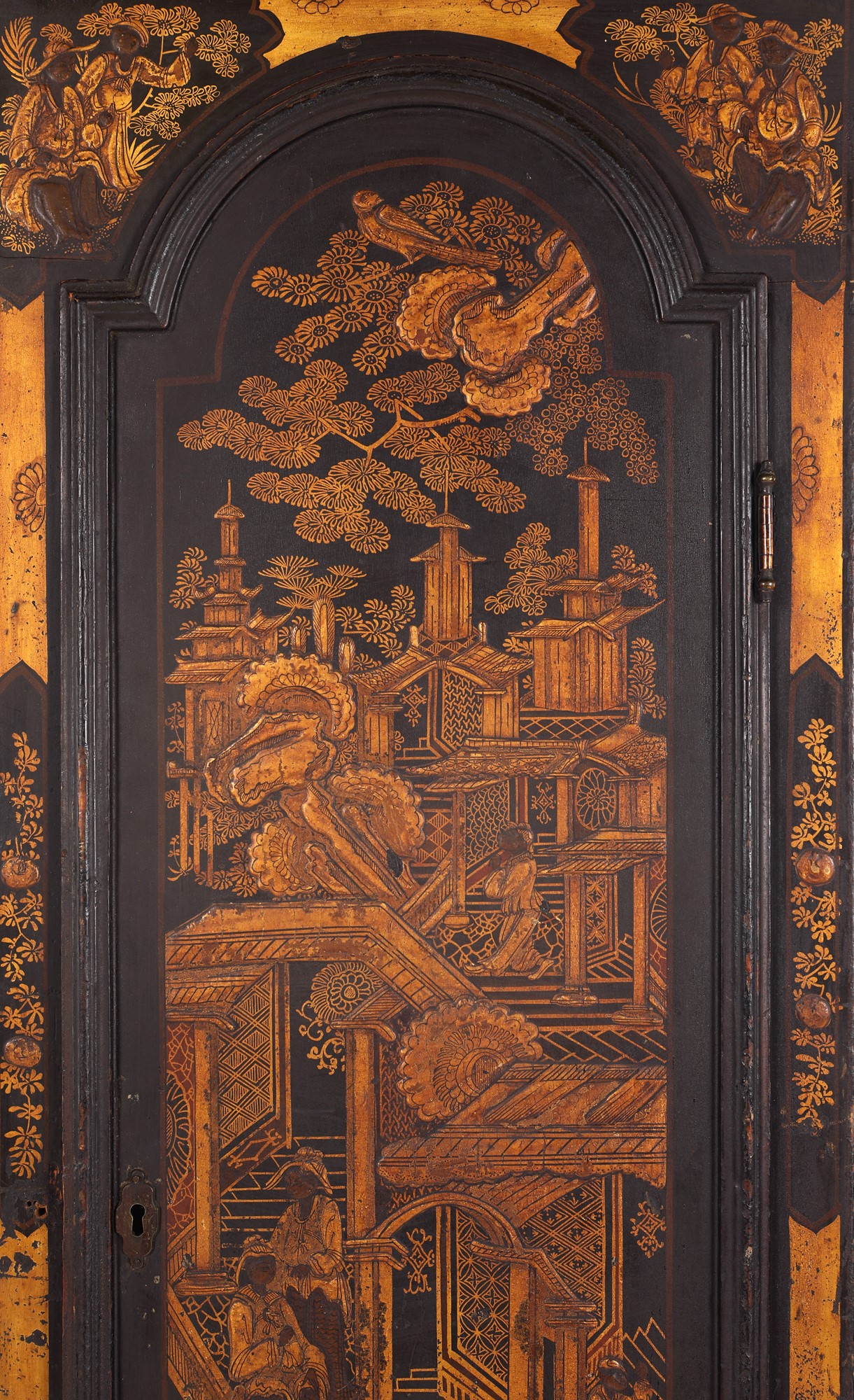 Orologio a torre in legno laccato nero decorato a chinoiséries dorate, Inghilterra, fine del XVIII secolo