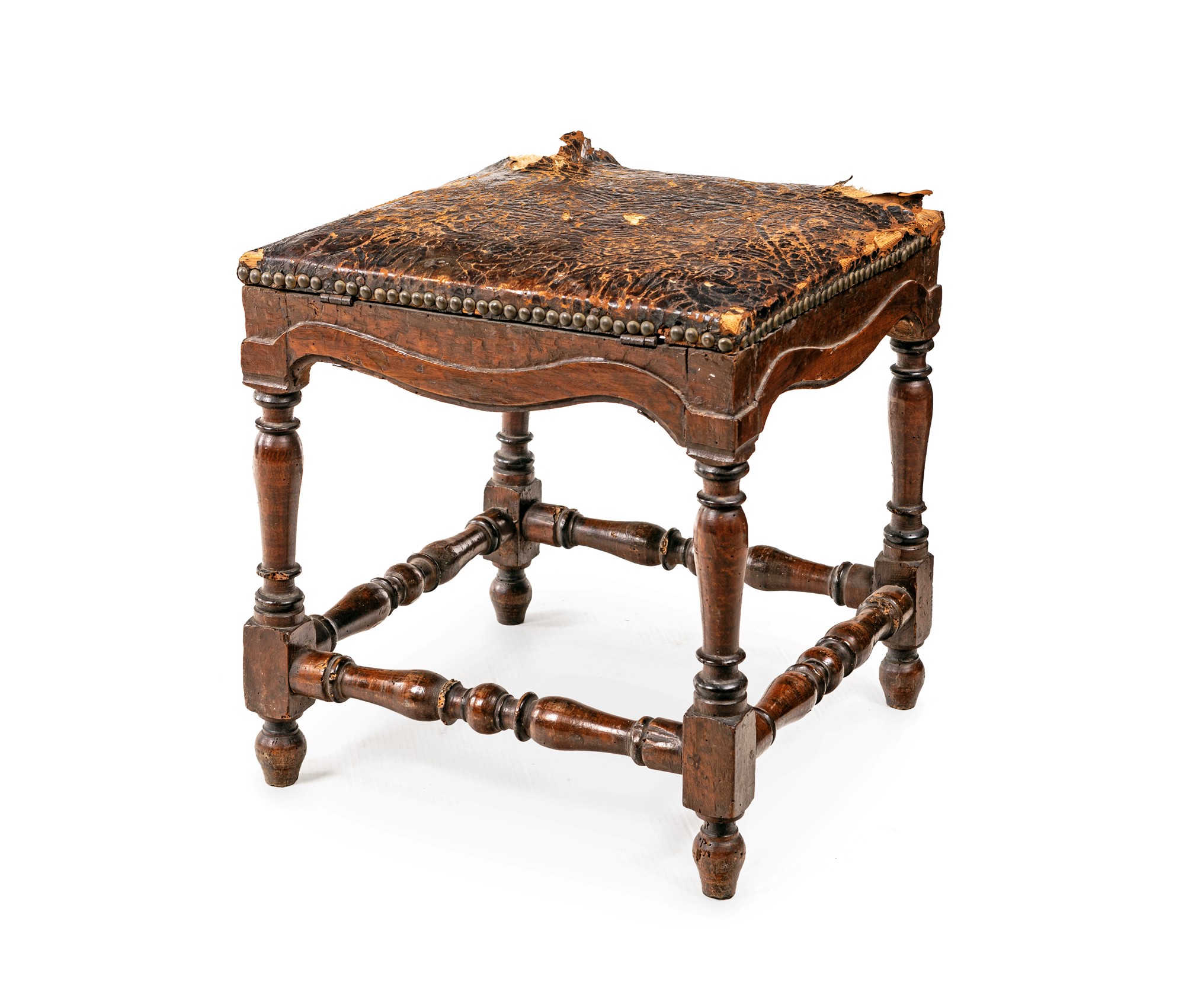 Sgabello in noce, XVII secolo con sedile imbottito rivestito in cuoio, gambe a balaustro unite da traverse tornite cm 49x45x44