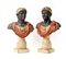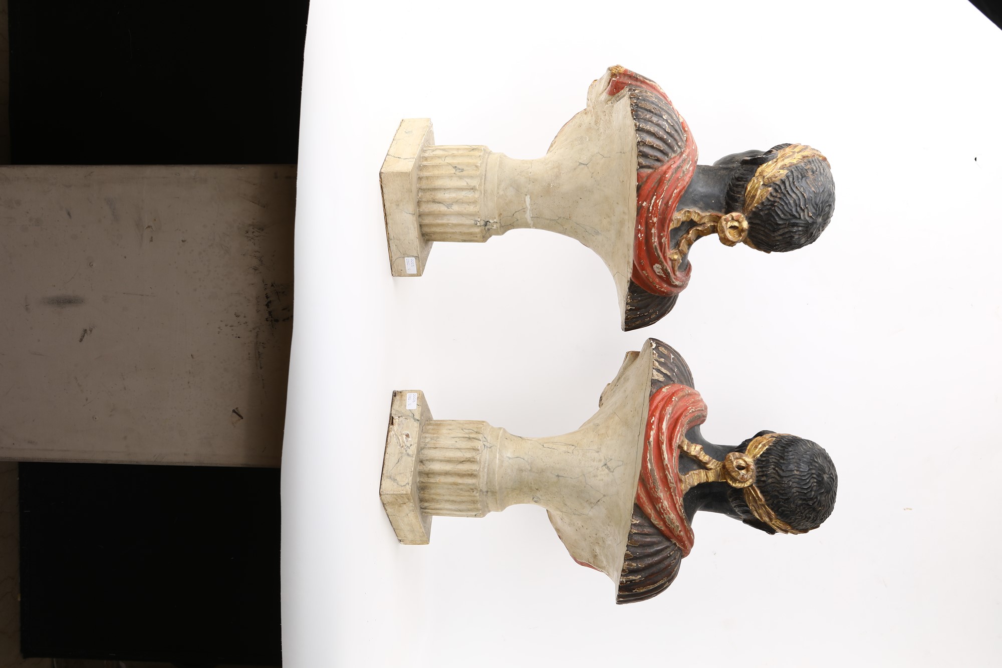 Due busti in legno policromo e dorato XIX secolo raffiguranti imperatori romani con volti neri, corazza e corona dorate, toga rossa; piedistallo a rocchio di colonna scanalato decorato ad imitazione del marmo cm 64x41x23 ca.