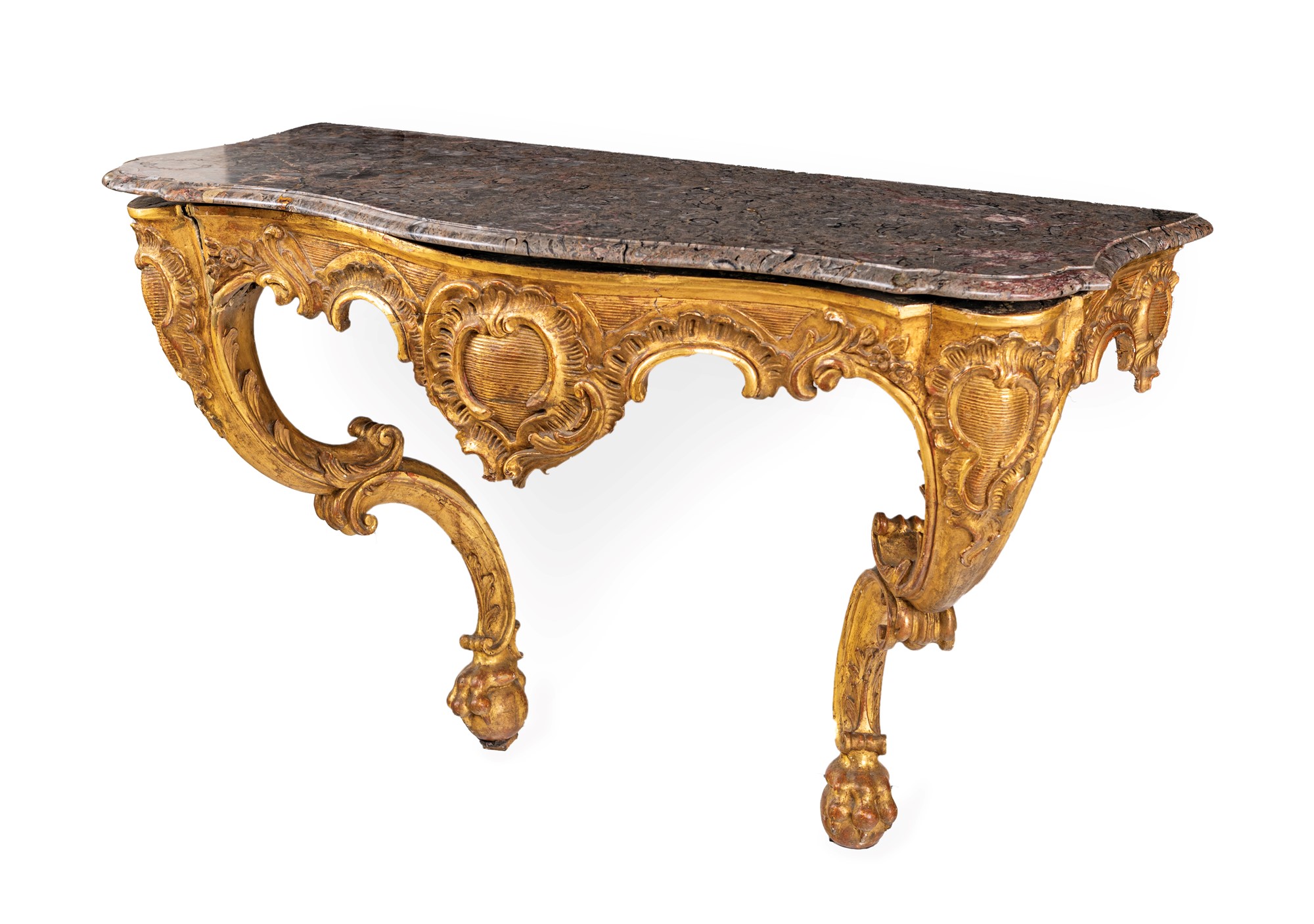 Console d'applique in legno intagliato e dorato, XVIII secolo con piano sagomato in marmo, fascia caratterizzata da cartigli e due montanti mossi poggianti su sfere trattenute idealmente da zampe ferine cm 75x115x57