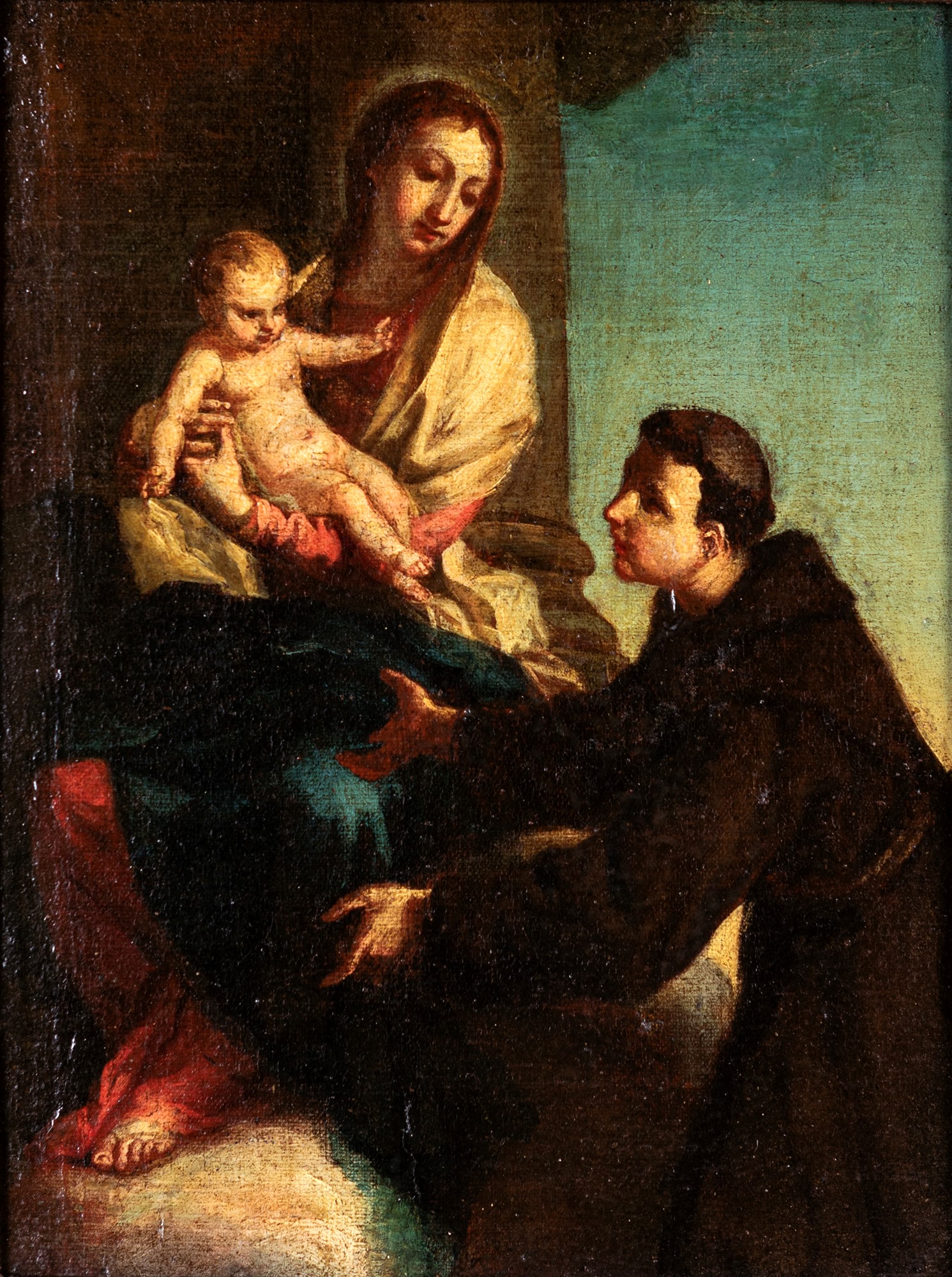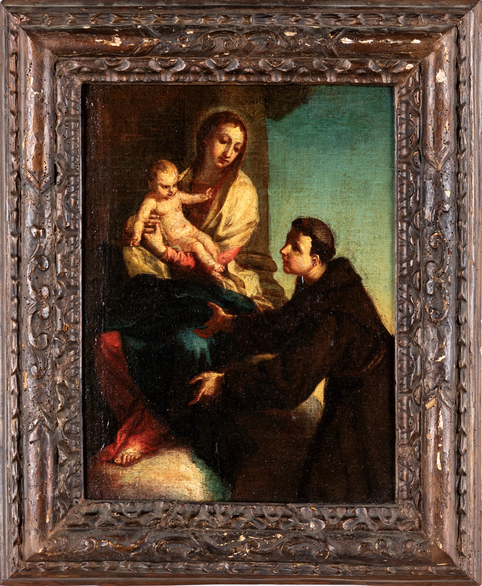Andrea Sacchi (bottega di) Nettuno 1599-Roma 1661 Madonna col Bambino e Sant'Antonio Nella nostra tale una Madonna, elegantemente abbigliata con un manto avorio e una vesta rossa e blu, regge tra la sue braccia un vivace Gesù bambino, di fronte a una colonna romana. Entrambi i personaggi intrattengono un muto dialogo con Sant'Antonio che si staglia su di un cielo terso. La compostezza dei personaggi, la pacatezza delle loro espressioni, il calibrato uso di tonalità chiare uniti al rigoroso rispetto delle proporzioni anatomiche rimandano ad un pittore romano di formazione classicista orbitante nella bottega di Andrea Sacchi nella seconda metà del XVI secolo. olio su tela cm 43x34 - in cornice 59x49