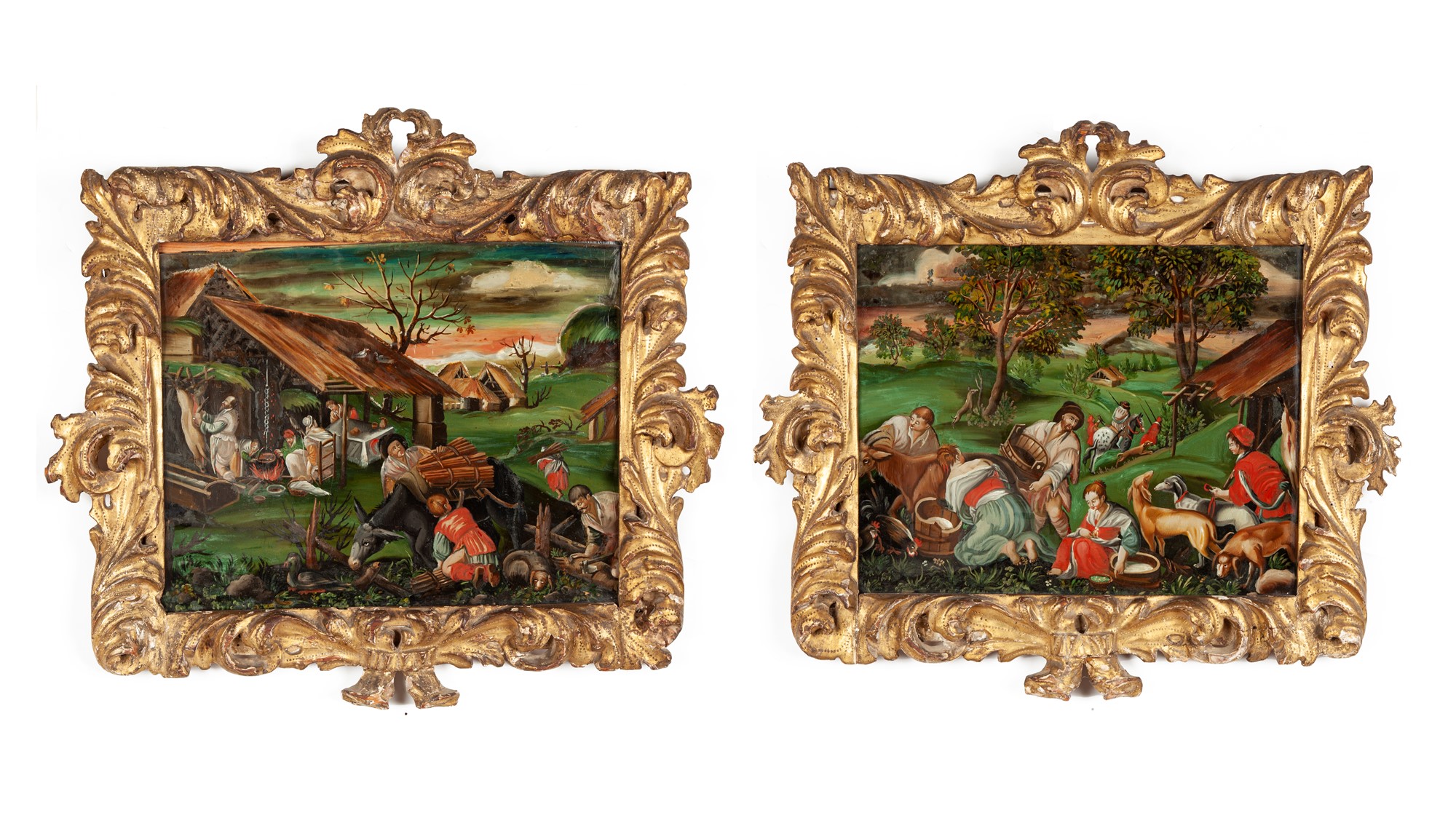 Francesco dal Ponte detto Bassano (cerchia di) Bassano del Grappa 1549-Venezia 1542 Le stagioni, Primavera e Autunno Cornici coeve in legno intagliato e dorato. In questa elegante coppia di olii su vetro, supporto assai pregiato e raro, sono raffigurati una serie di personaggi che conducono placidamente dei mestieri umili in due vallate verdi sotto un cielo cangiante. In un paesaggio la natura appare rigogliosa: gli alberi hanno delle chiome verdi e sono cariche di foglie mentre il terreno brulica di fiori appena sbocciati; nell’altro paesaggio invece le fronde degli alberi sono dipinte spogli, e i personaggi lavorano alacremente per mettere da parte la legna per affrontare il freddo inverno. Tutto ciò ci induce a pensare che la coppia non rappresenti altro che una allegoria della primavera e dell’autunno.