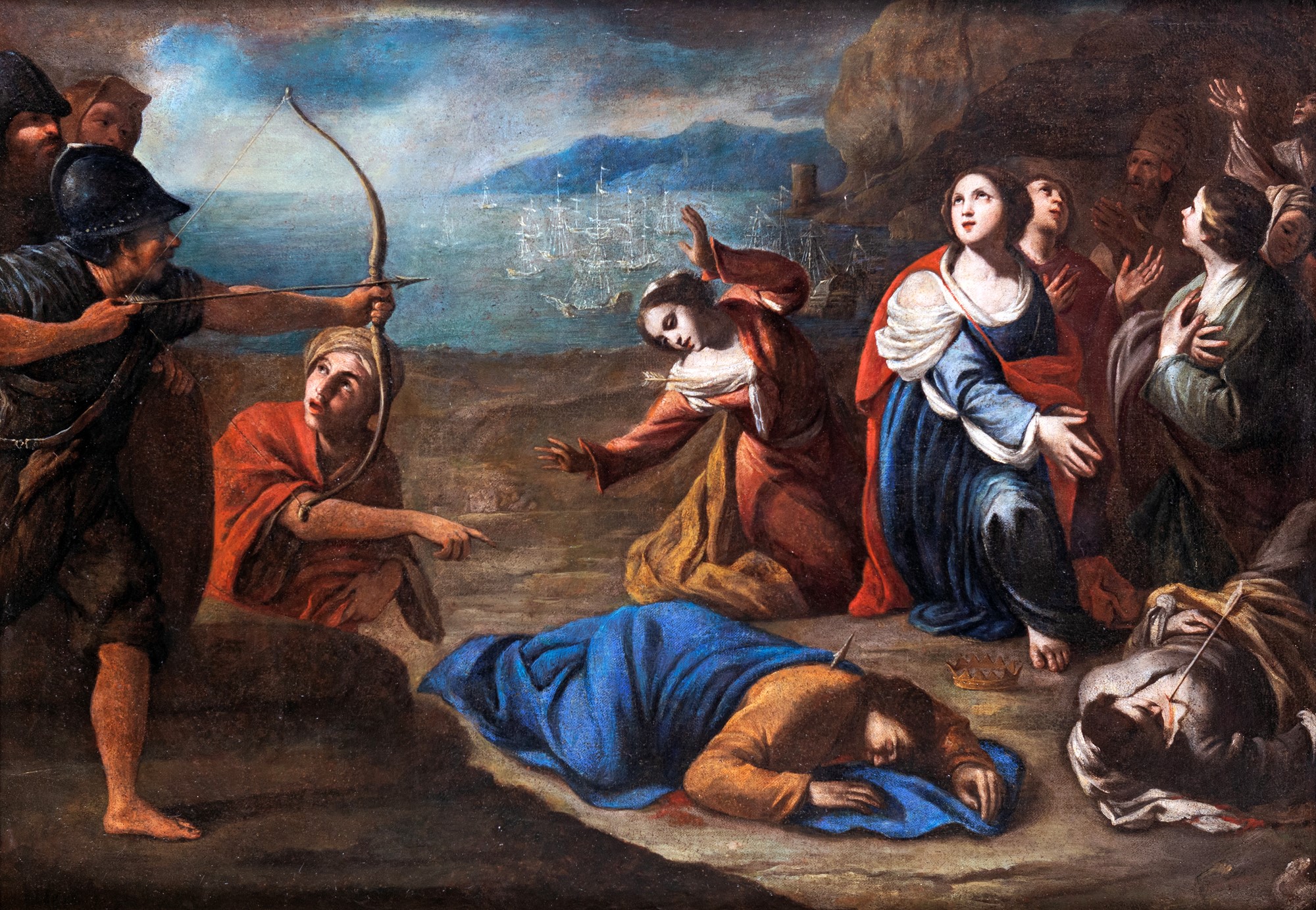 Massimo Stanzione Frottamaggiore 1585-Napoli 1656 Martirio di Sant'Orsola Autentica del Professor Pierluigi Leone de Castris olio su tela cm 98x140 - in cornice cm 123x163