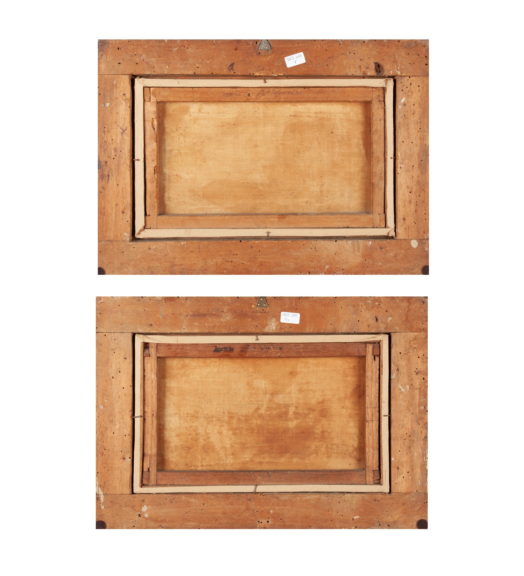 Scuola Fiamminga del XVII secolo 0-0 a) Paesaggio con San Giovanni Battista b) Paesaggio con accampamento militare coppia di olii su tela cm 19x33 - con cornice cm 35x48; cm 20x32 con cornice cm 33x48
