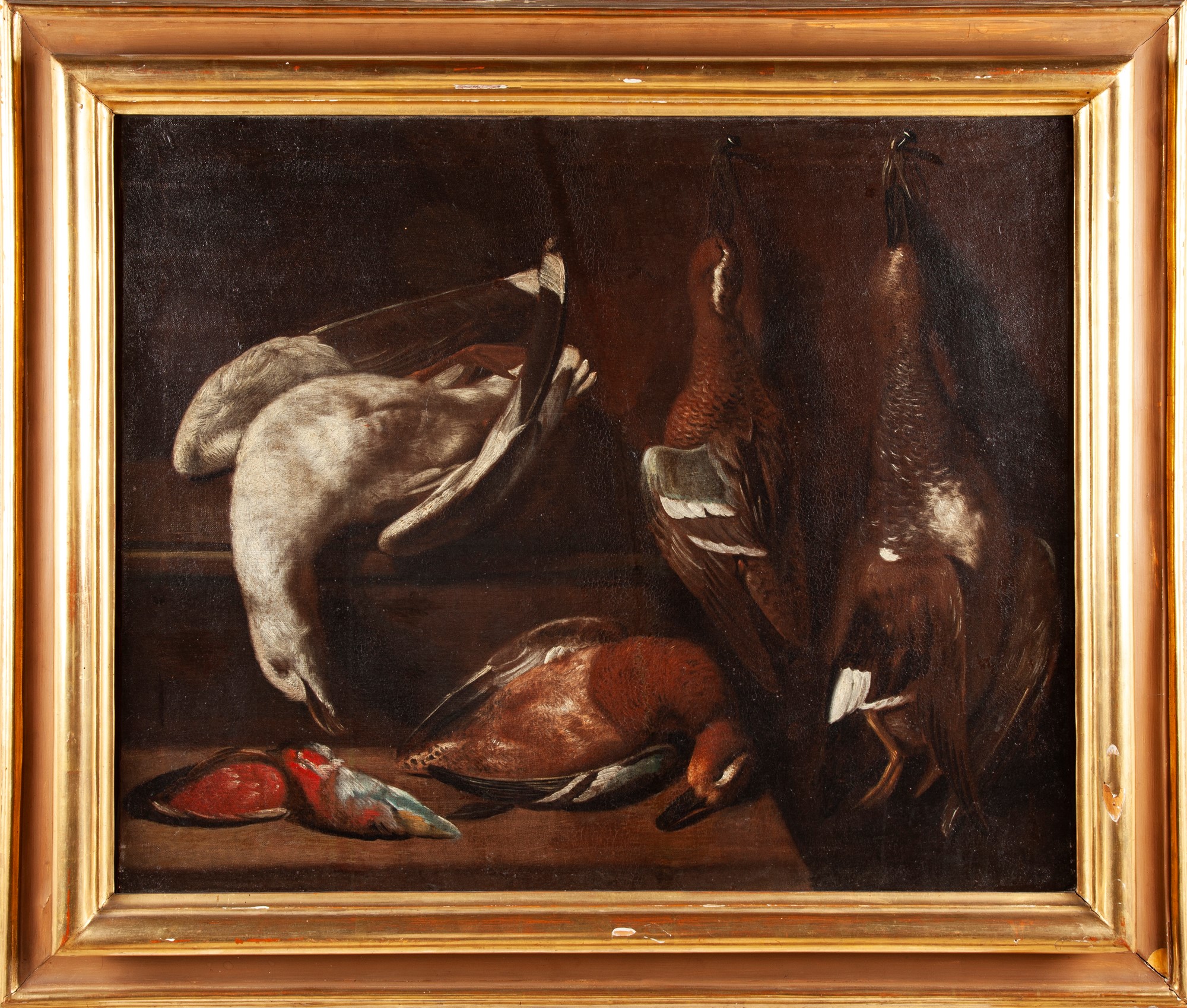 La nostra tela, che raffigura una serie di uccelli selvatici, è una prova della sua bravura nel genere. La matericità nella stesura del colore, corposo e ben definito, unita ad un’attenzione estrema al dato realistico, denunciano una vicinanza alla pittura di Giuseppe Maria Crespi e ci inducono a datare la tela ad una fase matura della carriera di Resani. olio su tela cm 66x83 - con cornice cm 90x105