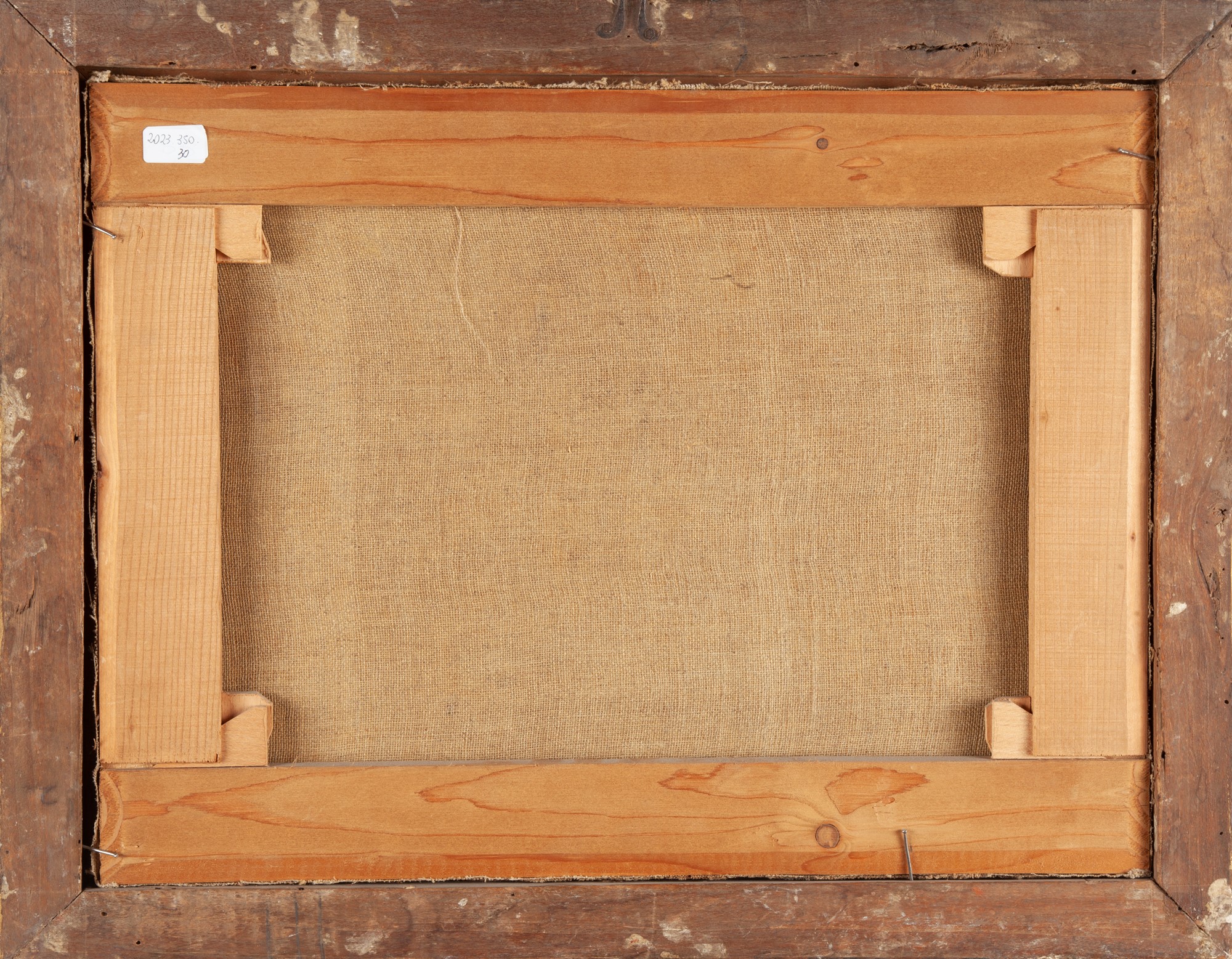 Francesco Monti detto il Brescianino (scuola di) 1646-1703 Scena di battaglia sotto le mura La tela raffigura uno scontro tra cavalieri con armi da fuoco, con gli stendardi che garriscono al vento e si stagliano su un cielo carico di nubi, di fronte ad un accampamento militare e le mura di un castello. La scena è ripresa in primo piano, escamotage tipico delle battaglie dipinte da Francesco Monti, in modo da far sentire lo spettatore come testimone diretto della scena cui sta assistendo, a cui si aggiungono una grande vivacità cromatica, il gioco di varie prospettive e un’attenta regia scenica. Per questi motivi il nostro dipinto può dirsi opera di un artista proveniente dalla bottega del Monti. olio su tela cm 36x48 - con cornice 44x56