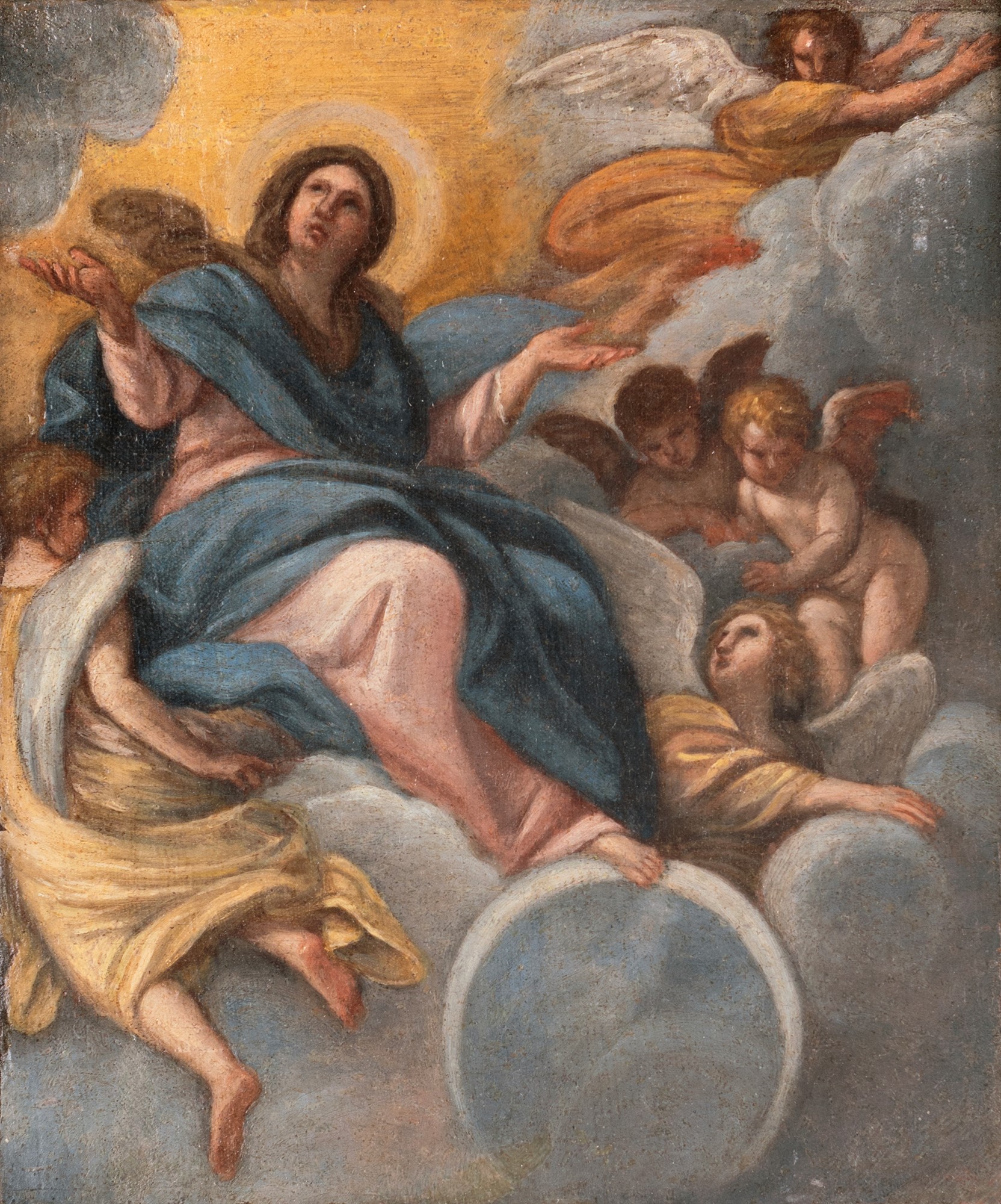 Pittore Romano del XVIII secolo Madonna con angeli La nostra tela sembra essere opera di un artista romano del primo Settecento, influenzato dalle opere di Carlo Maratti. In particolare la Madonna Assunta sembra essere tratta dalla pala con il medesimo soggetto licenziata dal pittore marchigiano per l'altare dell'importante cappella Cybo in Santa Maria del Poplo olio su tela cm 27x23 - con cornice cm 39x35