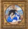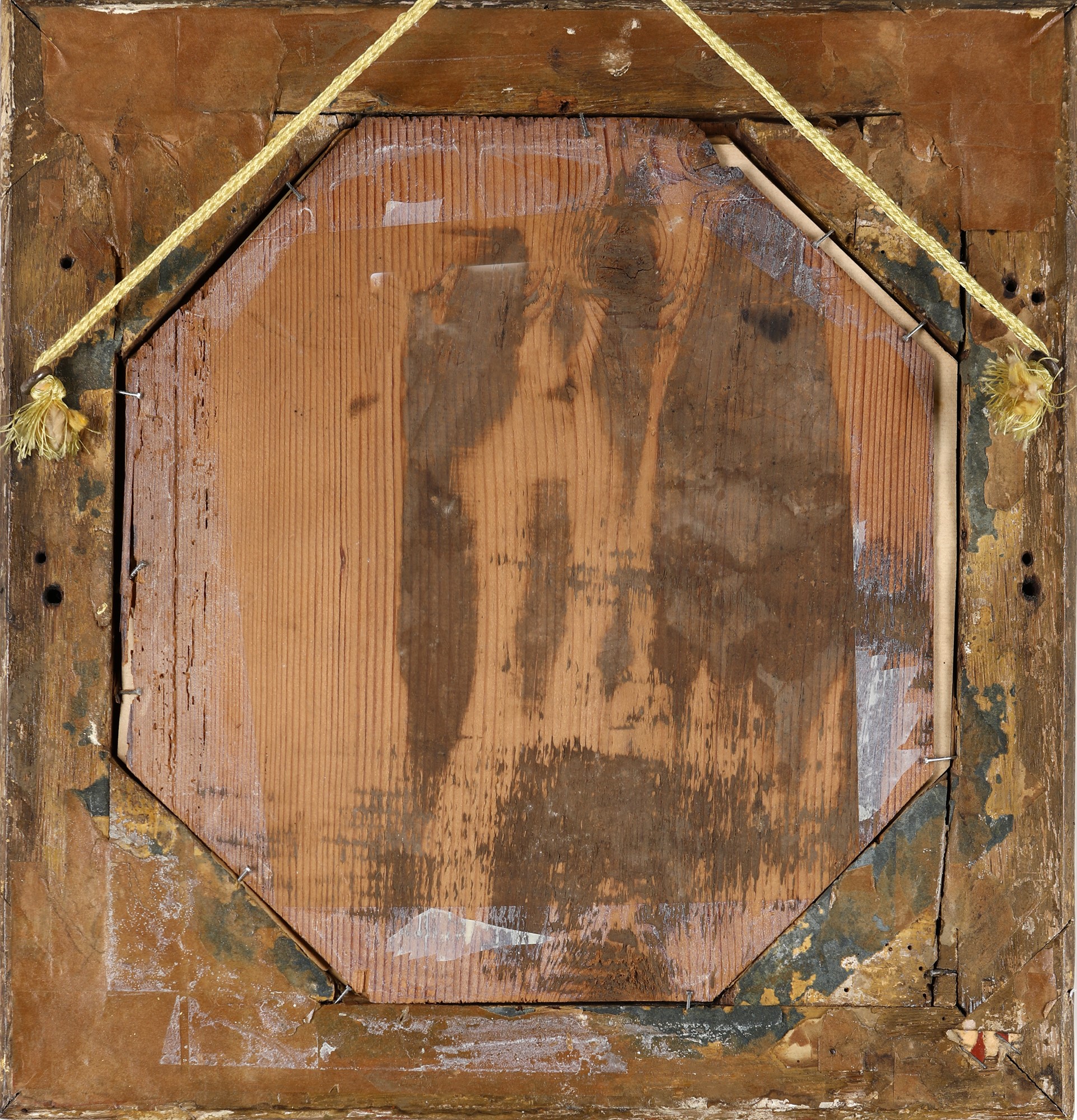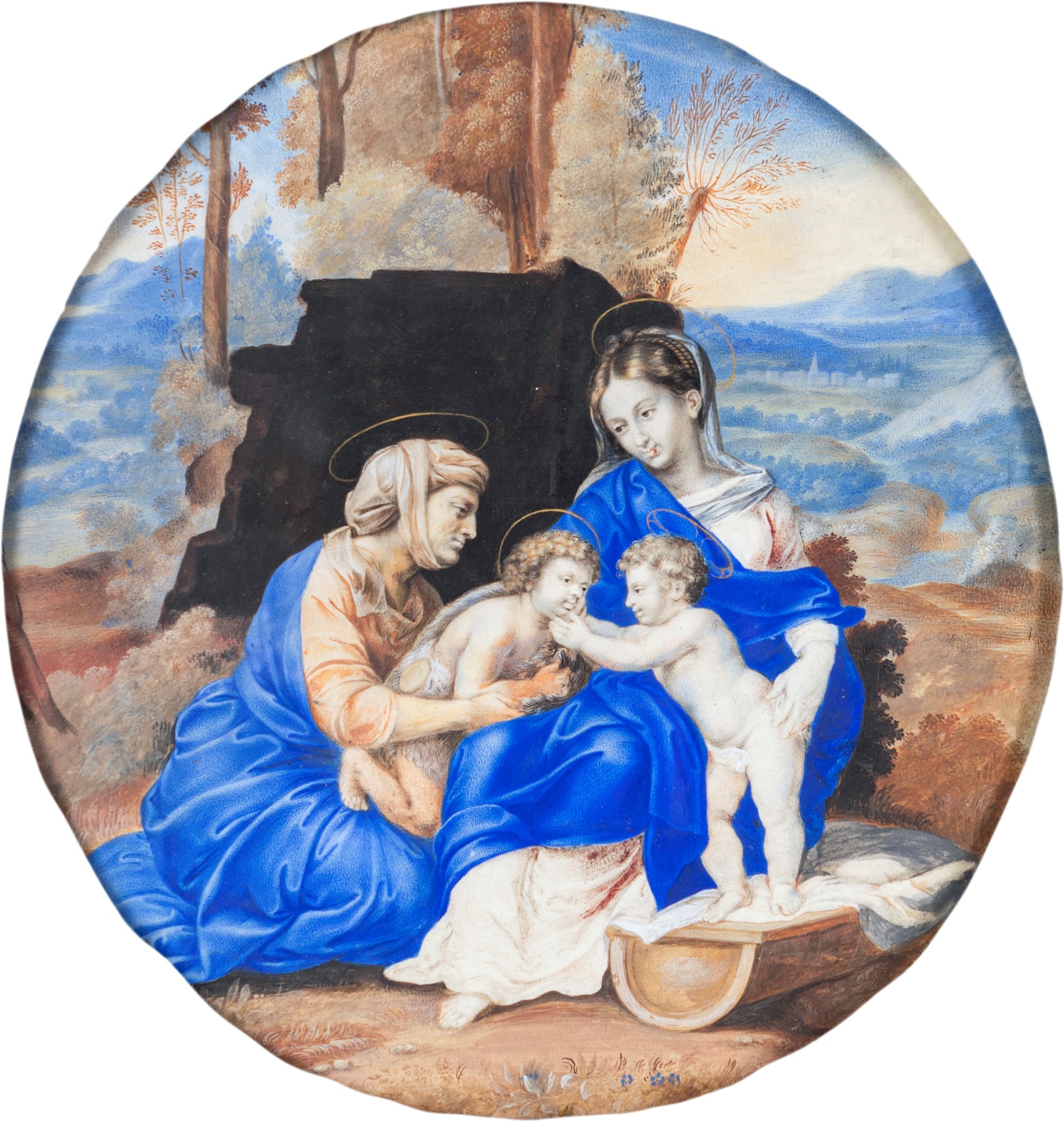 Anonimo del XVIII secolo La Vergine col Bambino, Santa Elisabetta e San Giovannino in un paesaggio desunto dalla tavola attribuita a Giulio Pippi de' Jannuzzi detto Giulio Romano (Roma 1499 - Mantova 1546), custodita al Museo del Louvre; entro cornice quadrangolare in legno intagliato e dorato acquerelli su carta circolare diametro cm 23, con cornice cm 34x34