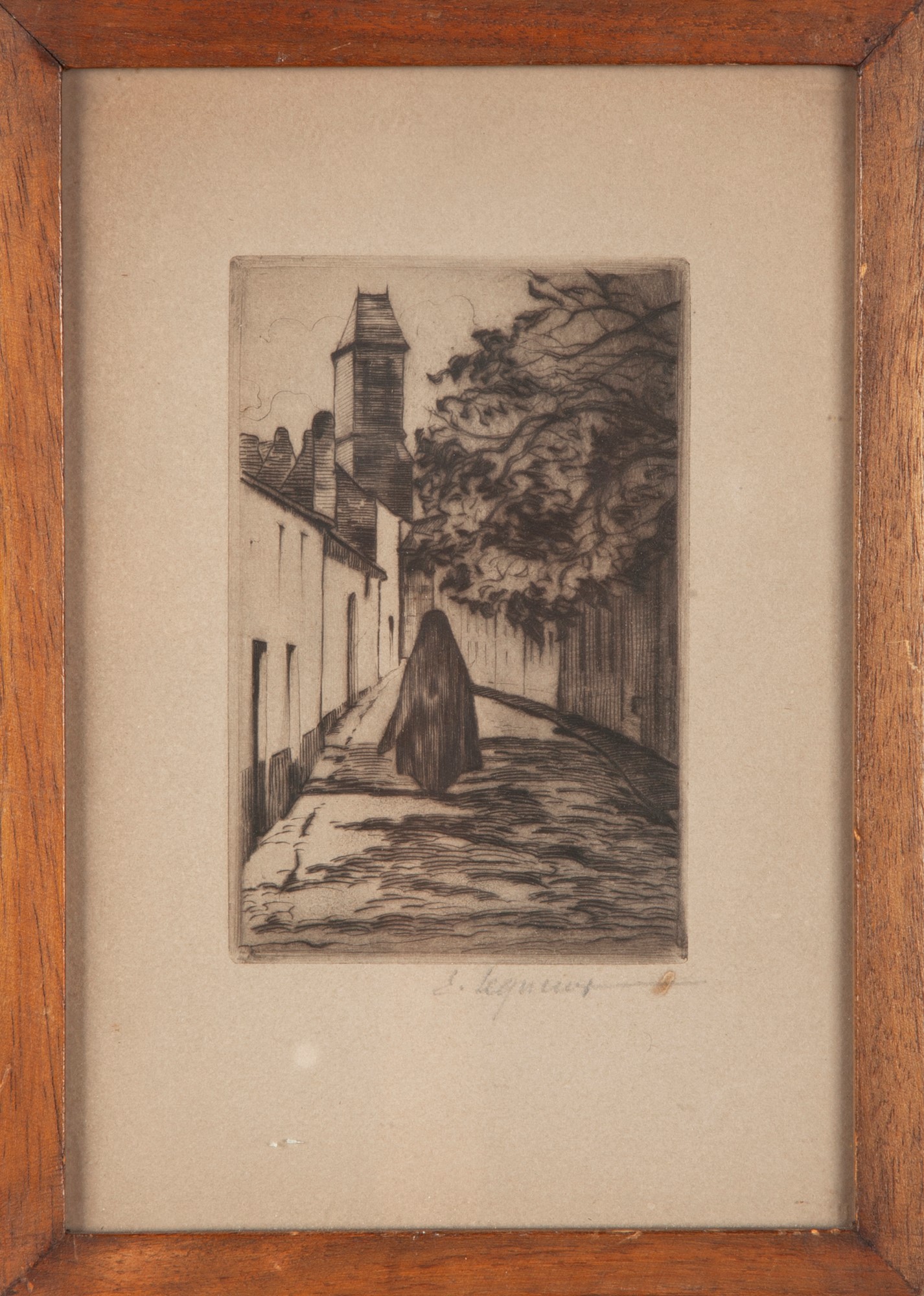 Una suora a passeggio. Firma di difficile lettura in basso a destra. Provenienza: eredi Ettore Modigliani, Milano. acquaforte cm 14 x 9 in cornice cm 26 x 19