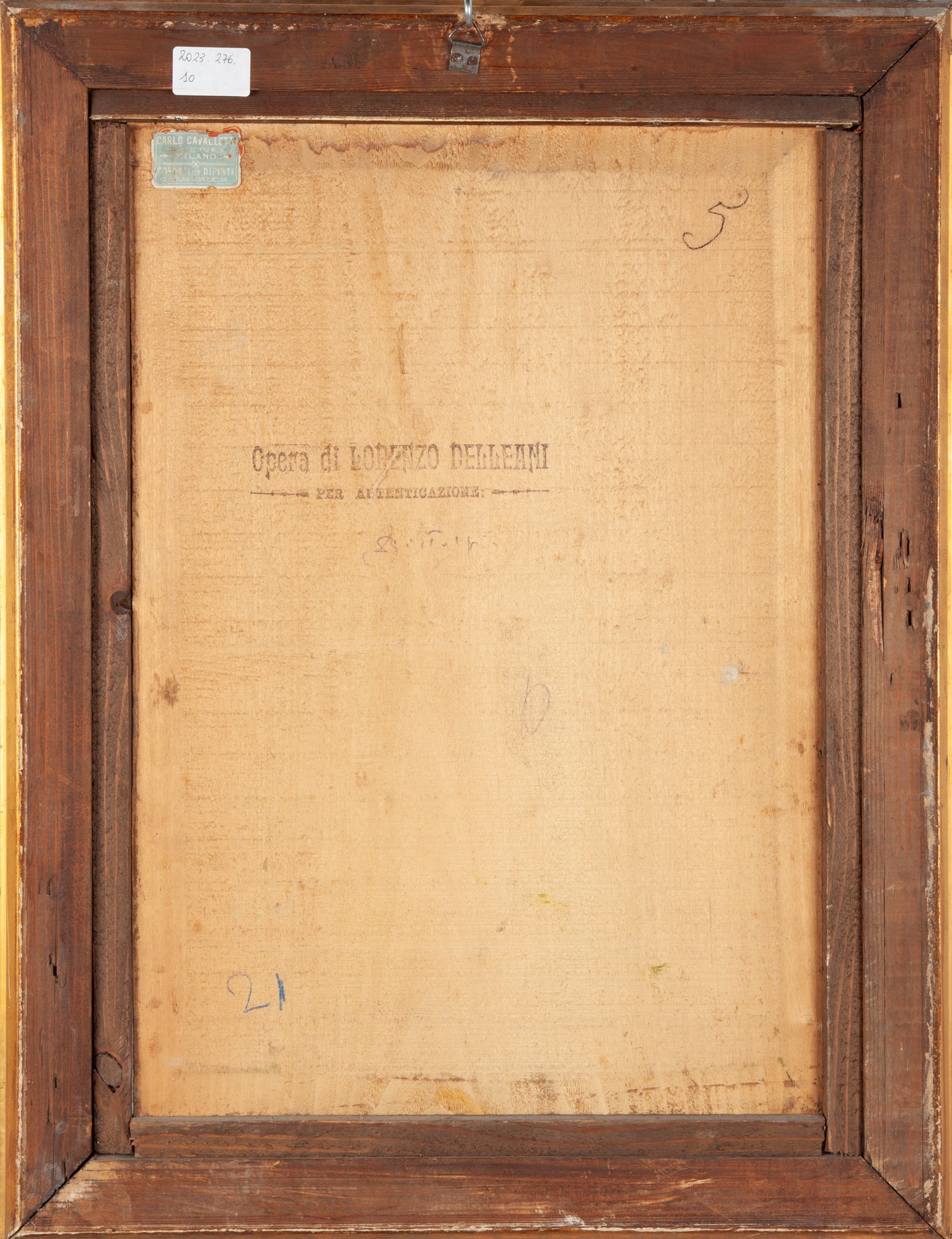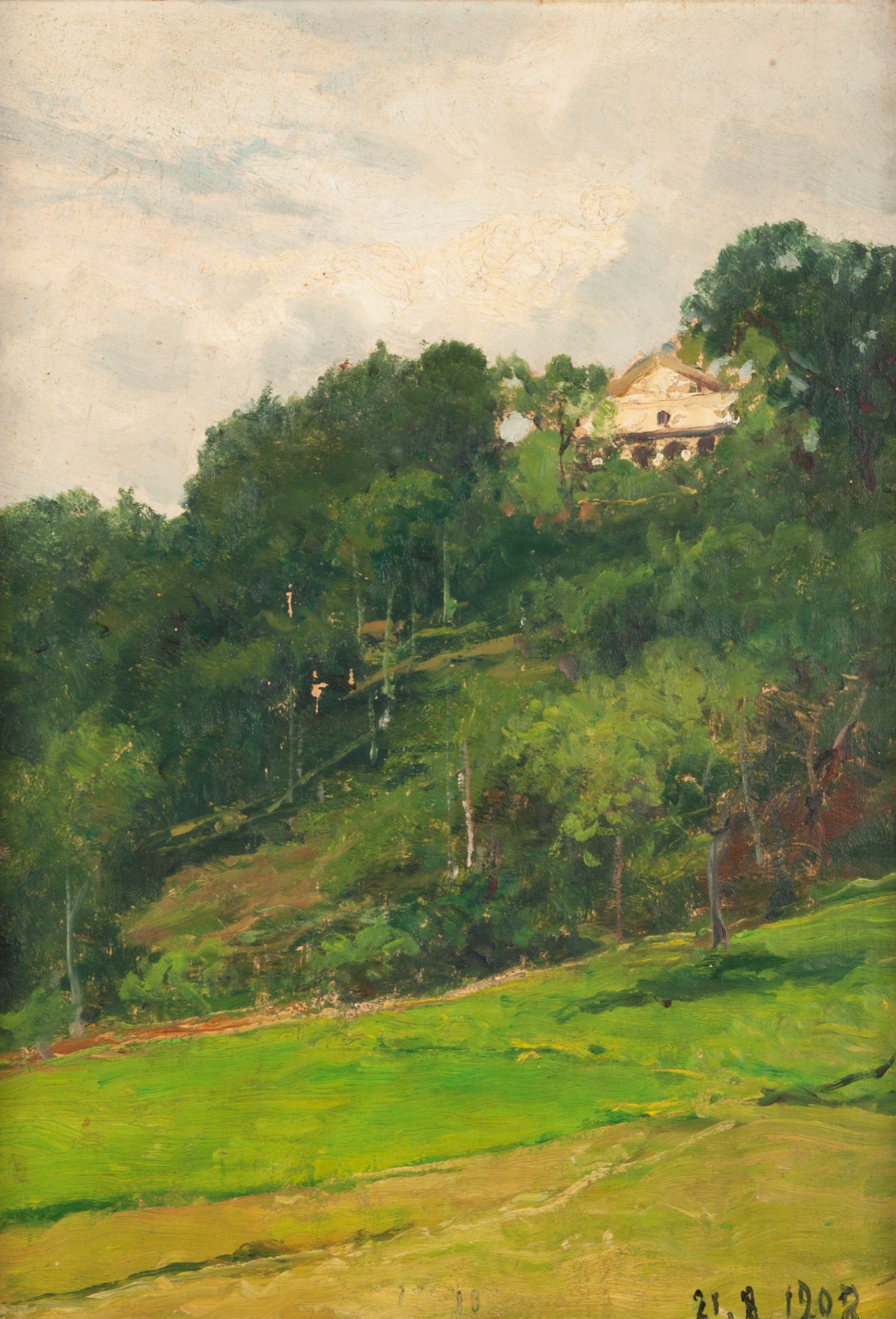 Lorenzo Delleani Pollone 1840-Torino 1908 La villa in collina datato in basso a destra 21.8.1907. Al verso timbro "Opera autentica di Lorenzo Delleani", con firma "L. Bistolfi". Provenienza: eredi Ettore Modigliani, Milano. olio su tavoletta cm 47 x 32 in cornice dorata cm 55 x 43