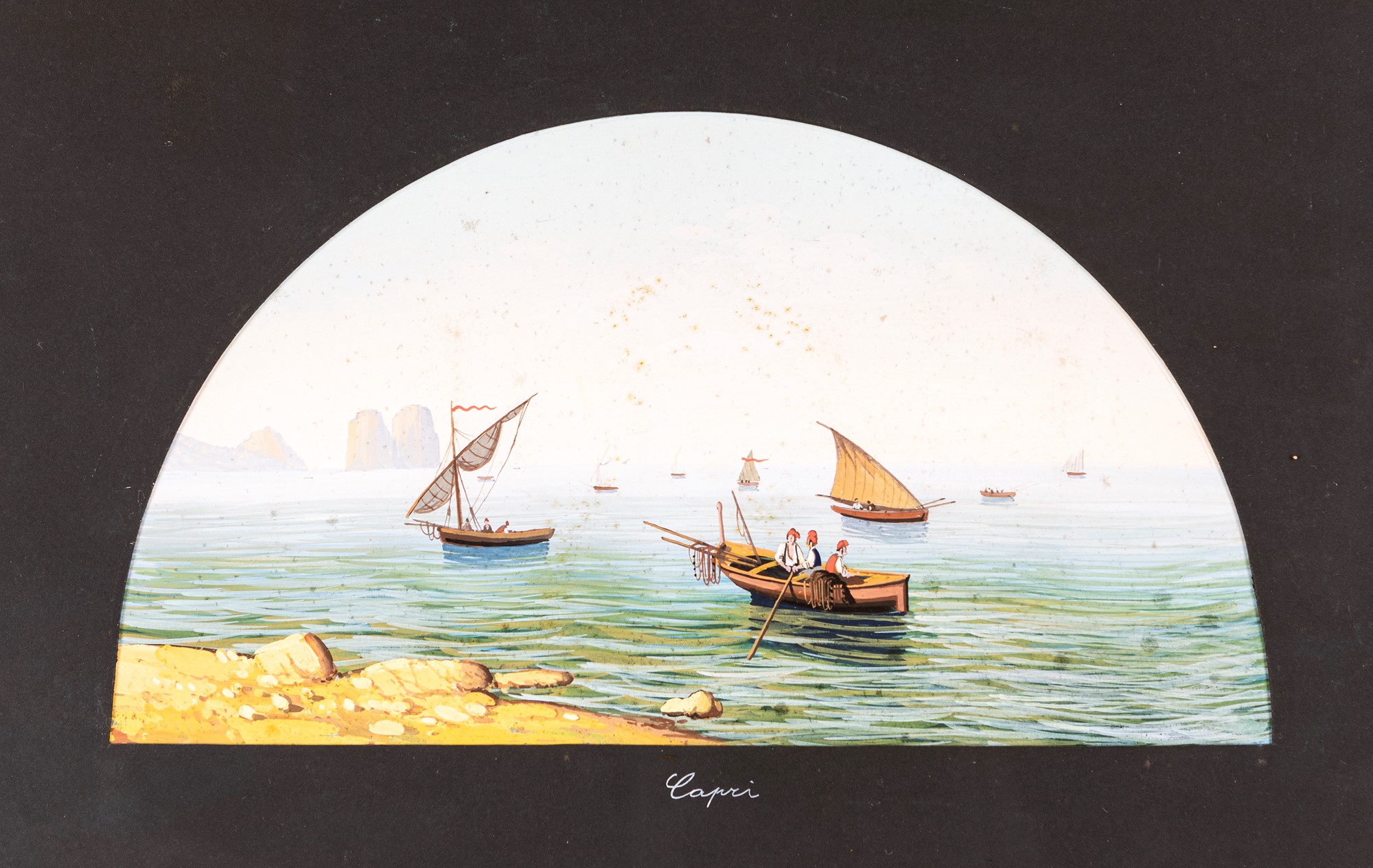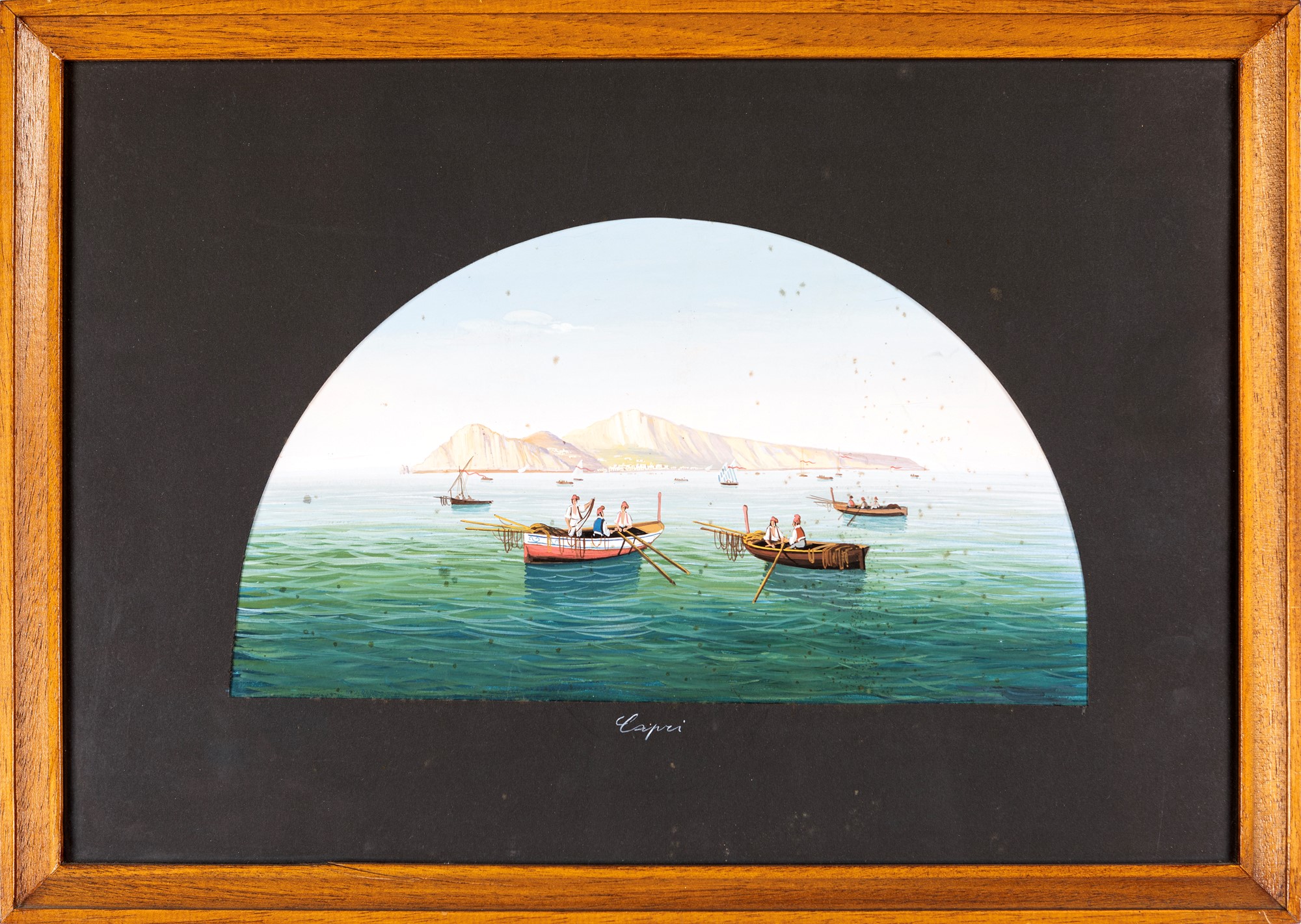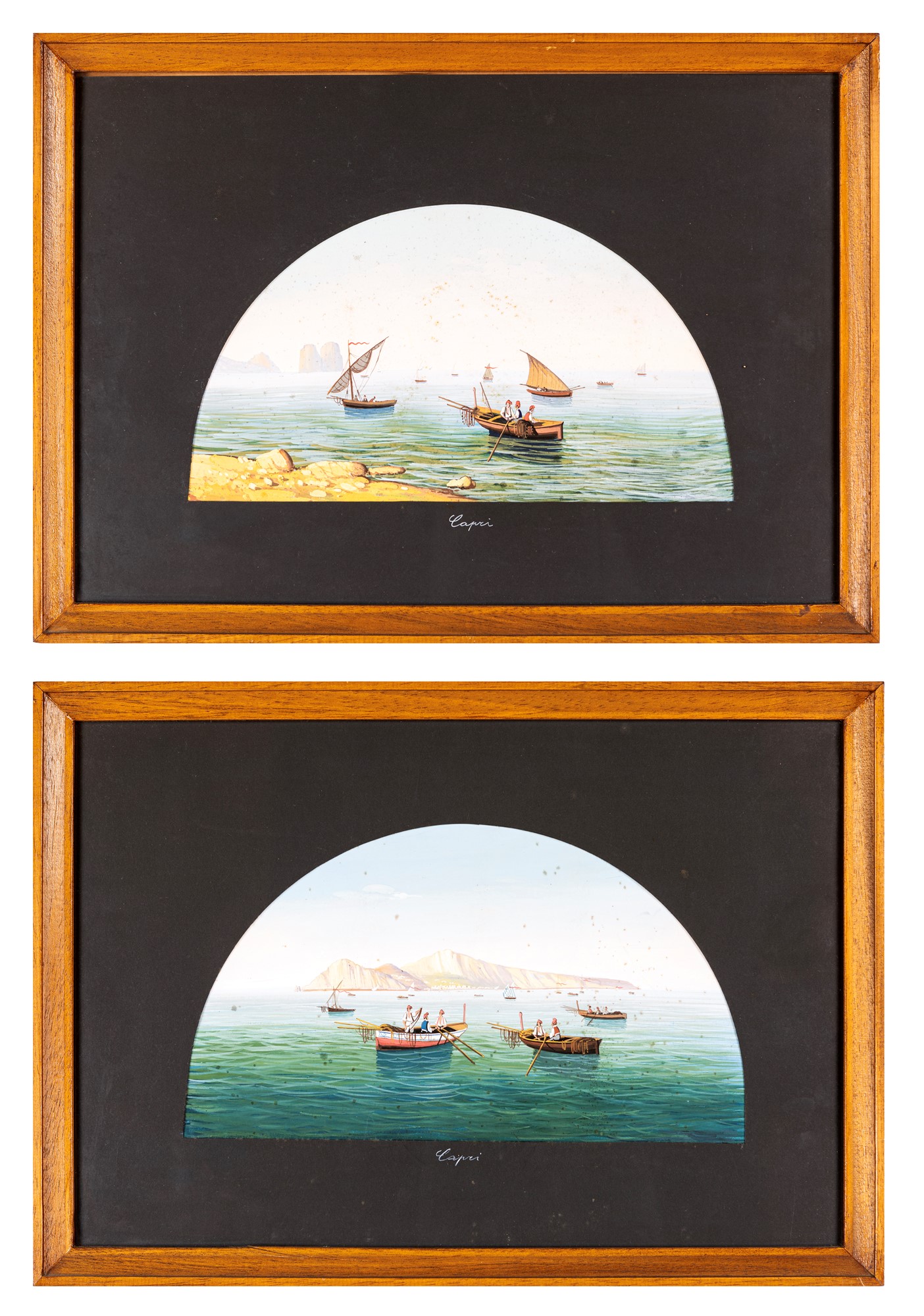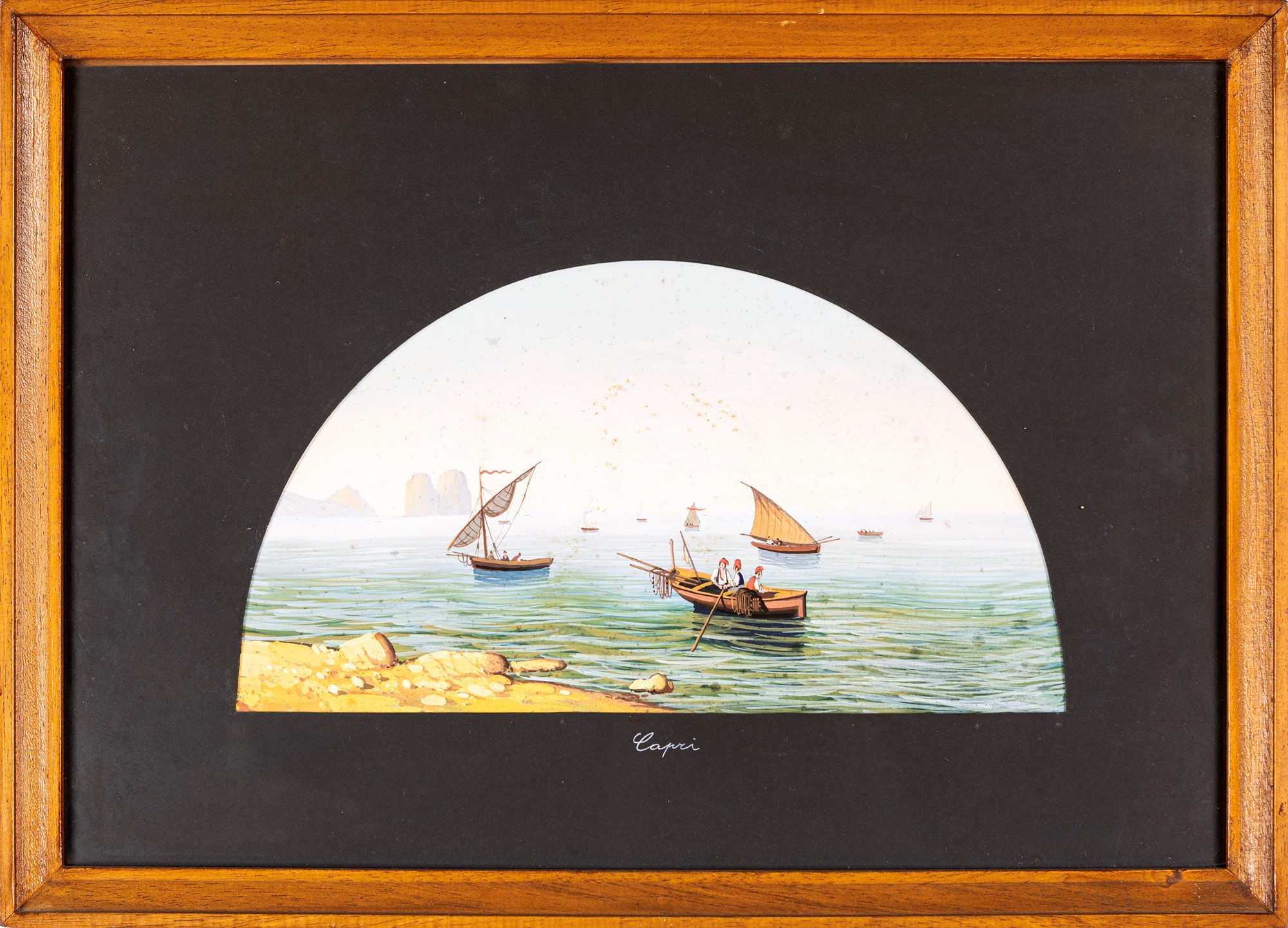 Pittore degli inizi del XX secolo a) Barche con pescatori a Capri b) Barche con pescatori ai faraglioni coppia di gouache a mezzaluna cm 23x40 - in cornice cm 43,5x60,5