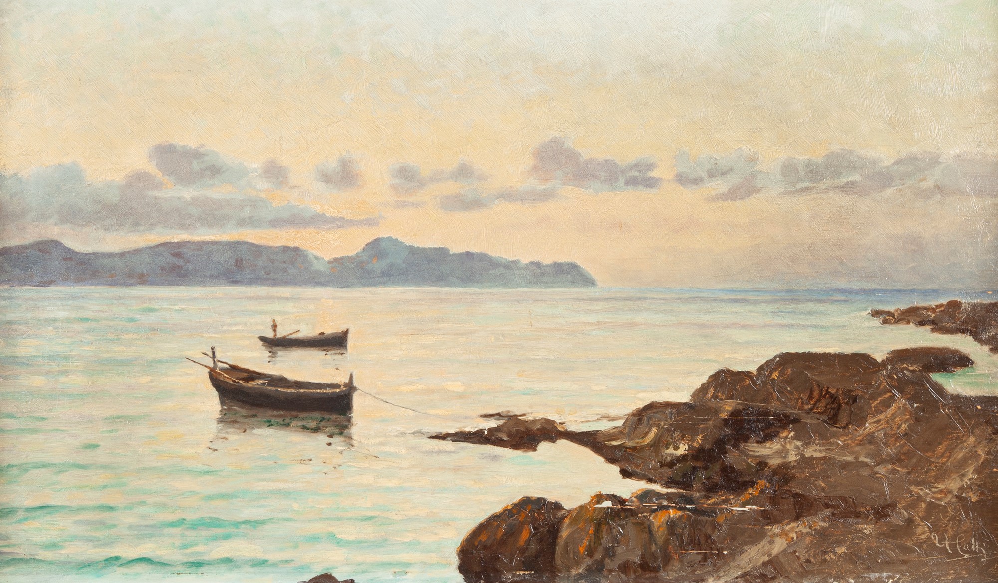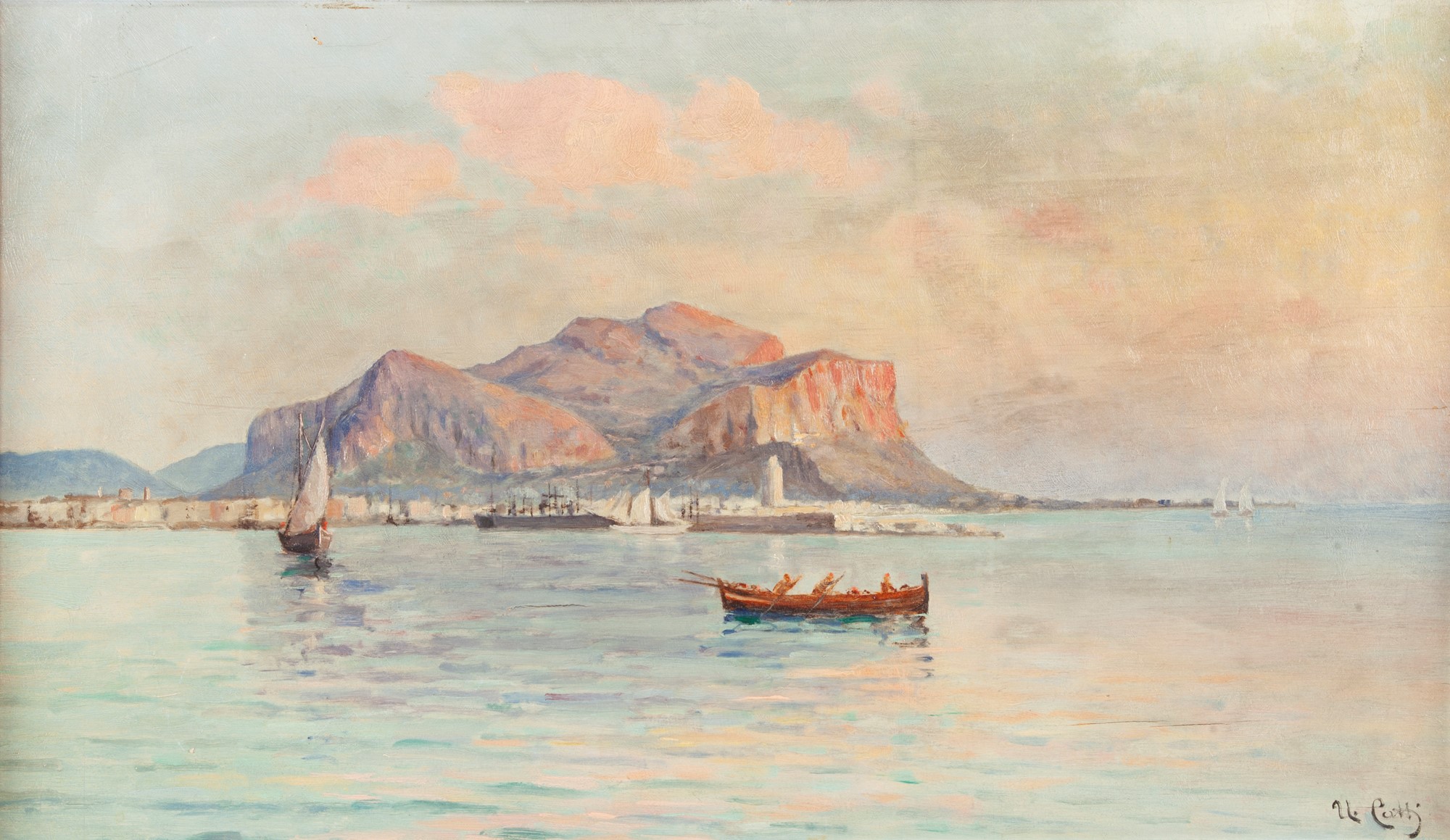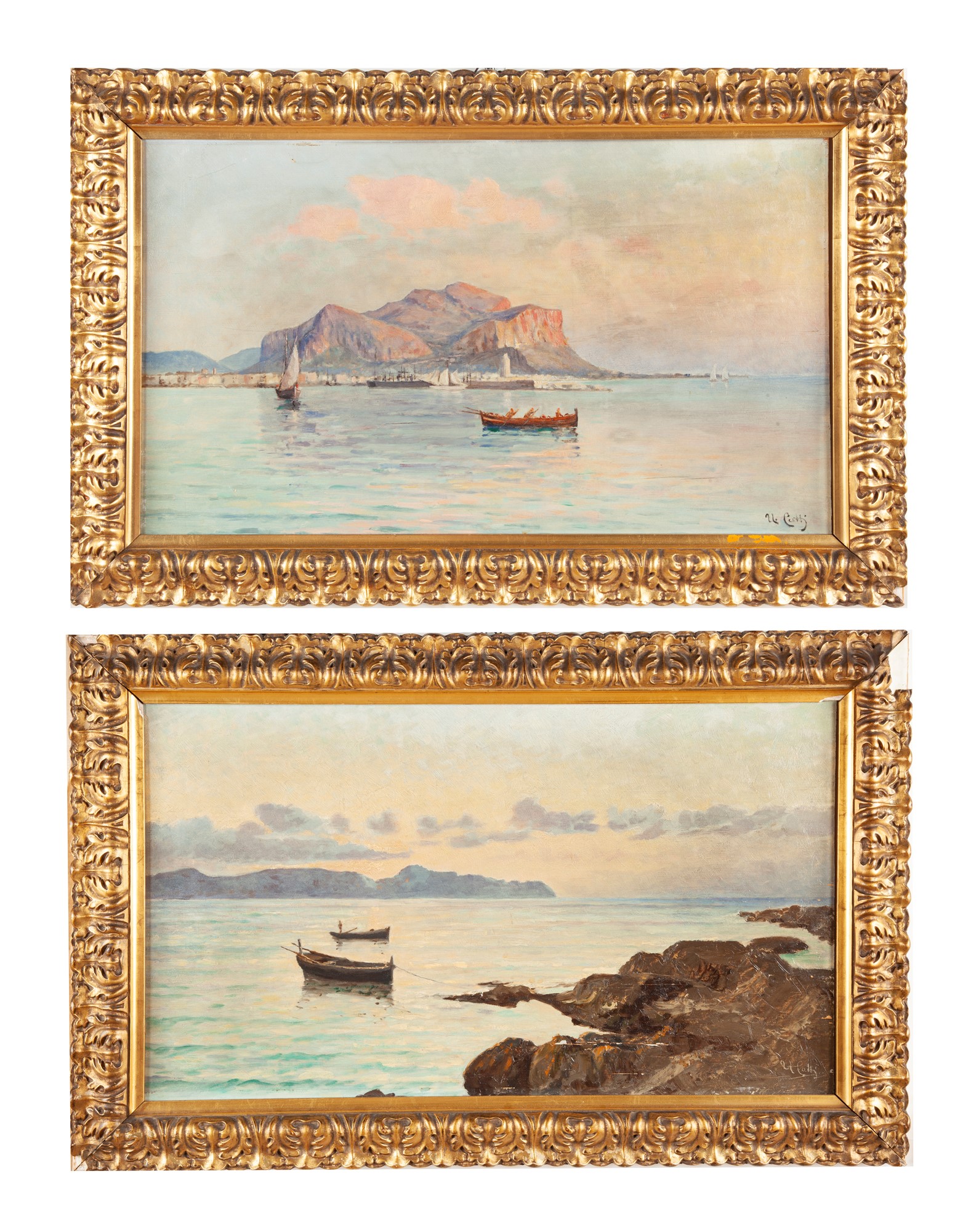 Ugo Catti a) Paesaggio siciliano b) Palermo e monte Pellegrino Firmati in basso a destra: A. Catti coppia di olii su tavola cm 35x61 - in cornice cm 45x71
