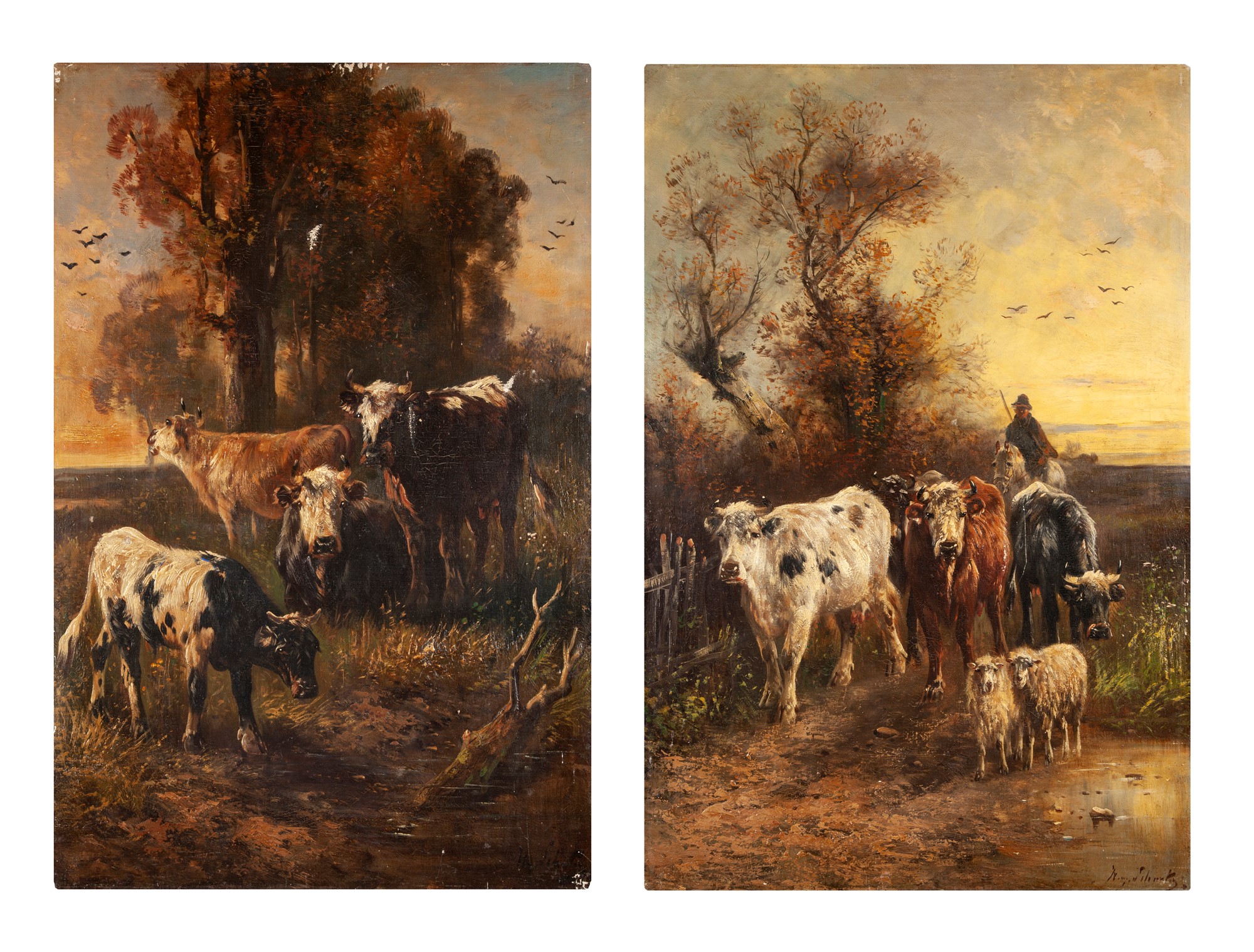 Henry Schouten 1857/64-1927 Paesaggio con armenti coppia di olii su tela cm 91x61 s.c.