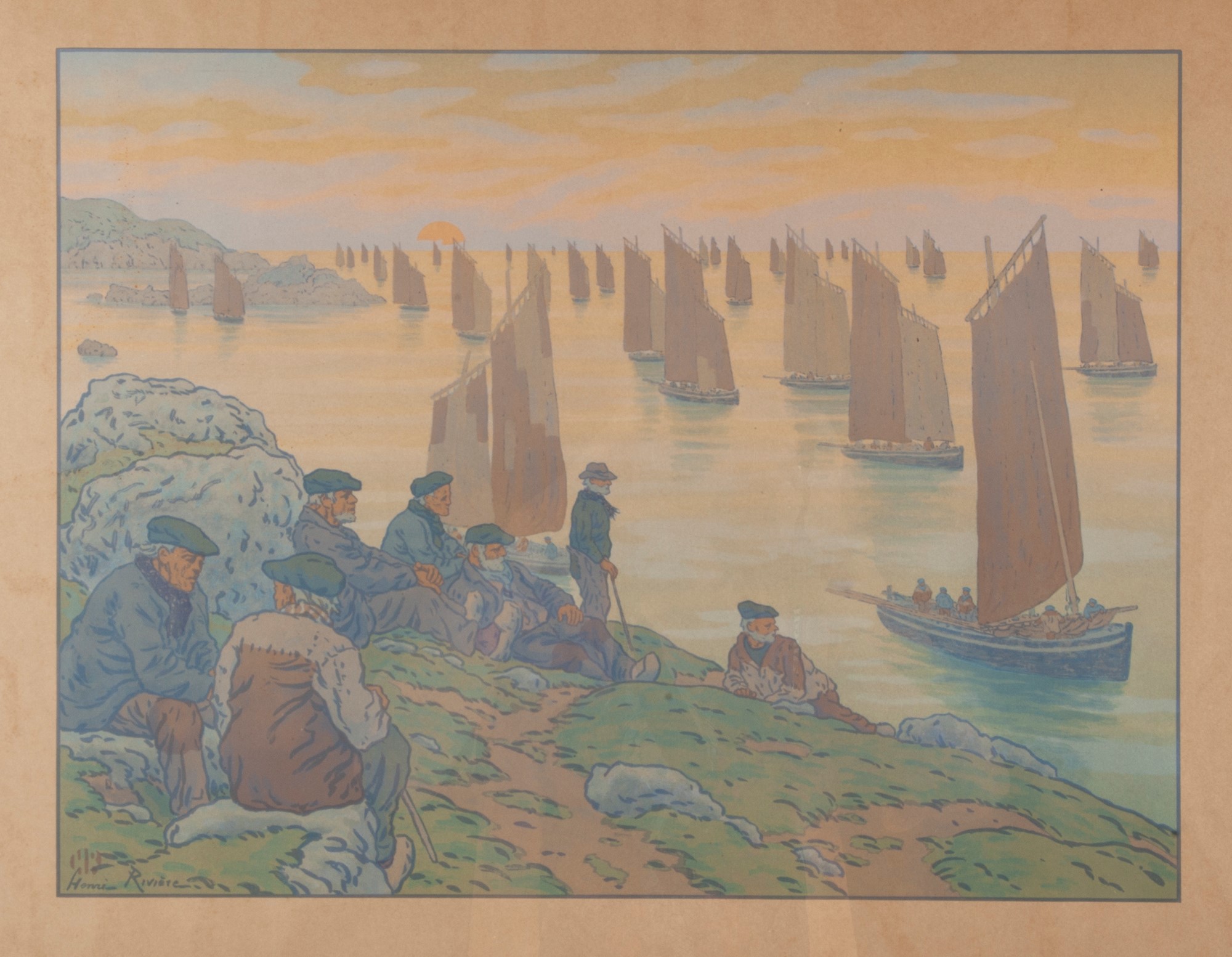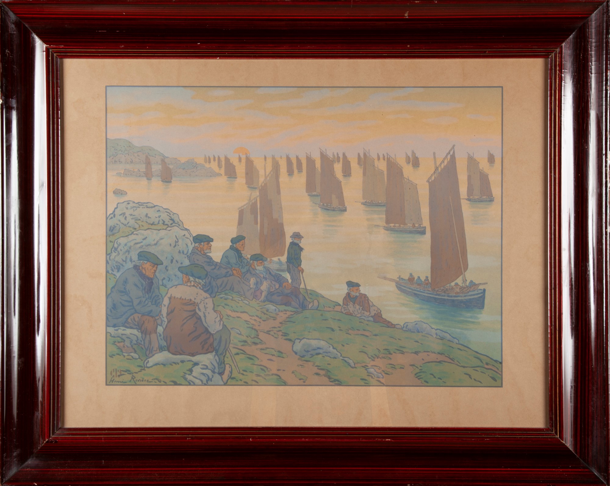 Henri Laurent Rivière Parigi 1827-Hanoi 1883 Barche al tramonto. Firma "Henri Rivière" in basso a sinistra. Provenienza: eredi Ettore Modigliani, Milano. litografia cm 38 x 49 in cornice cm 60 x 75