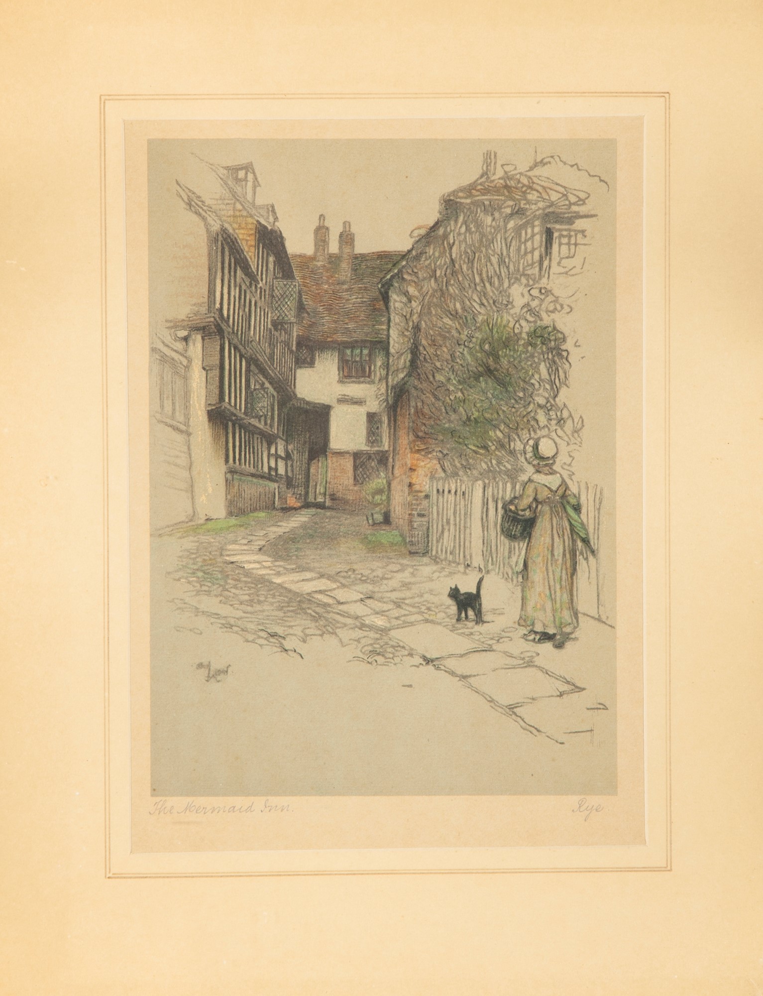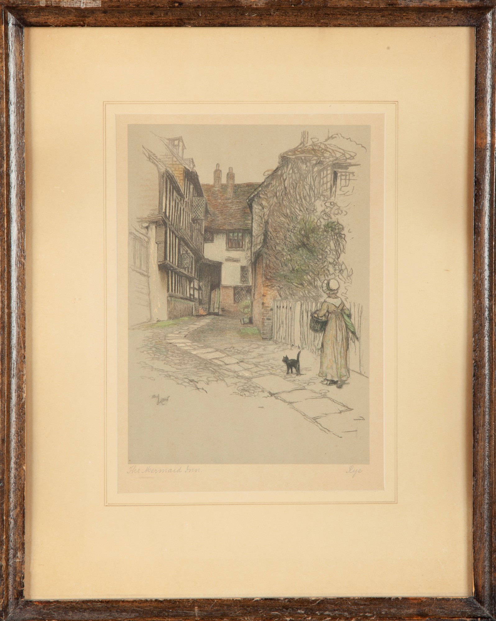 Scorcio di paese con donna e gatto Iscritto a matita in basso a sinistra: The Mermaid ... e Rye in basso a destra. Provenienza: eredi Ettore Modigliani, Milano. fotolitografia cm 18x12,5 - in cornice cm 32,5x26