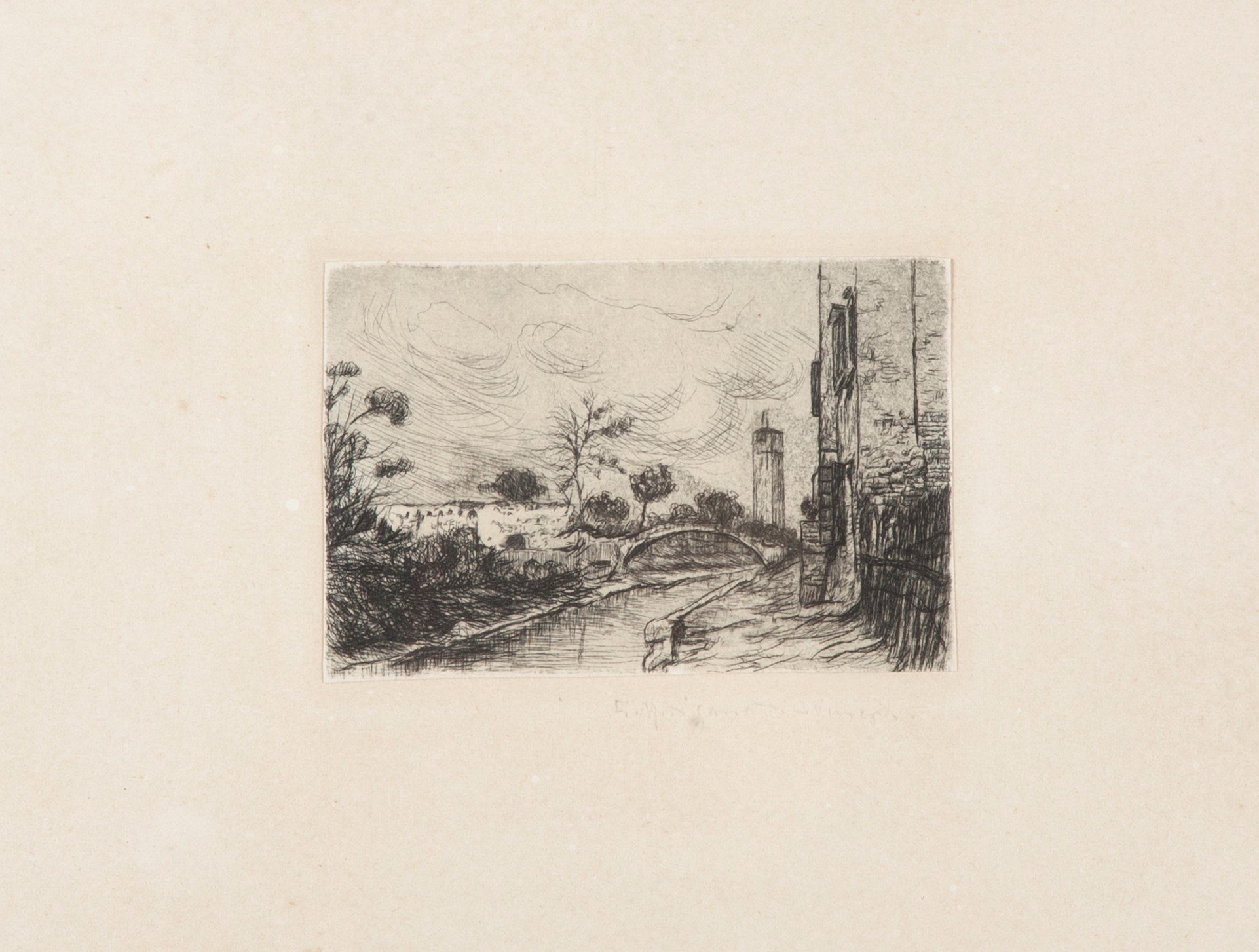 Giuseppe Miti Zanetti Modena 1859-Milano 1929 Paesaggio veneziano Firmato "G. Miti Zanetti - Venezia". Provenienza: eredi Ettore Modigliani, Milano. acquaforte cm 6x9 - in cornice cm 26x34
