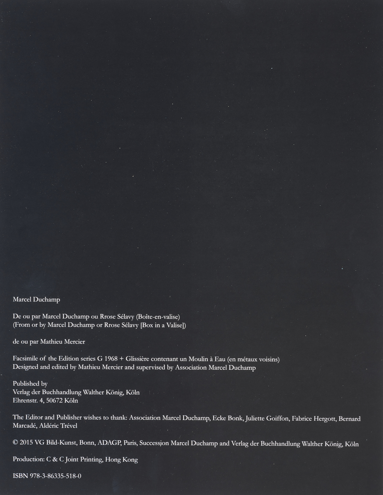 DUCHAMP MARCEL (1887 - 1968) De ou par Marcel Duchamp ou Rrose Sélavy (Boîte-en-valise) - series G. . 2015. Multiplo. Cm 27,00 x 8,00 x 28,00. Facsimile dell'Edizione serie G 1968 + diapositiva con Mulino ad Acqua. Progettato e edito da Mathieu Mercier, supervisione dell'Associazione Marcel Duchamp. Pubblicato da Verlag der Buchhandlung Walther König, Köln.