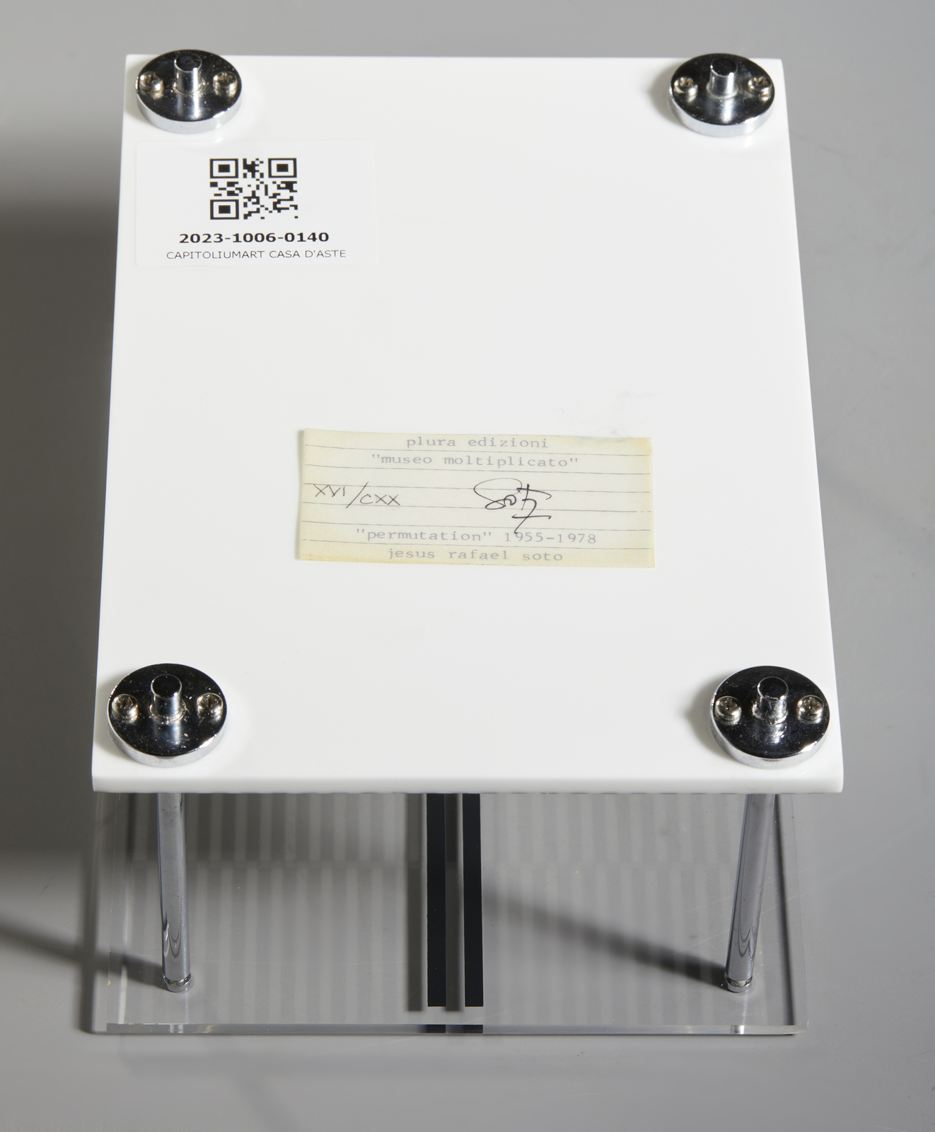 SOTO JESUS RAFAEL (1923 - 2005) Permutation. . 1978. Metallo e plexiglass.. Cm 15,00 x 21,00 x 9,00. XVI/CXX. Al retro cartiglio descrittivo con tiratura e firma dell'artista. Edizione totale: 120 esemplari in numero romano. Plura Edizioni, Milano. 1955 -1978.