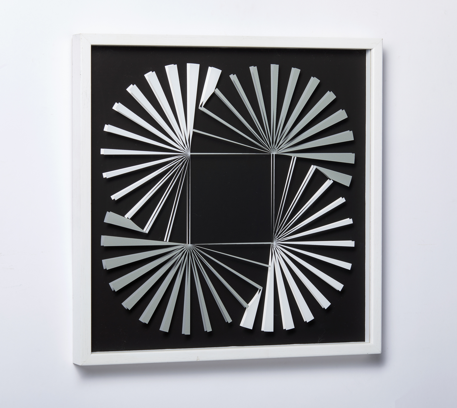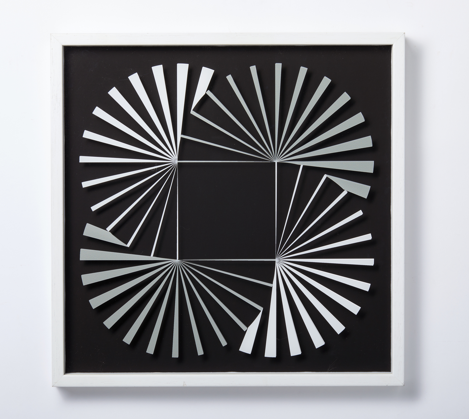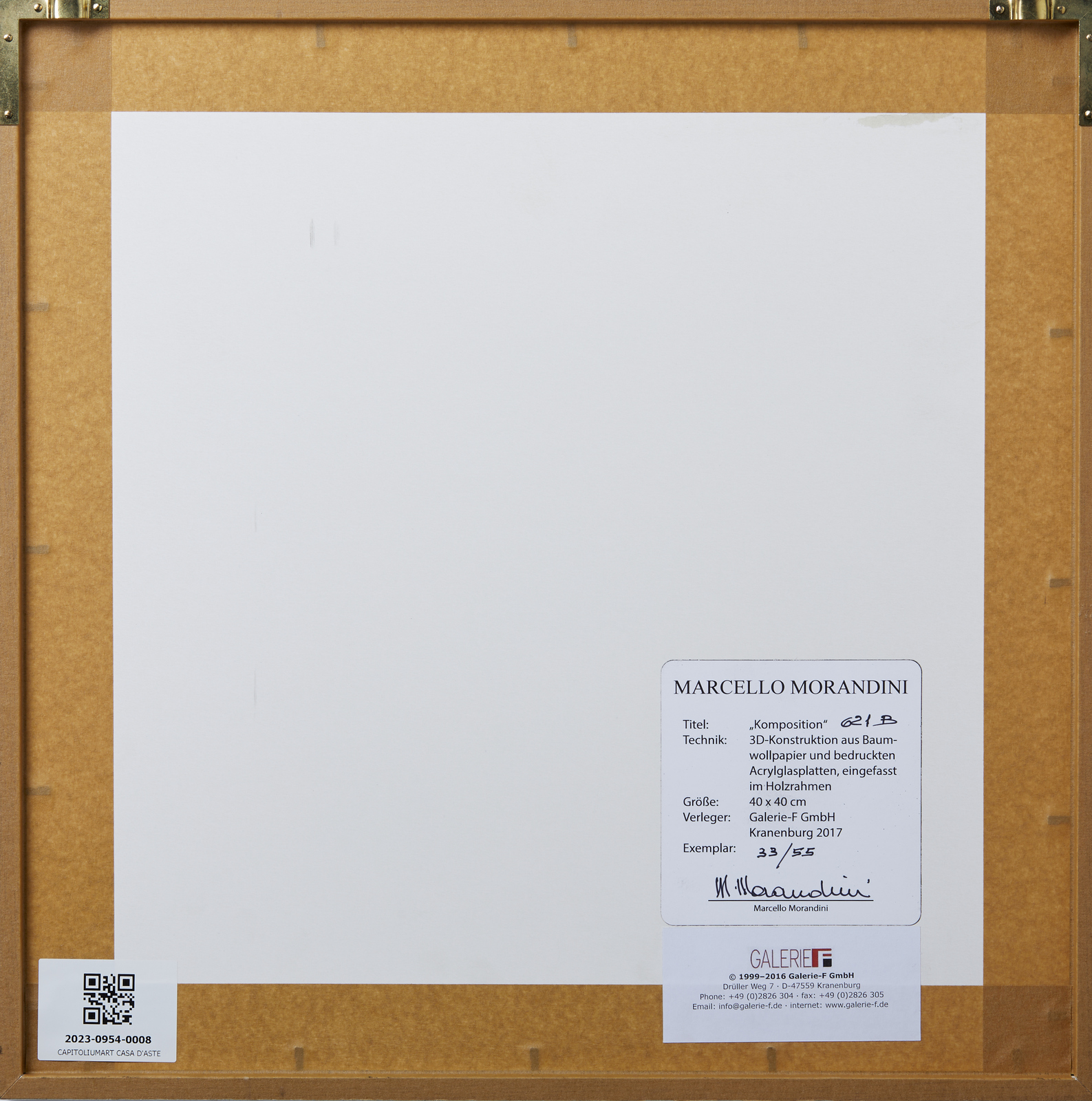 MORANDINI MARCELLO (n. 1940) Komposition 621 B, . 2017. Tecnica mista su cartone. Cm 40,00 x 40,00. 33/55. Al retro cartiglio dell'artista con tiratura e firma e cartiglio Galerie-F, Kranenburg. Costruzione 3D realizzata con carta di cotone e pannelli di vetro acrilico stampato. Editore: Galerie-F GmbH, Kranenburg, 2017. Cornice presente