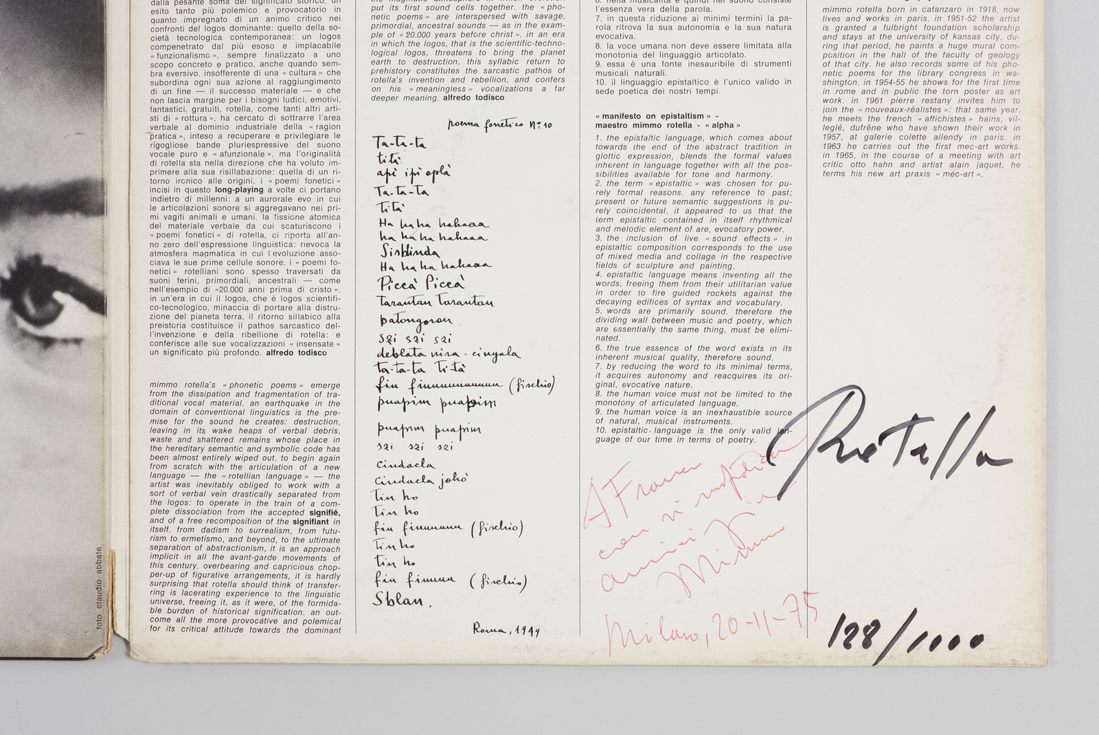 ROTELLA MIMMO (1918 - 2006) Poemi fonetici. Vinile. Cm 31,00 x 31,00. 128/1000. Tiratura e firma a pennarello all'interno della custodia. Vinile 33 giri. Edizione totale: 1000 esemplari. Editore: Plura Edizioni, Milano. Lievi difetti. 1949-1975.