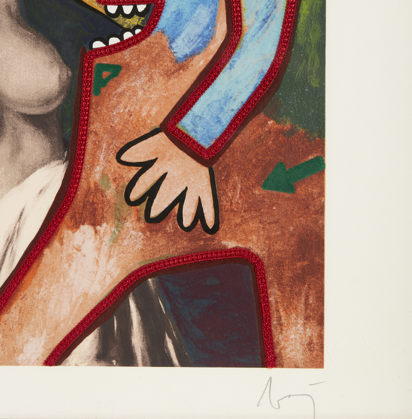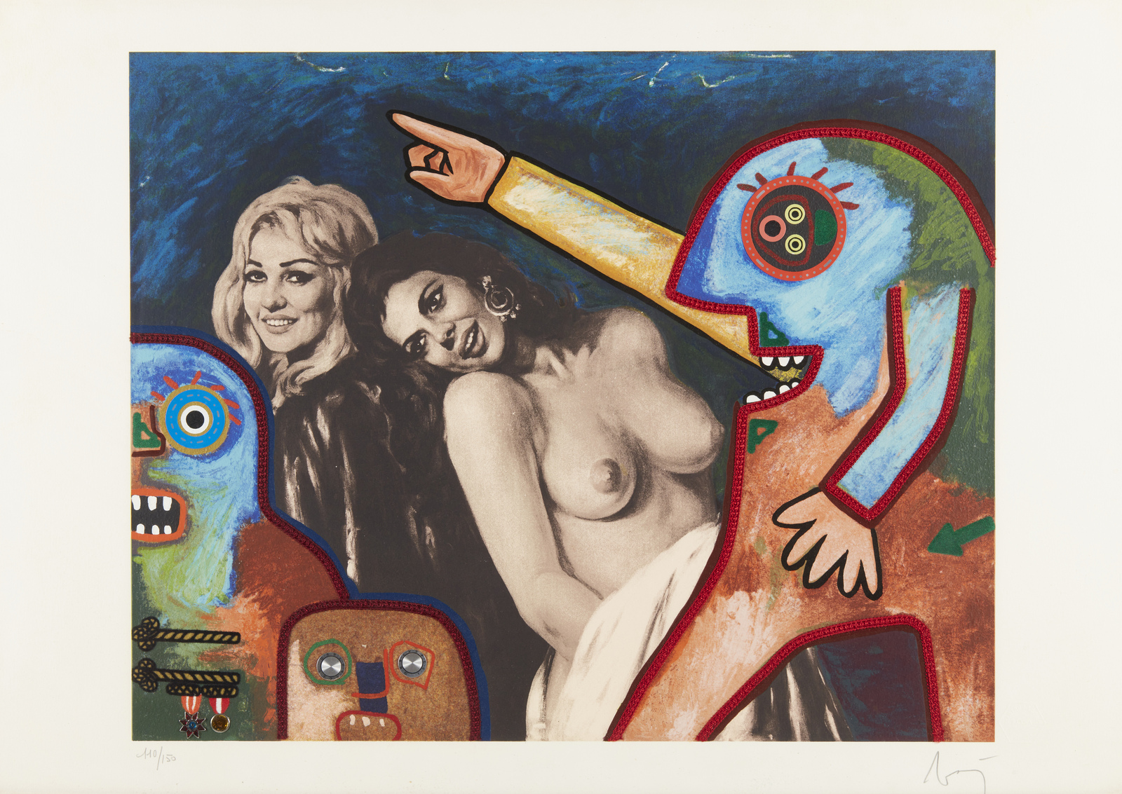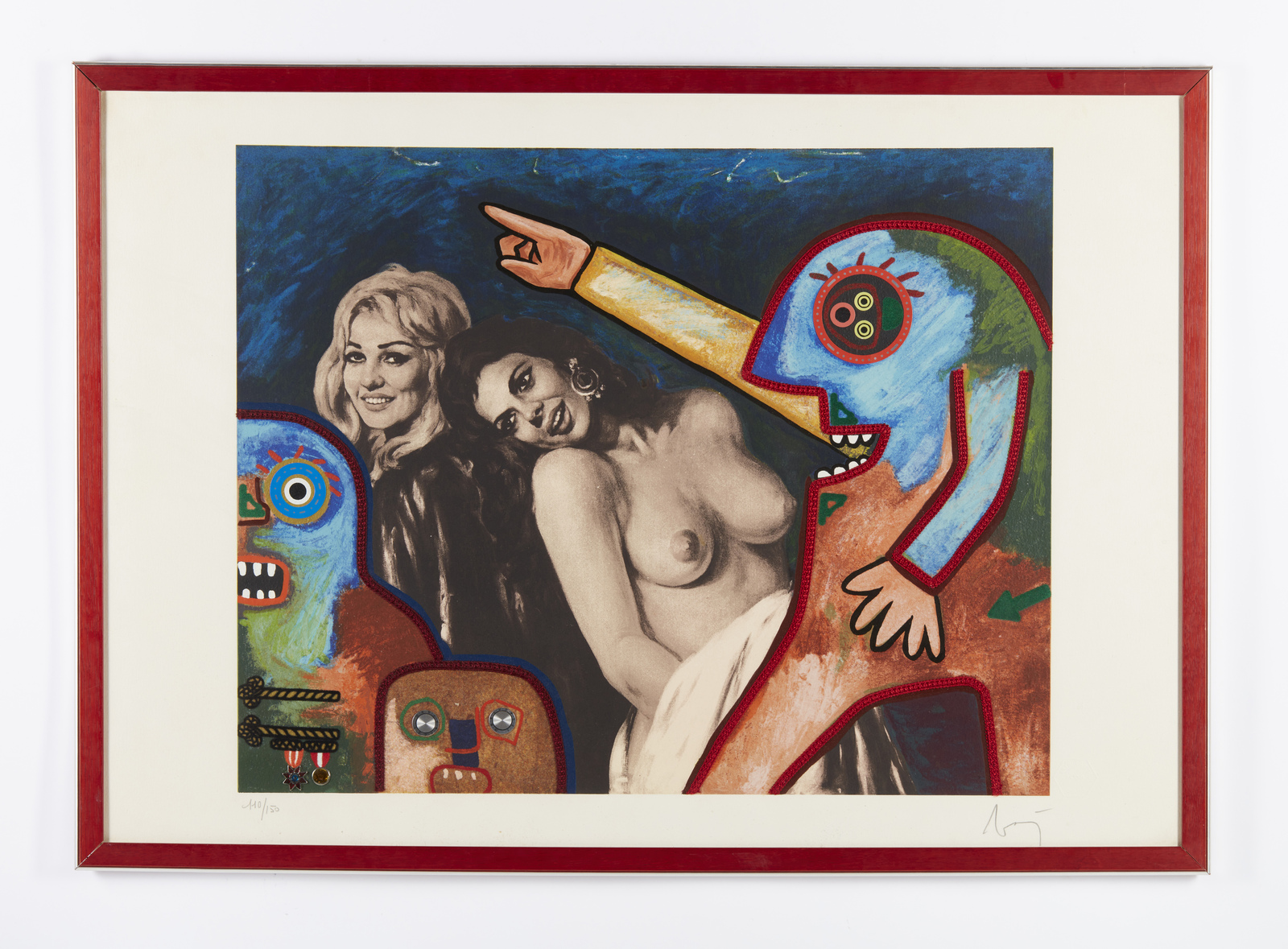 BAJ ENRICO (1924 - 2003) Ninon de Lanclos e Eleonora di Navarra sorprese dal Duca di Enghien. 1986. Litografia e collage. Cm 100,00 x 70,00. 110/150. Tiratura e firma in basso a matita. Timbro a secco Editore Mastrogiacomo, Padova, in basso a destra. Edizione totale: 150 esemplari numerati da 1 a 150, 50 esemplari numerati da I a L. Pubblicazione: Baj. Catalogo generale delle stampe originali,, Electa, 1986, il. n. 636 pag. 162. Si ringrazia Roberta Cerini Baj per aver contribuito alla stesura della scheda.
