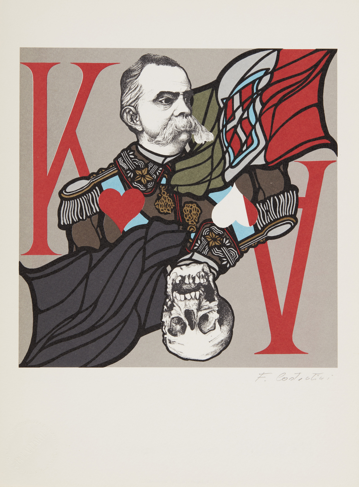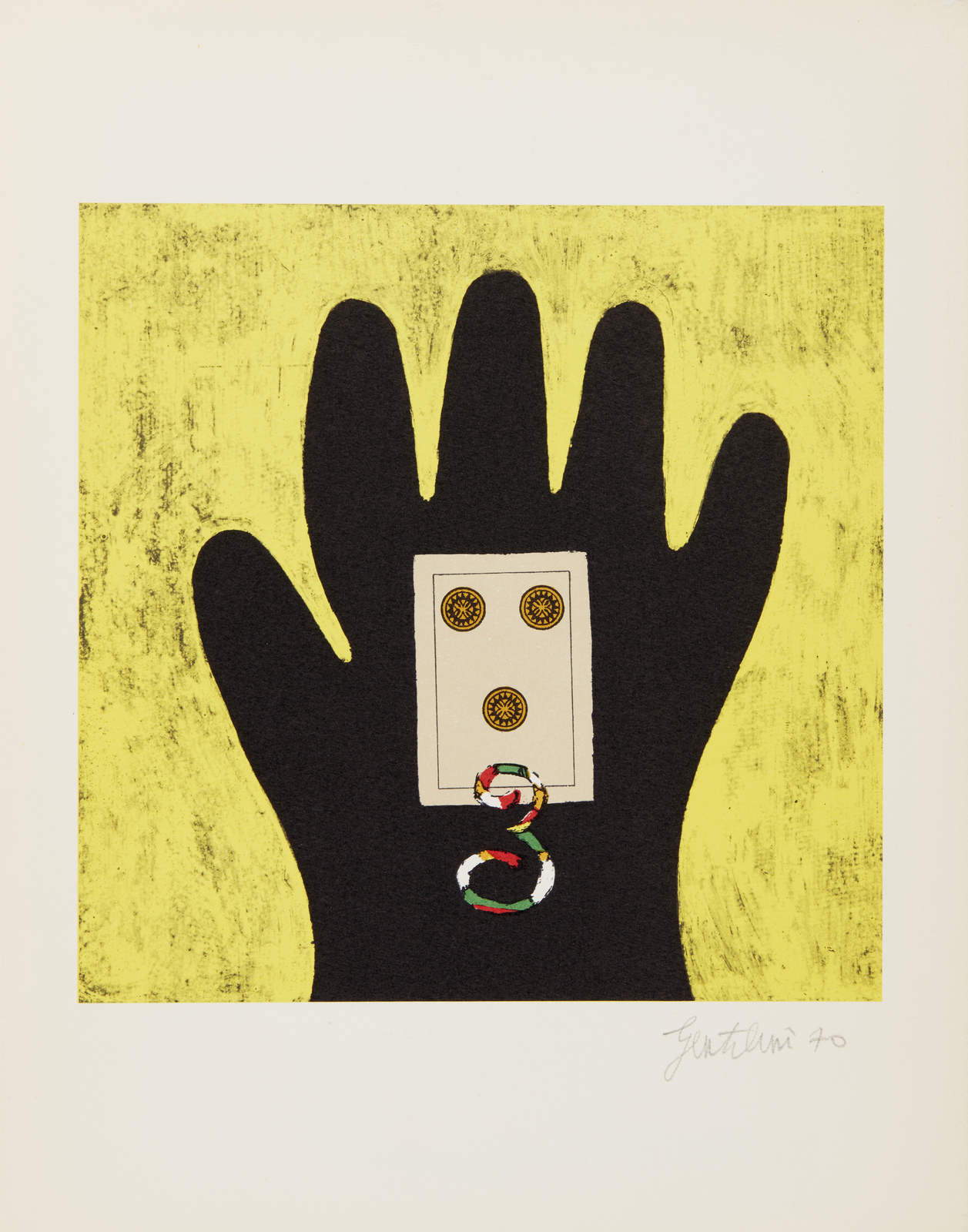 Per la serie "Le carte da gioco" (8): Claudio Parmiggiani. La donna. 1754/5000. Firma in basso a destra; Flavio Costantini. Il re. 920/5000. Firma in basso a destra; Vladimir Valickovic. Il Fante (Valet). 4057/5000. Firma in basso al centro; Achille Perilli. Picche. 687/5000. Firma e anno in basso a destra. 1976; Concetto Pozzati. Fiori. 1872/5000. Firma in basso al centro; Rafael Alberti. Cuori. 132/5000. Firma e anno in basso a destra. 1976; Mauro Reggiani. Quadri. 1516/5000. Firma in basso a destra; Ben Vautier. The Jocker. 913/5000. Firma in basso a destra.