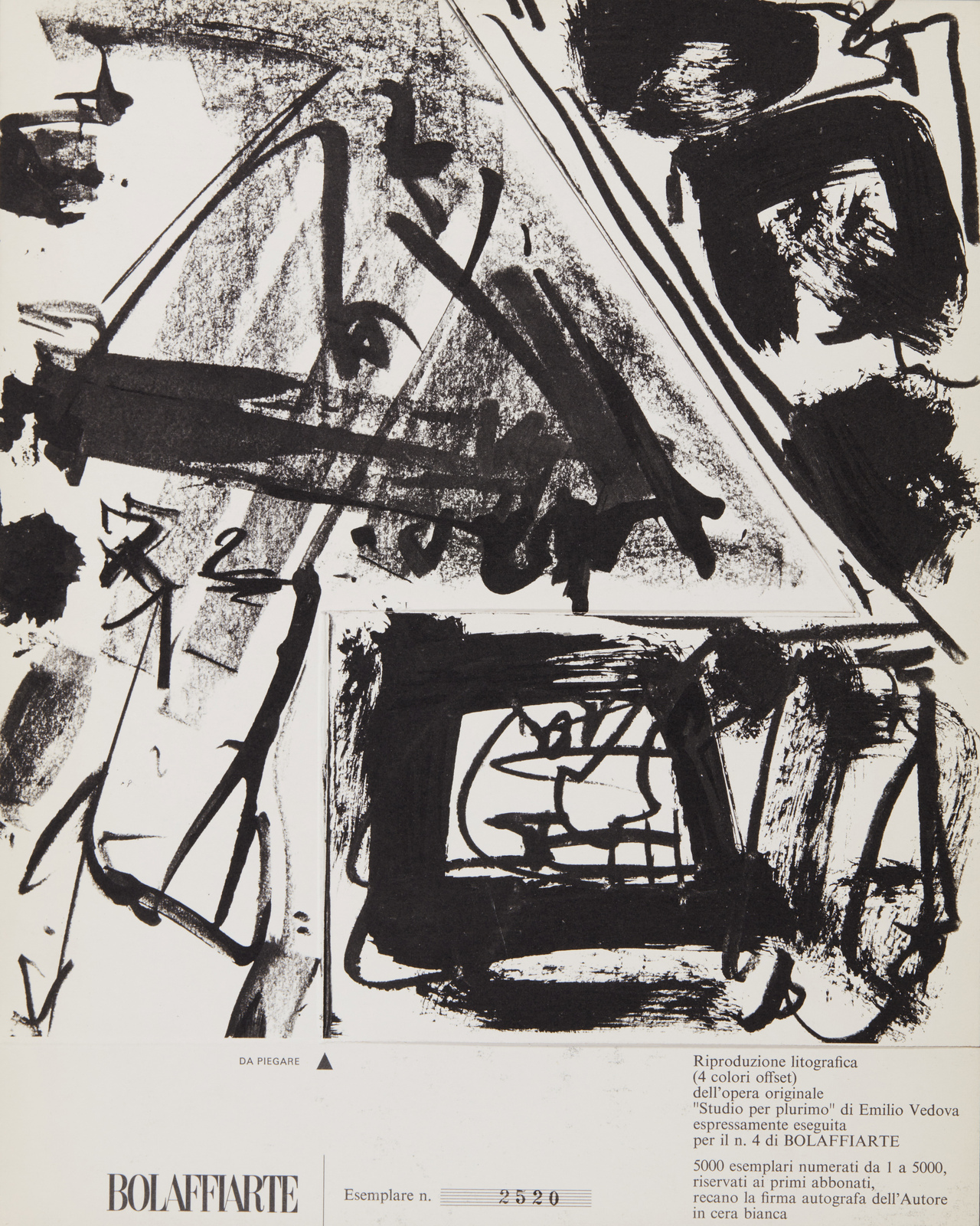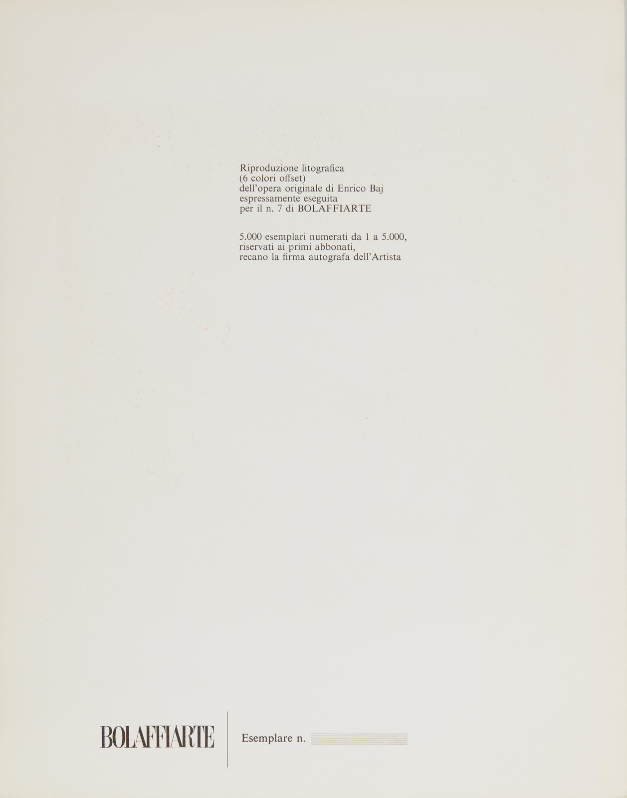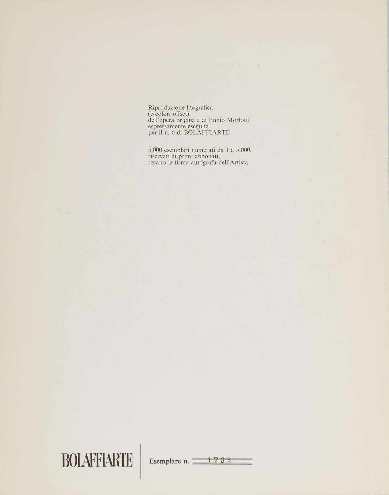 Fotolitografie eseguite per i numeri di BolaffiArte (11): Mauro Reggiani. Numero 0. 2937/5000. Firma in basso a destra; Emilio Scanavino. Numero 1. 2886/5000; Piero Dorazio. Numero 2. 3234/5000. Firma e anno in basso a destra. 1970; Franco Gentilini. Numero 3. 3129/5000. Firma e anno in basso a destra. 1970; Emilio Vedova. Studio per plurimo. (numero 4). 2520/5000. Firma in basso a destra; Luigi Veronesi. Numero 5. 3057/5000. Firma e anno in basso a destra. 1970; Ennio Morlotti. Numero 6. 1735/5000. Firma in basso a destra; Enrico Baj. Numero 7. 1881/5000. Tiratura e firma in basso; Henry Moore. Numero 8. 1892/5000. Firma e anno in basso a destra. 1971; Valerio Adami. Numero 9. 2799/5000. Firma in basso al centro; Arnaldo Pomodoro. Numero 10. 1085/5000. Firma e anno in basso a matita. 1971; Emilio Scanavino. Numero 50. 1416/5000. Firma in basso a destra.