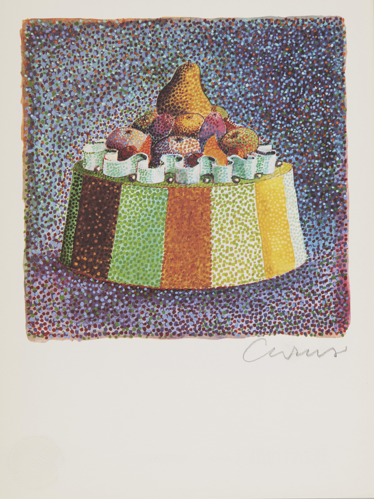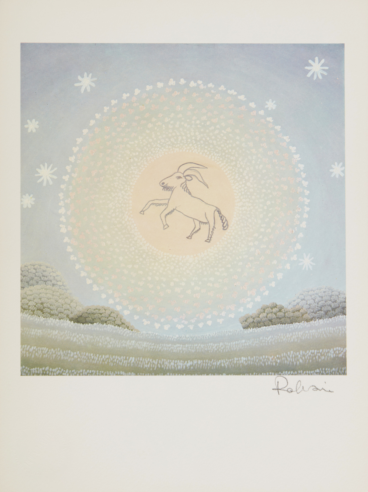 Per la serie "Lo zodiaco" (12): Giò Pomodoro. Il sagittario (il carro e la freccia). 195/5000. Firma in basso a destra; Fabrizio Clerici. L'ariete. 3106/5000. Firma in basso a destra; Mario Radice. Il toro. 288/5000. Firma al retro; Renzo Vespignani. I gemelli. 1917/5000. Firma e anno in basso a destra. 1975; Alicia Penalba, Il cancro. 1037/5000. Firma in basso a destra; Andy Warhol. Il leone. 1199/5000. Firma in basso a destra; Mimmo Rotella, La vergine. 2928/5000. Firma in basso a destra; Wolf Vostell. La bilancia. 853/5000. Firma in basso a destra; Daniel Spoerri. Lo scorpione. 1391/5000. Firma in basso a destra; Ivan Rabuzin. Il capricorno. 2536/5000. Firma in basso a destra; Michelangelo Pistoletto. L'acquario. 407/5000. Firma in basso a sinistra; Eliseo Mattiacci. I pesci. 1156/5000. Firma in basso a destra