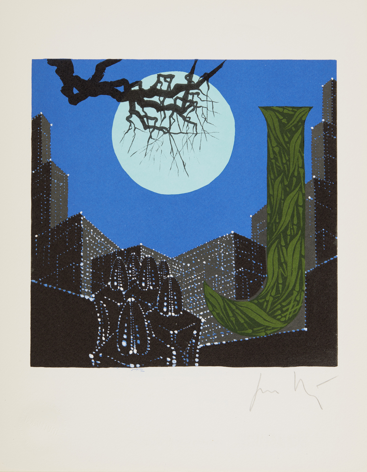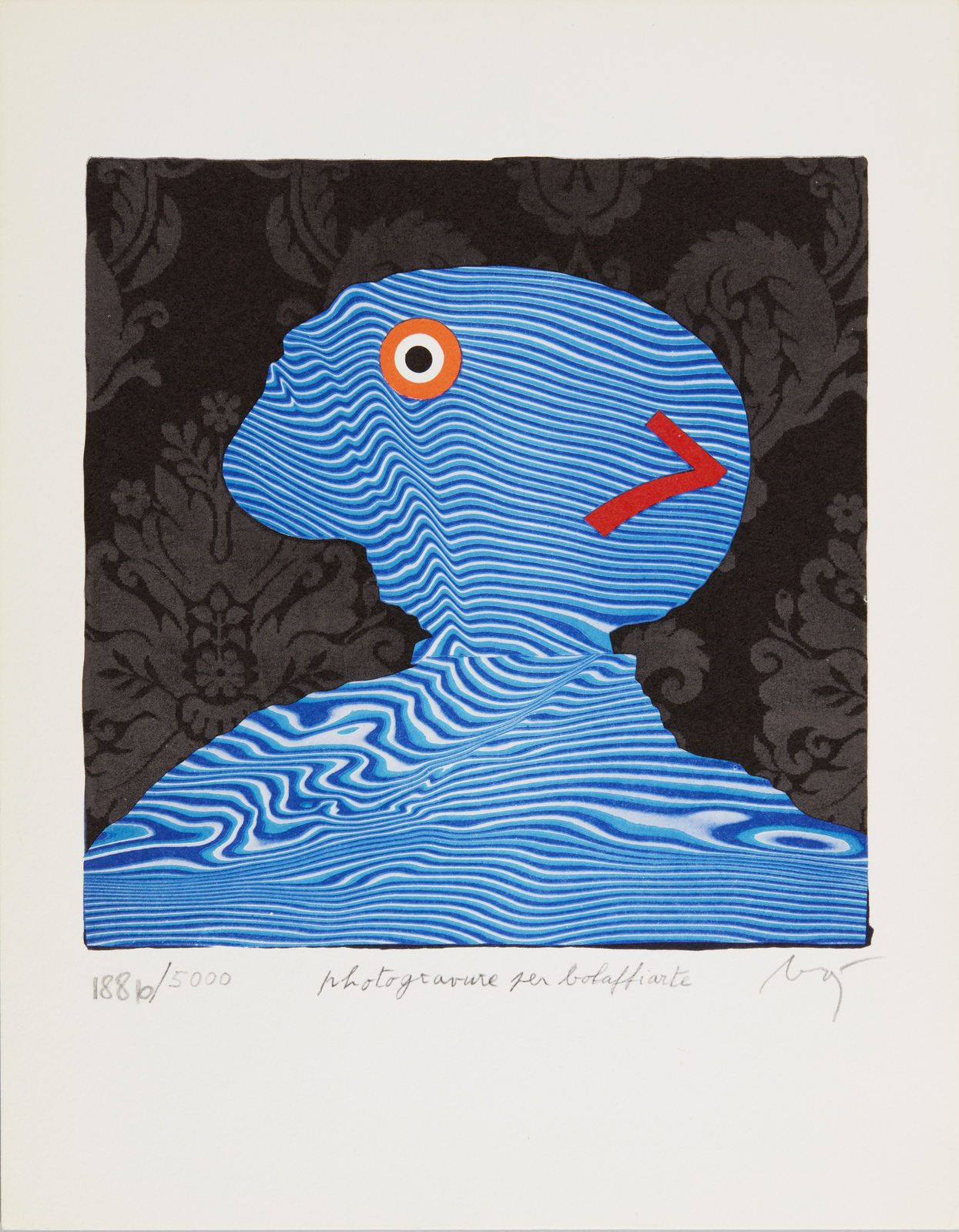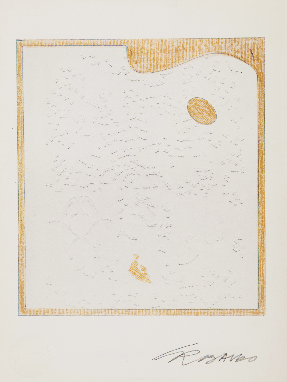 Per la serie “L’alfabeto” (24): Lucio Del Pezzo. A. 4749/5000. Firma in basso a destra; Mario Ceroli. B. 3745/5000. Firma e anno in basso a destra. 1971; Roberto Crippa. C. 1210/5000. Firma in basso a destra; Gianni Dova. D. 3740/5000. Firma in basso a destra; Andrea Cascella. E. 950/5000. Firma in basso a destra; Jean Michel Folon. F. 2057/5000. Firma in basso a destra; Salvador Dalì. G. 1670/5000. Firma e anno in basso a destra. 1972; Giuseppe Santomaso. H. 1531/5000. Firma in basso a destra; Fausto Melotti. I. 1096/5000. Firma in basso a destra; Cesare Peverelli. J. 862/5000. Firma in basso a destra; Salvatore Fiume. K. 314/5000. Firma in basso a destra; Pietro Consagra. L. 3512/5000. Firma in basso a destra; Max Bill. N. 550/5000. Firma in basso a destra; Giorgio De Chirico. O. 980/5000. Firma in basso a destra; Corrado Cagli. P. 545/5000. Firma in basso a destra; César. Q. 1290/5000. Firma in basso a destra; Man Ray. R. 1432/5000. Firma al centro; Graham Sutherland. S. 2553/5000. Firma in basso a sinistra; Giacomo Manzù. T. 3593/5000. Firma in basso a destra; Giuseppe Guerreschi. U. 3195/5000. Firma in basso a destra; Valerio Trubbiani. V. 2047/5000. Firma in basso a destra; Marino Marini. X. 2601/5000. Firma in basso al centro; Pietro Cascella. Y. 2565/5000. Firma in basso a destra; Calder. Z. 850/5000. Firma in basso a destra. Le lettere M e W risultano mancanti.