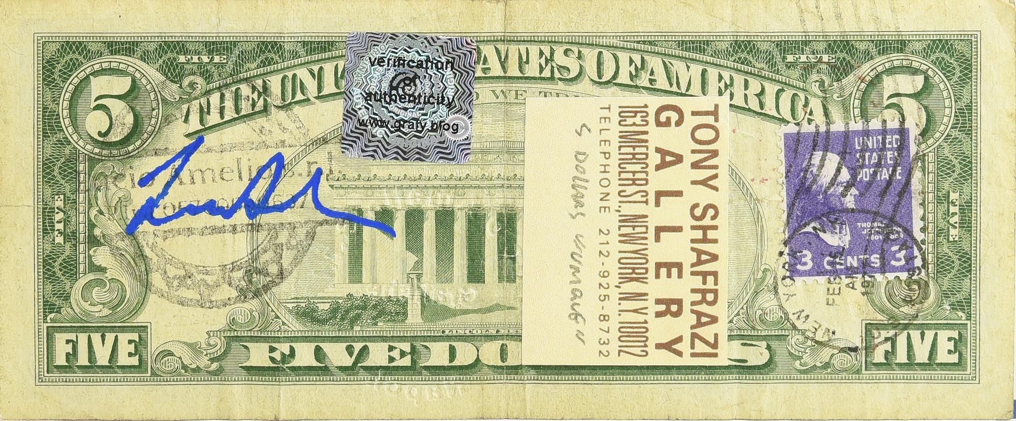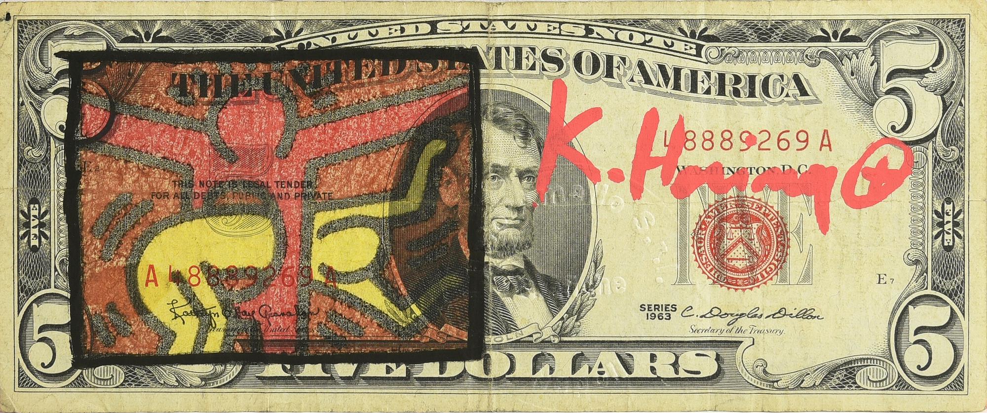 Lot 129 | Keith Haring (1958 - 1990) FIVE DOLLARS intervento su banconota, cm 6,6x15,6...