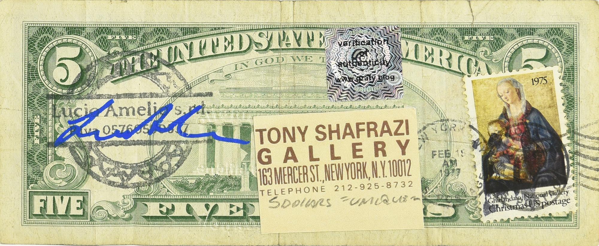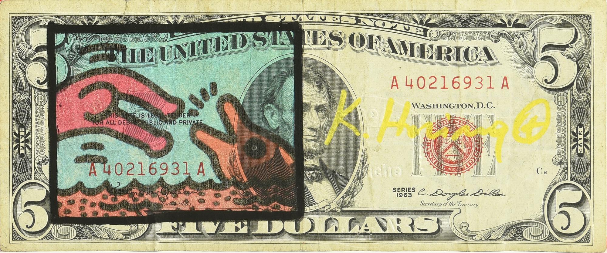 Keith Haring (1958 - 1990) FIVE DOLLARS intervento su banconota, cm 6,6x15,6...
