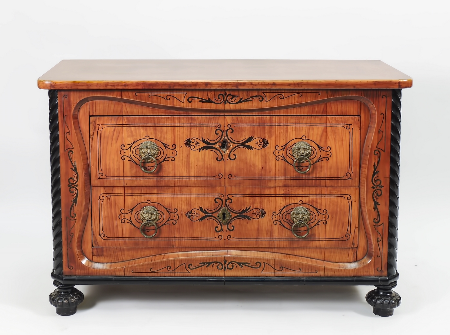 PICCOLO CASSETTONE IN CILIEGIO - SMALL CHERRYWOOD CHEST OF DRAWERS seconda metà del XIX secolo - mid 19th Century fronte a due cassetti dipinti a finto intarsio con filettature a volute, maniglie in metallo dorato a foggia di teste leonine, cornice in legno ebanizzato a torciglione, piedi a cipolla h cm 72,5x108x49,5