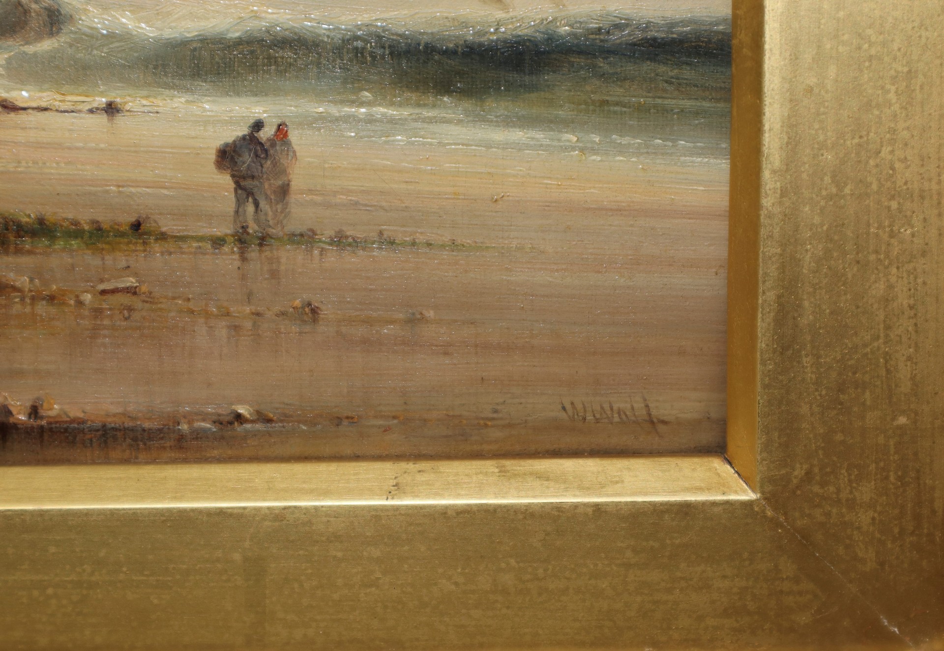 Tempesta con navi in mare, a secco e personaggi, Nineteen° secolo cm 20x41; in cornice cm 41x51olio su telaPittore inglese del XIX secolo , firmato in basso a destra W.Wolf