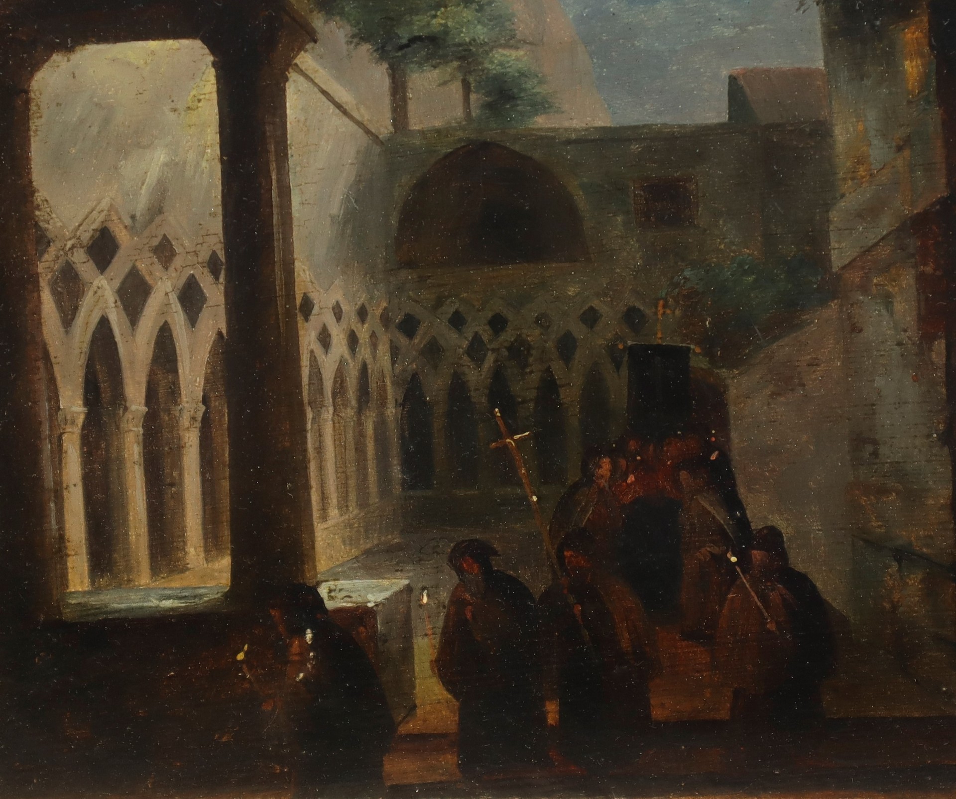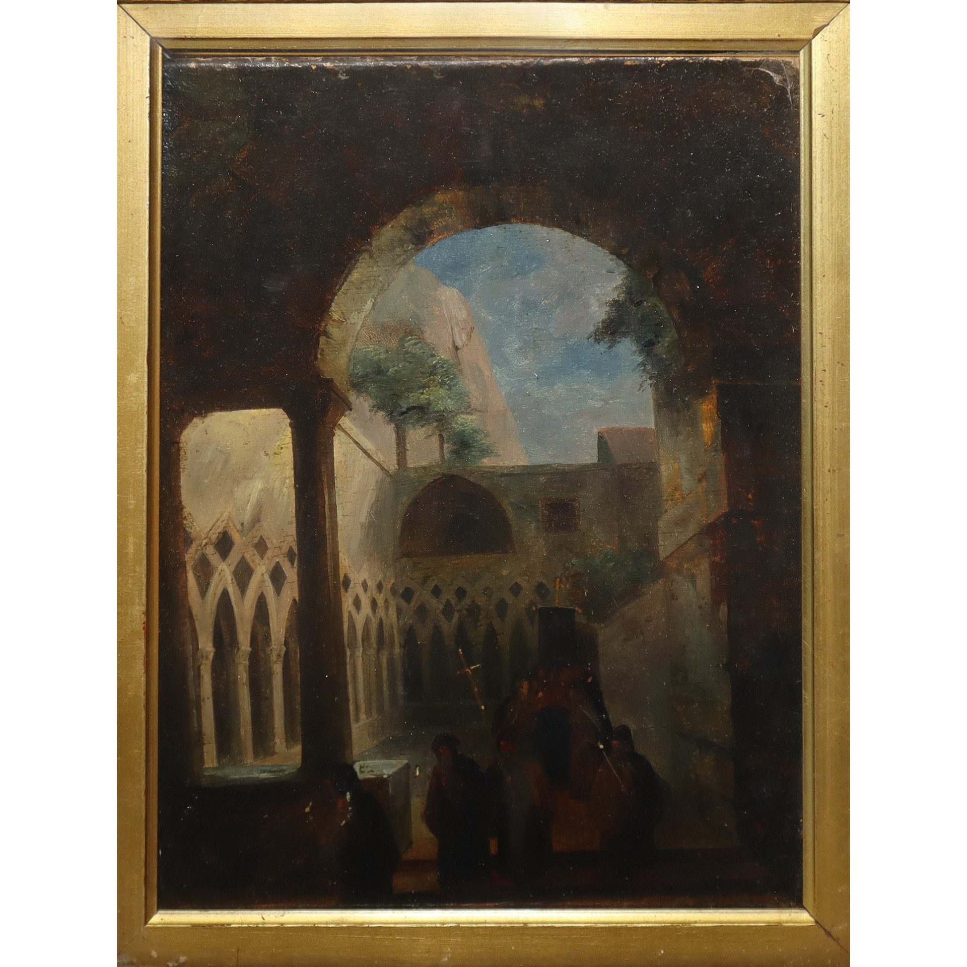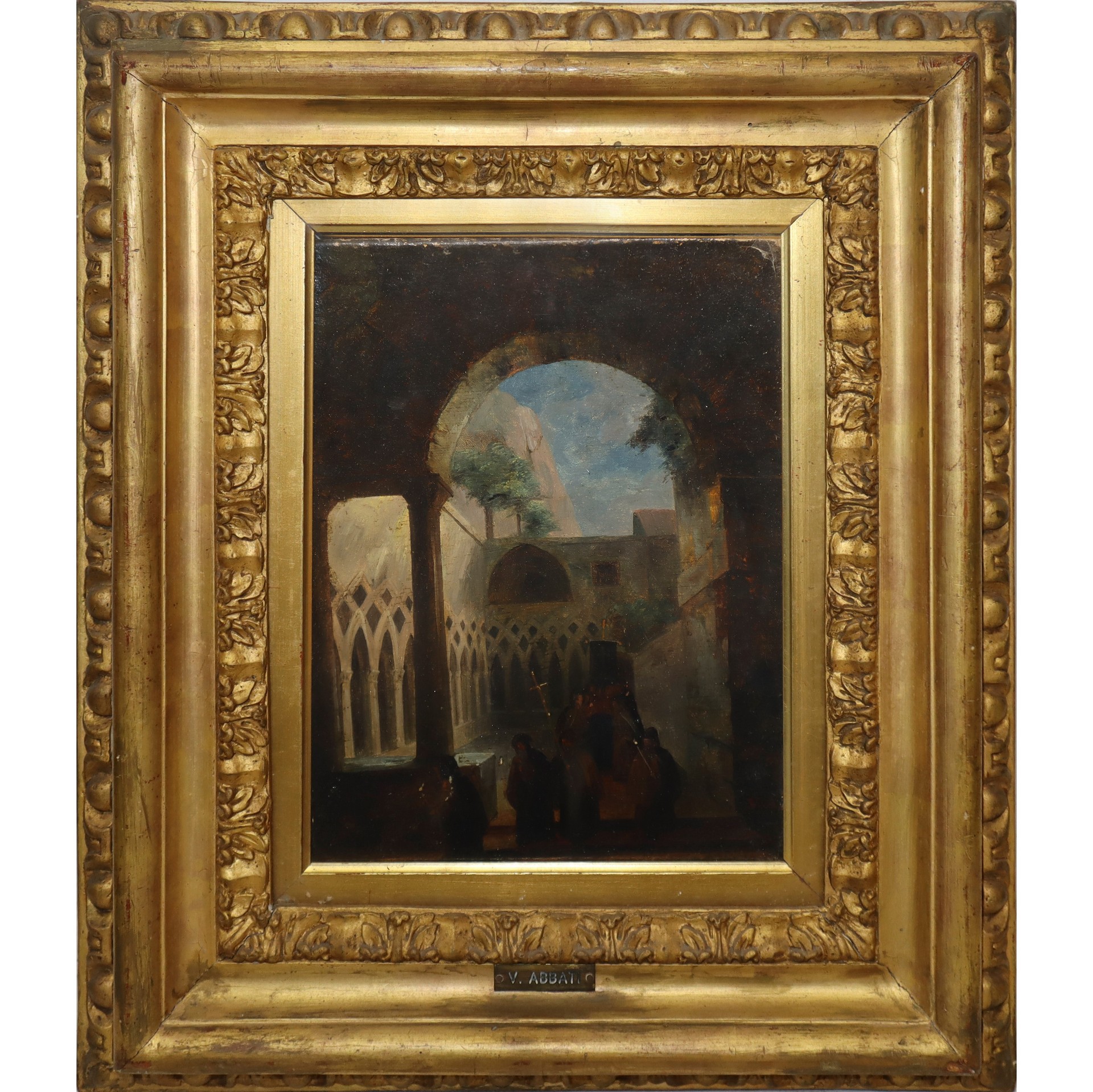 Vincenzo Abbati (Napoli 1803-Firenze 1866) - Chiostro con fratiCm 29x22, in cornice cm 48x40Olio su cartone telato Firmato in basso a destra Vincenzo Abbati 1803 - 1866