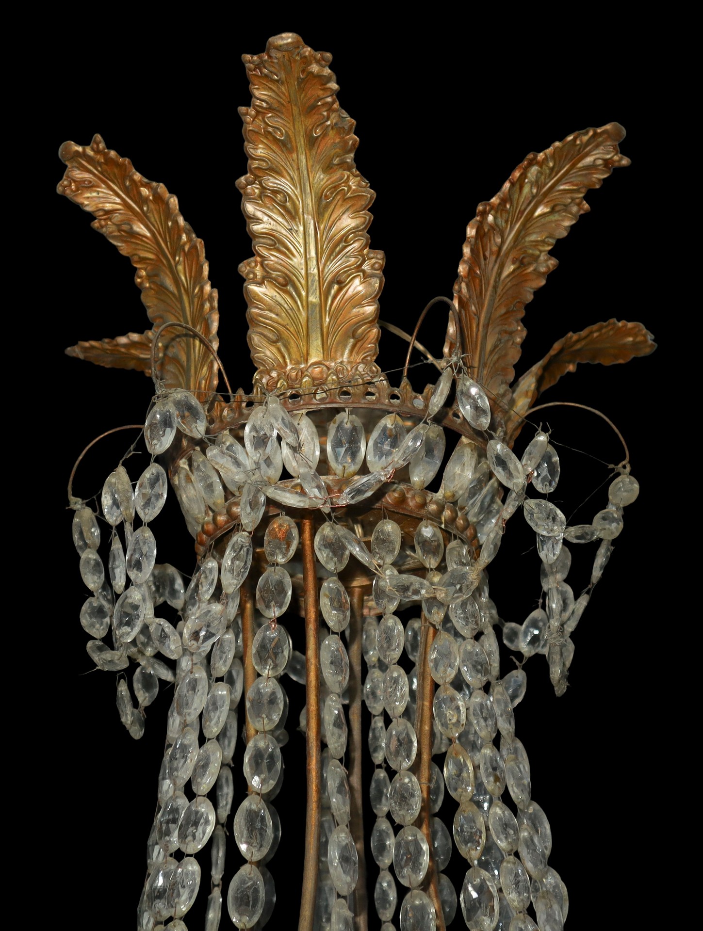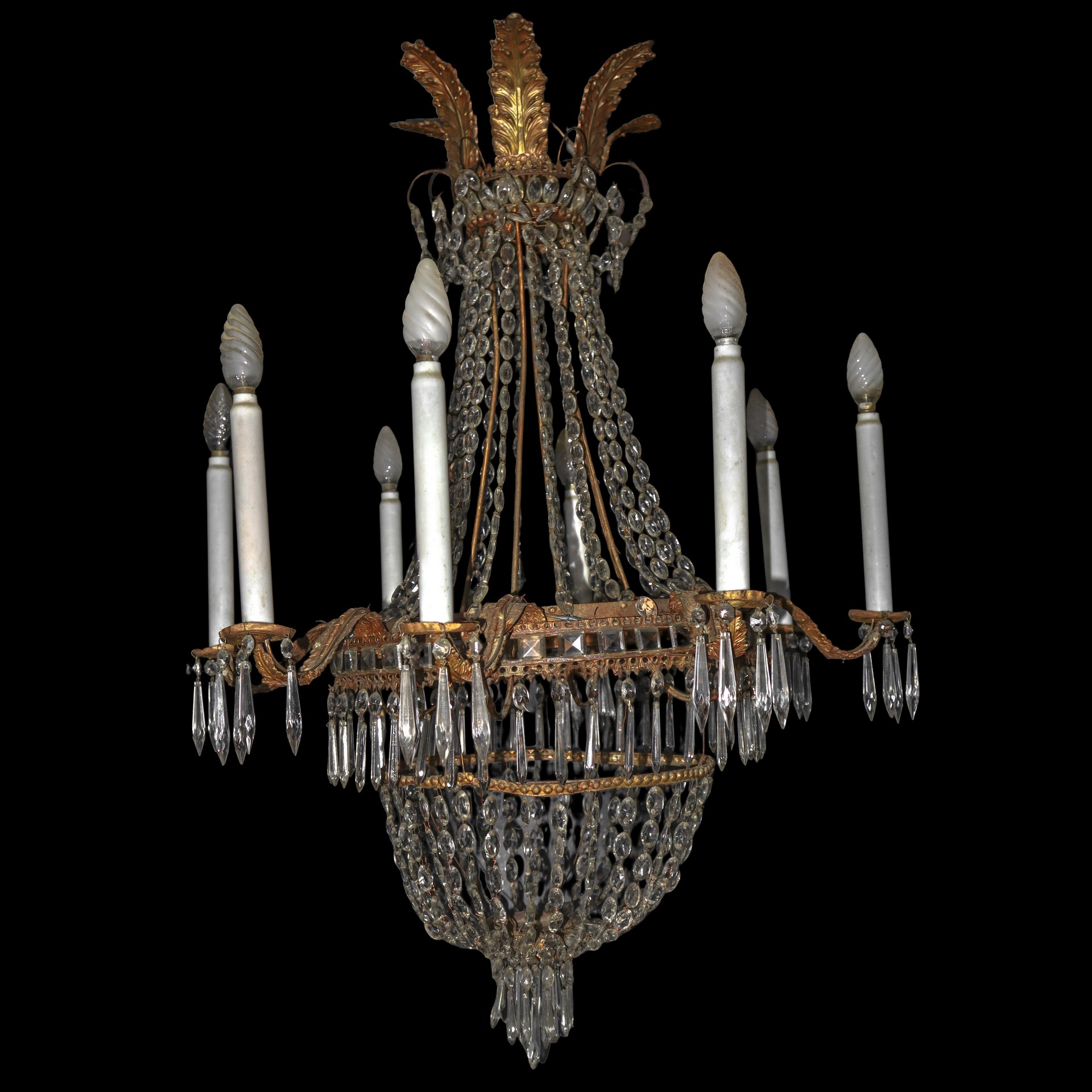 Lampadario a 8 luci a ninfa, in ottone dorato, con foglie e brindoli, 19° secolo