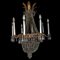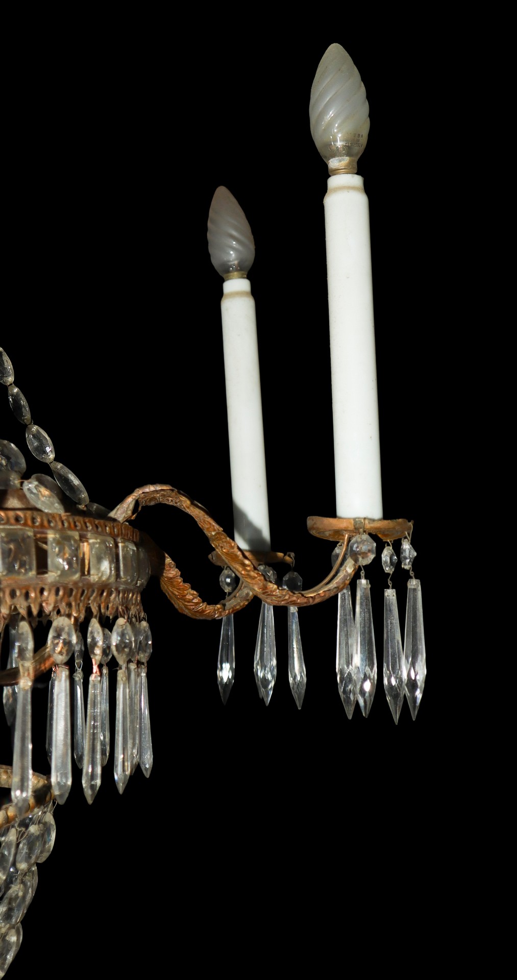 Lampadario a 8 luci a ninfa, in ottone dorato, con foglie e brindoli, 19° secolo H cm 97x72Candele in vetro lattimoCandele in vetro lattimo