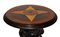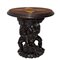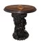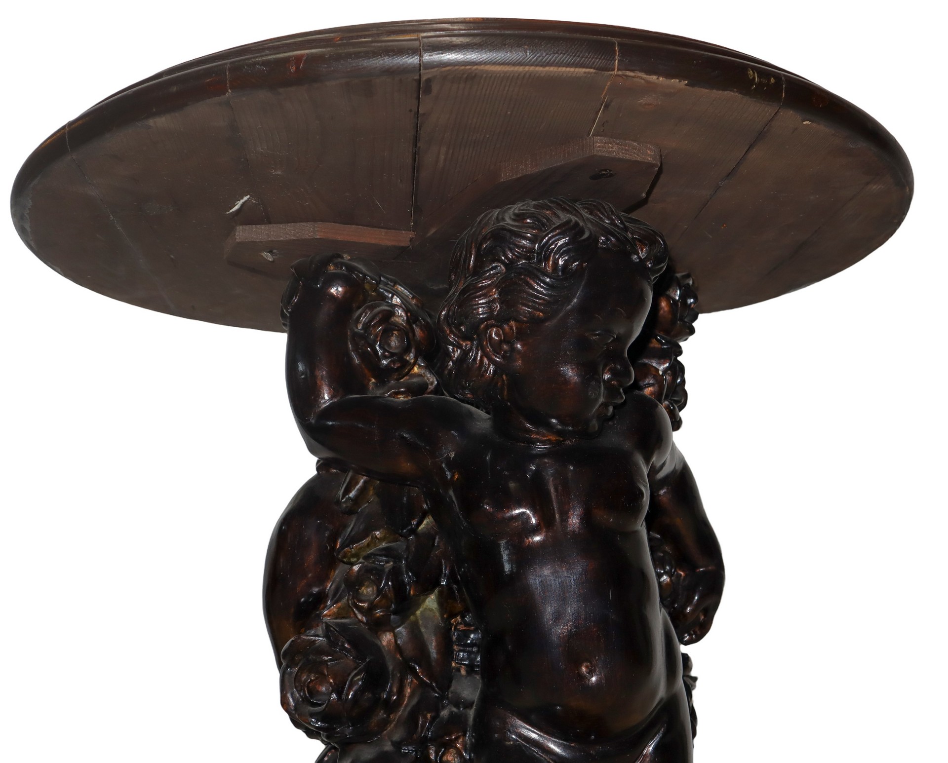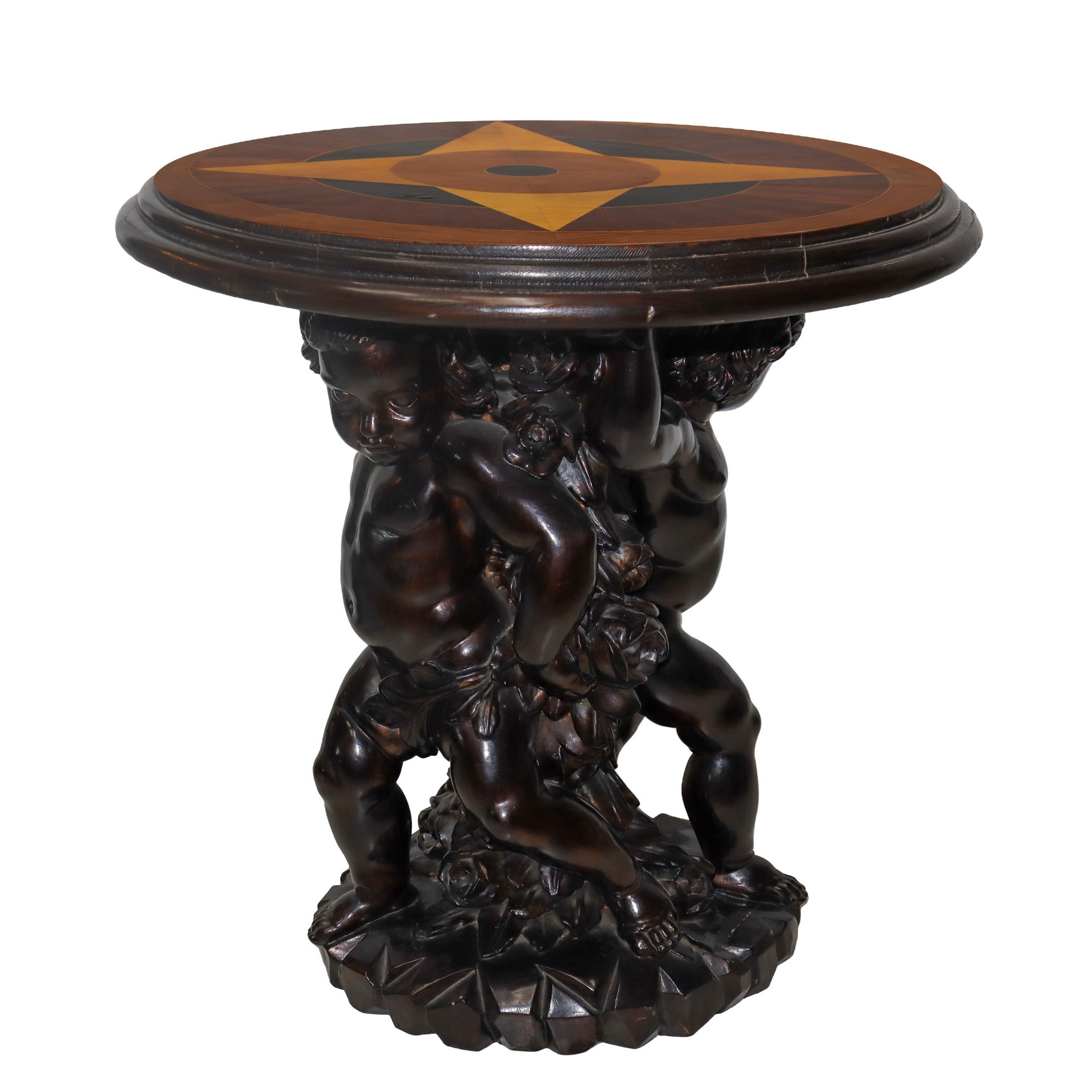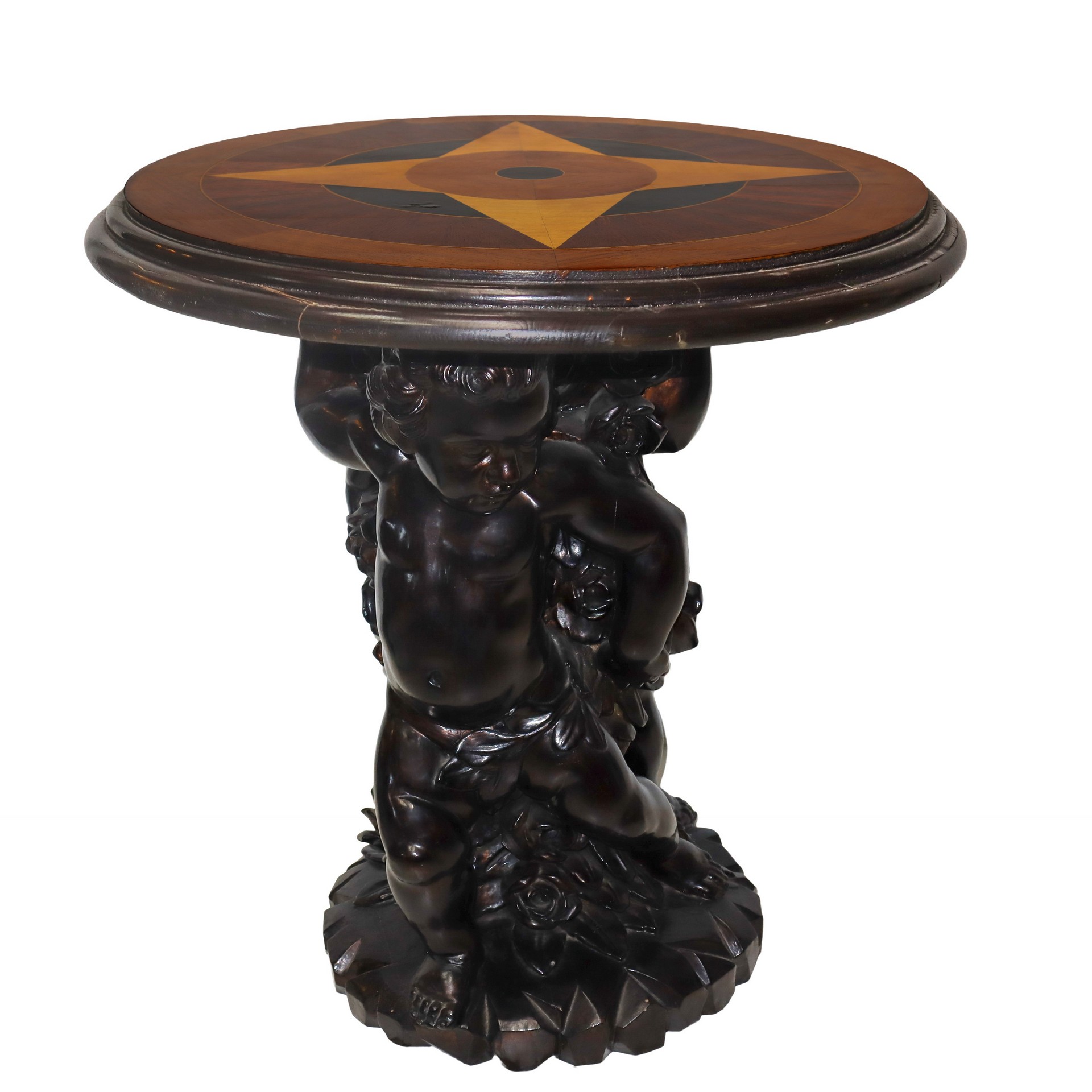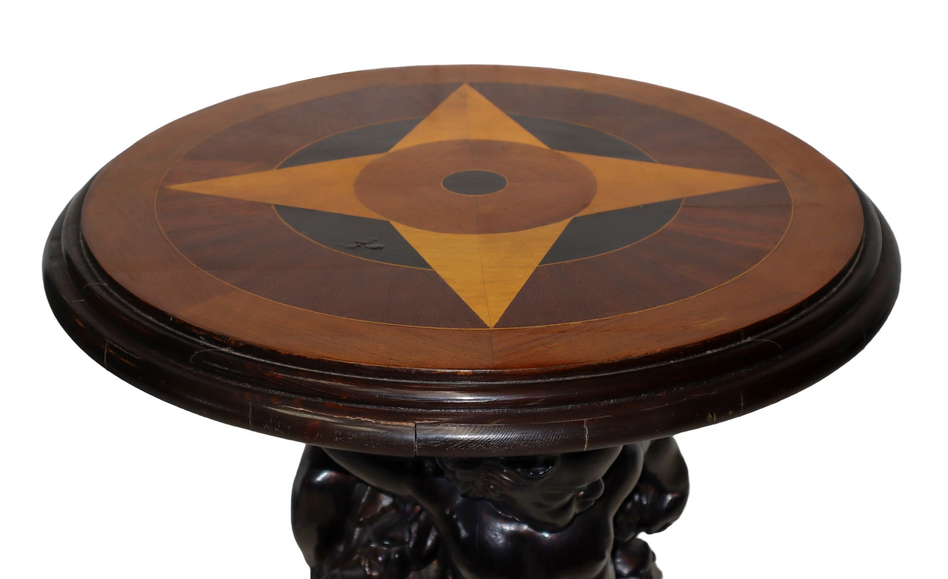 Tavolino in legno con base di sostegno scolpita con due putti, Tardo 19° secolo H cm 63, diametro 55Piano con stella lastronato con legni vari Piano con stella lastronato con legni vari
