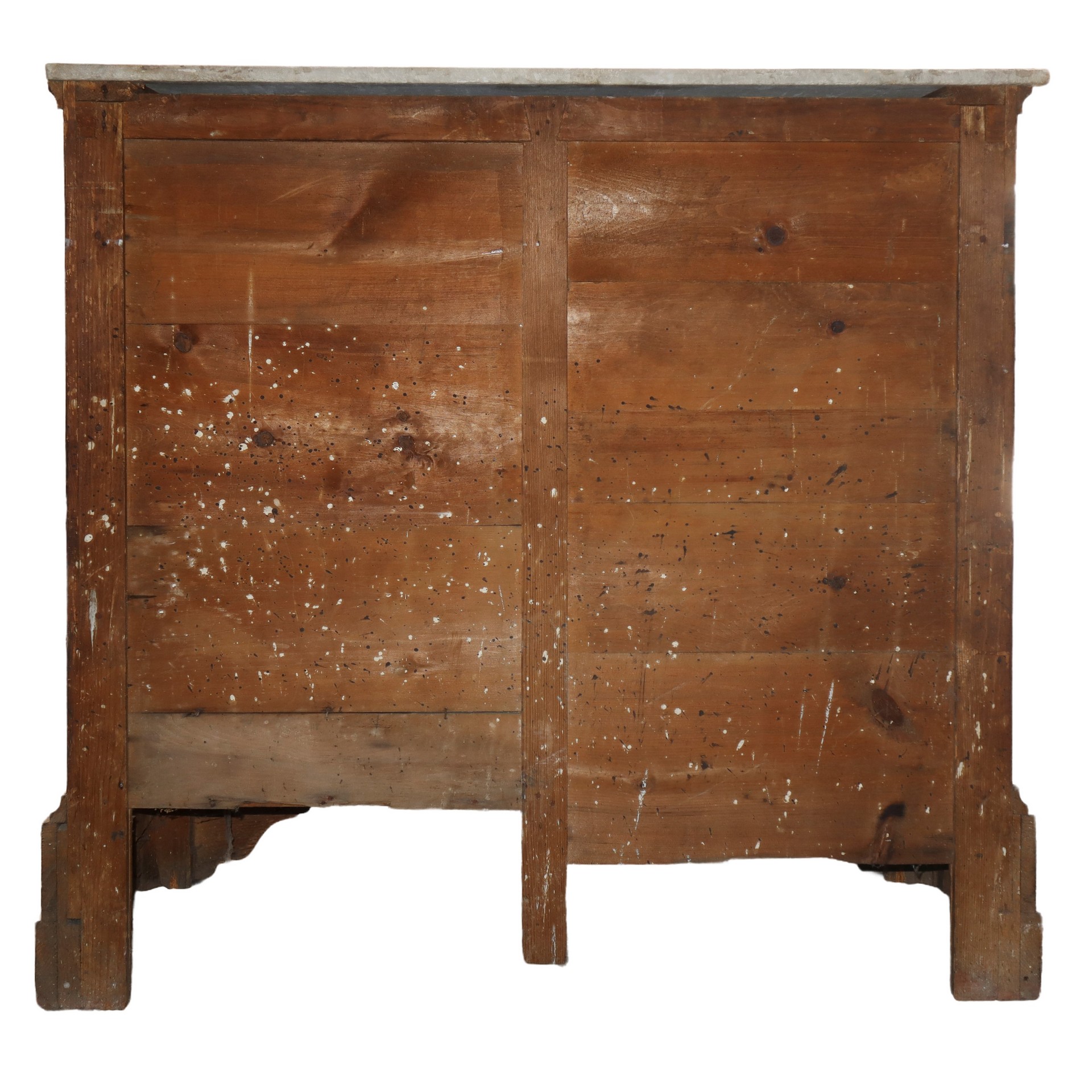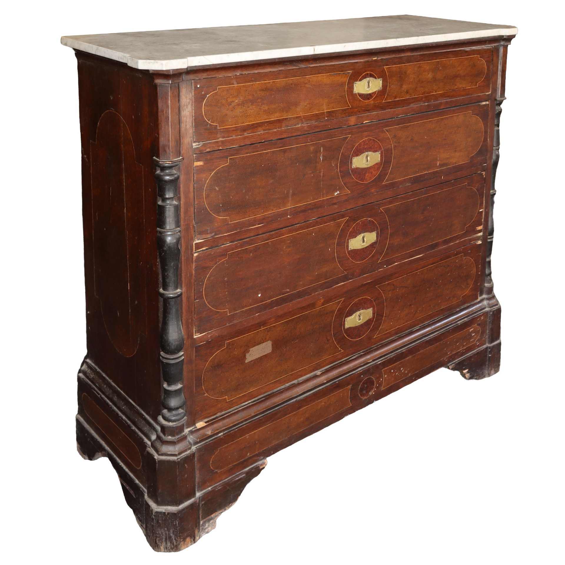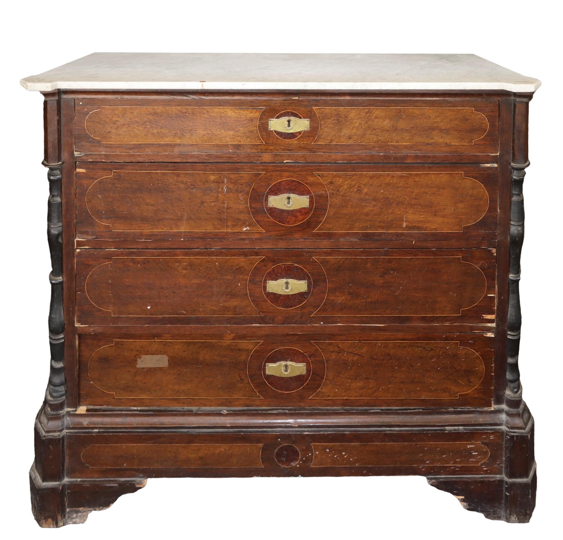 Cassettone con mezze colonne a rocchetto applicate ai lati, nineteen° secolo h 113 x 123 x 48Piedi a mensola, quattro cassetti, marmo bianco al pianoPiedi a mensola, quattro cassetti, marmo bianco al piano