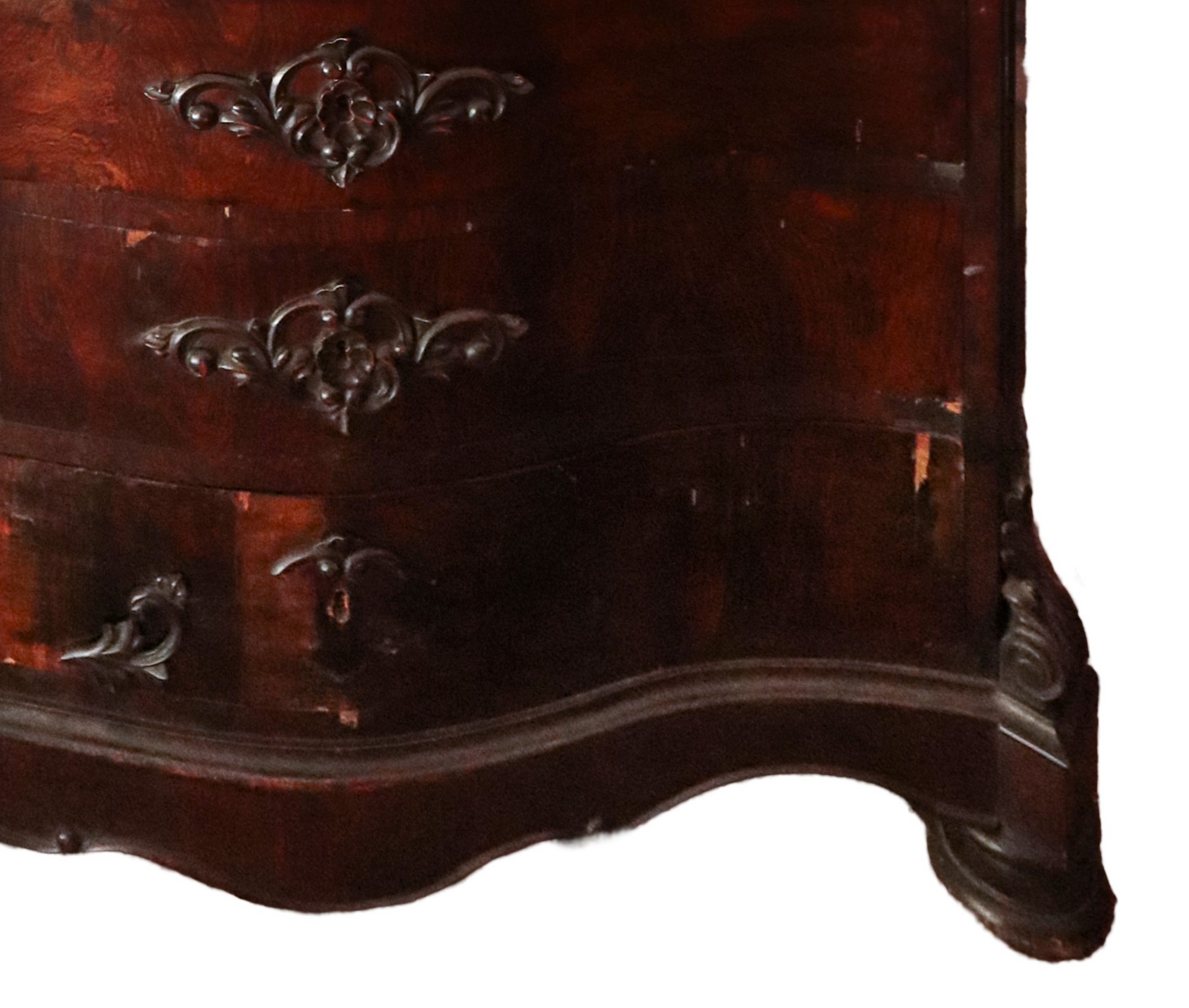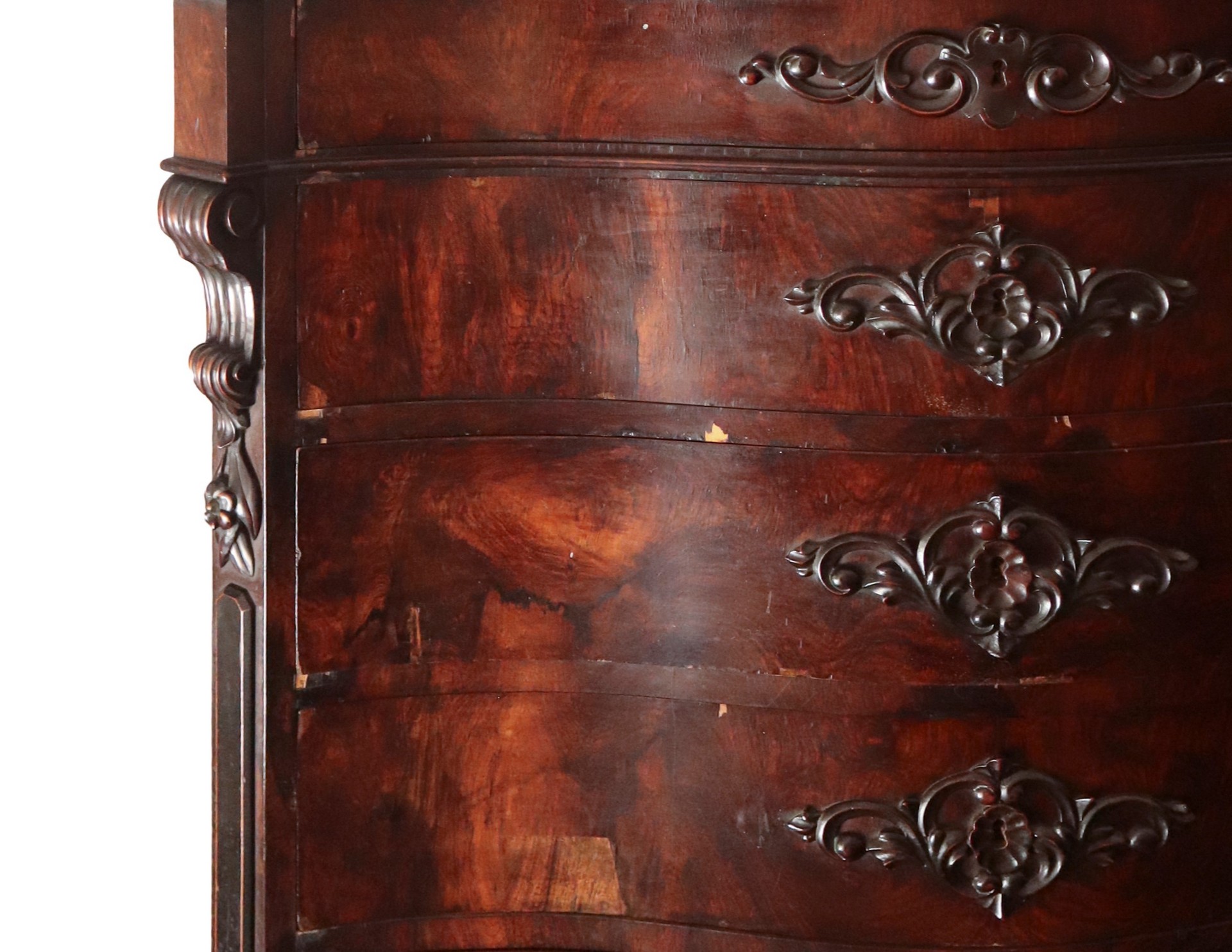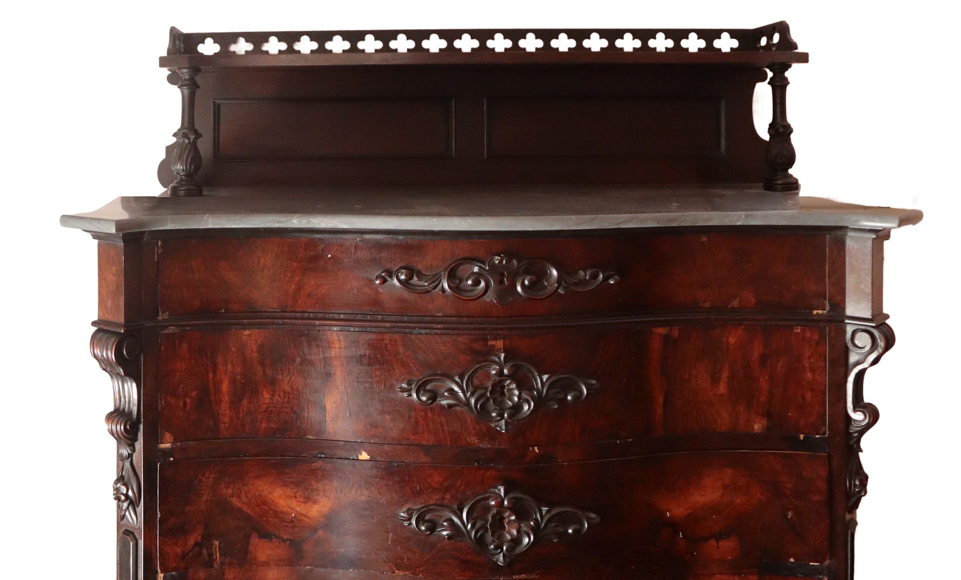 * Mobile settimanile in legno di palissandro con alzatina, Naples, 19° secolo h cm 180 x 125 x 60Marmo al piano intagli applicati al centro dei cassetti e agli angoli Tardorali. Piedi a cipollaMarmo al piano intagli applicati al centro dei cassetti e agli angoli Tardorali. Piedi a cipolla