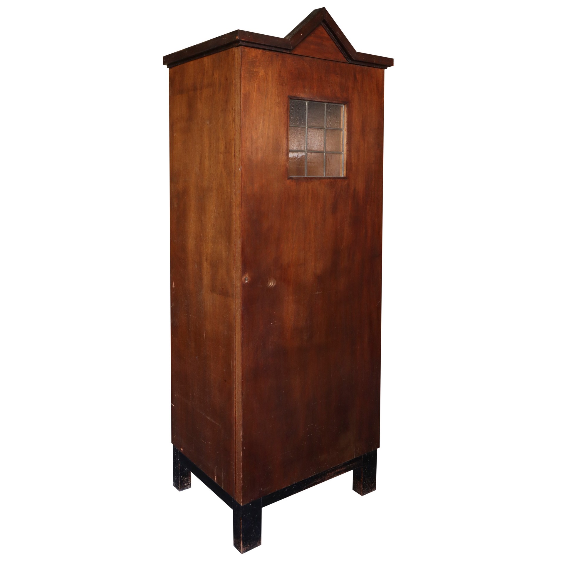 ARMADIO NELLO STILE DECÒ IN LEGNO DI NOCE, 20° secolo cm 195 x cm 75 x cm 56Impiallaciato, interni in legno di rovera, sportello a un'anta con vetri piombati, timpano in testa, piedi rettangolari.