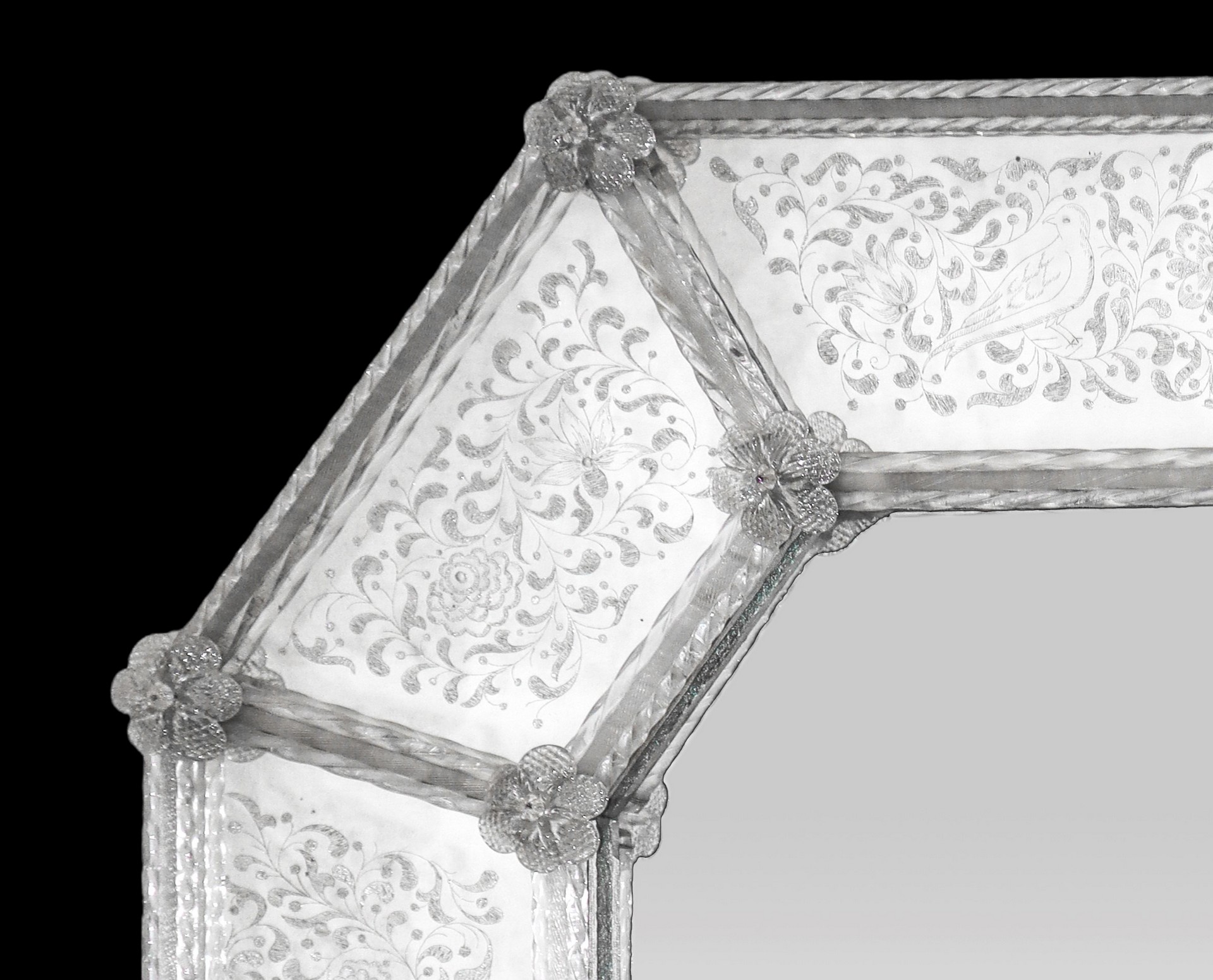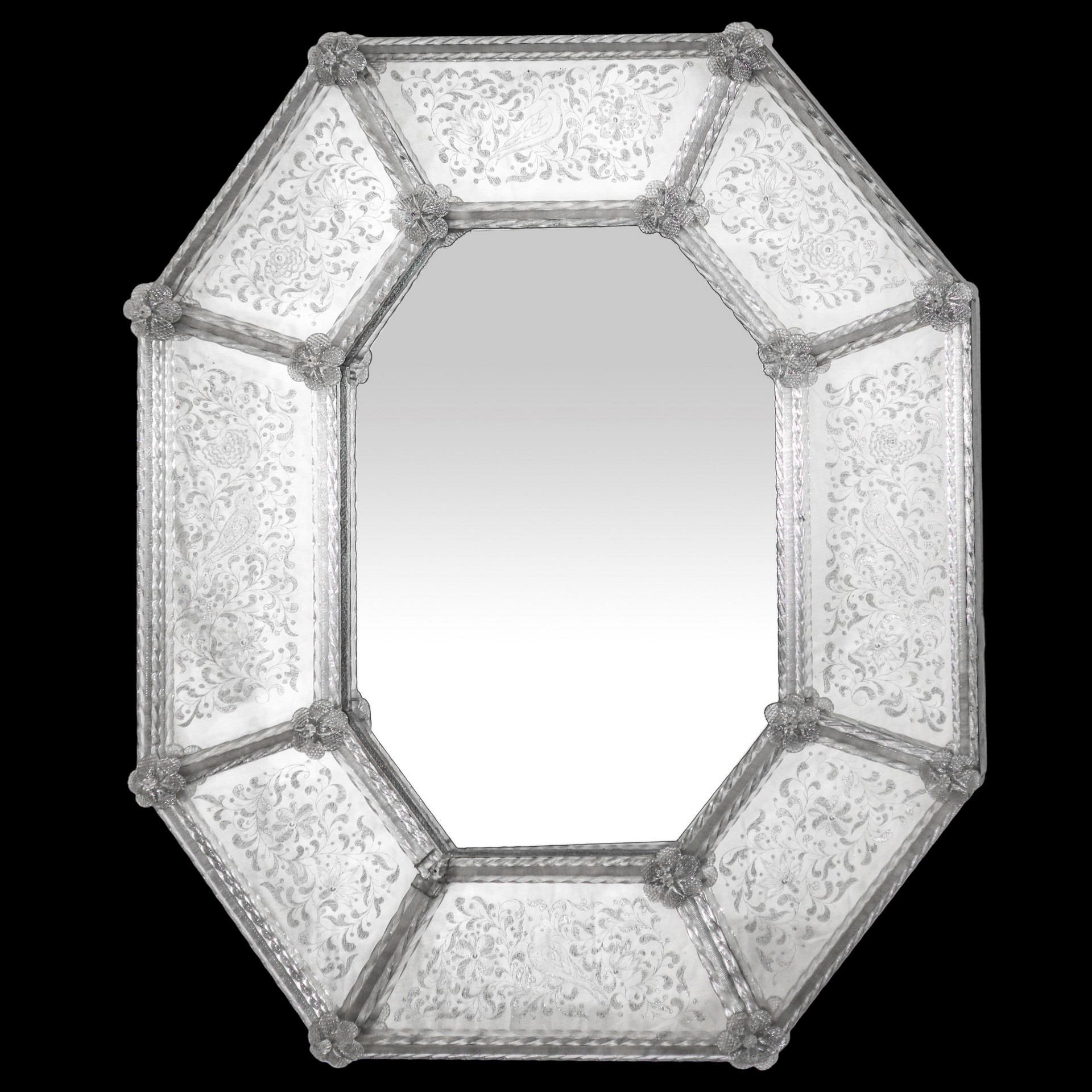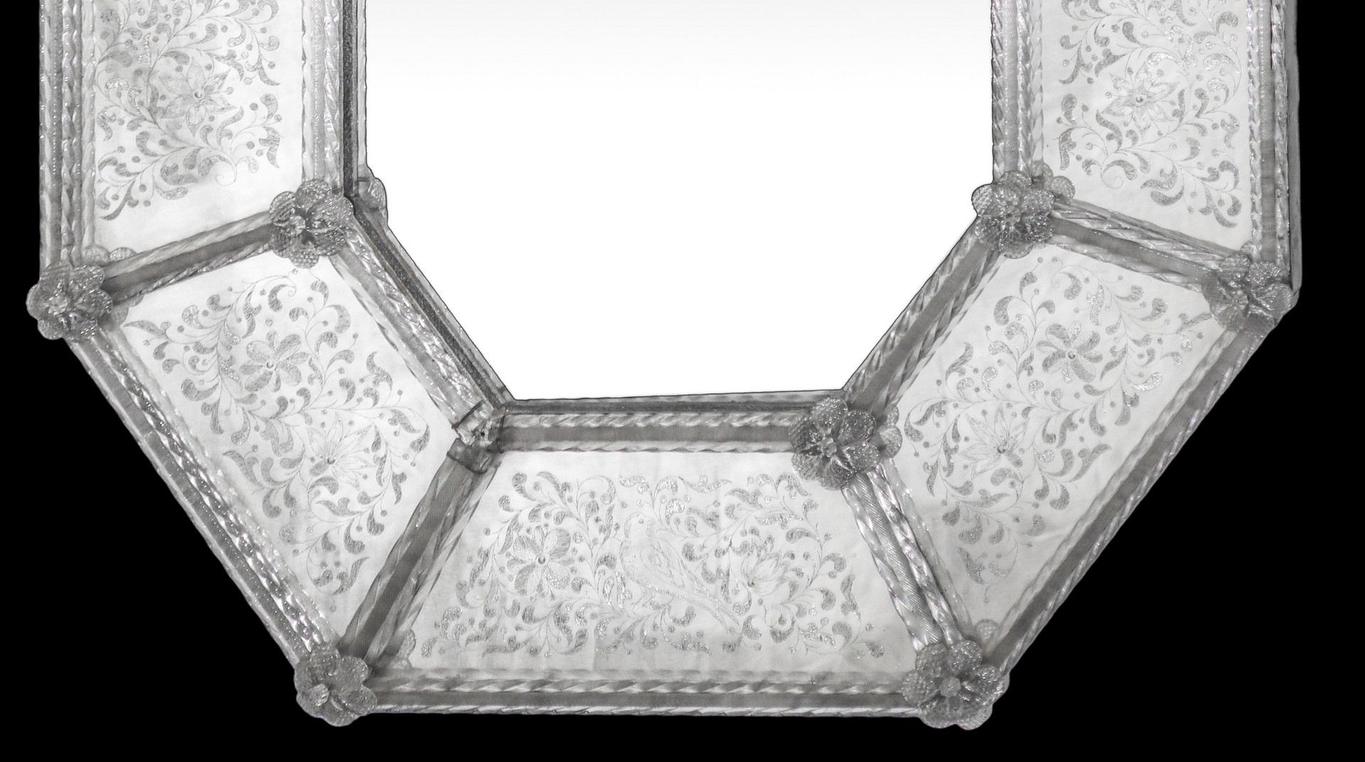 Specchiera in vetro di Murano ottagonale, Primi 20° secolo Cm 78x63,5In vetro molato e bulinato con decorazioni floreali e di uccelliIn vetro molato e bulinato con decorazioni floreali e di uccelli